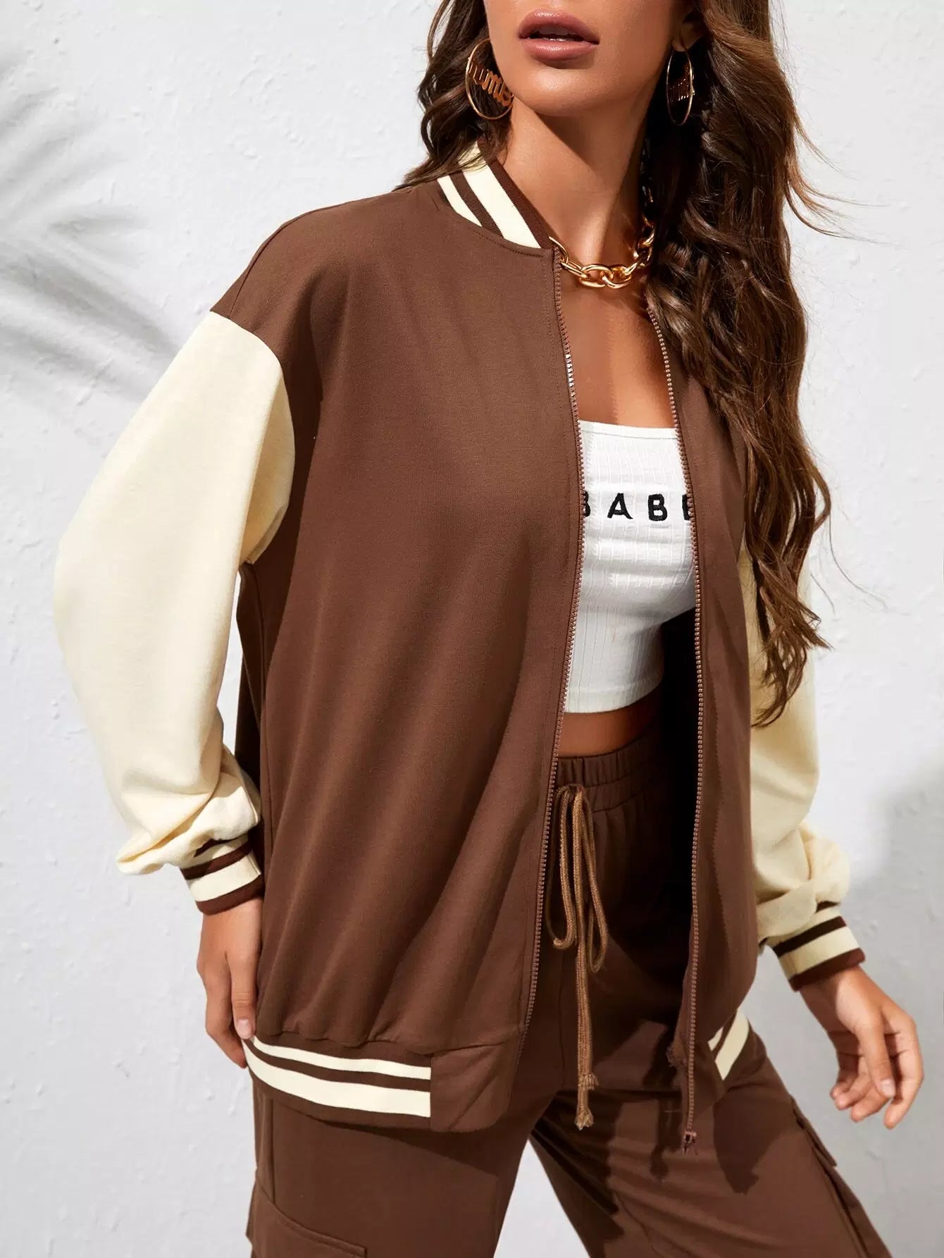 سترة بسحاب أمامي وأكتاف منسدلة وياقة بيسبول متباينة الألوان