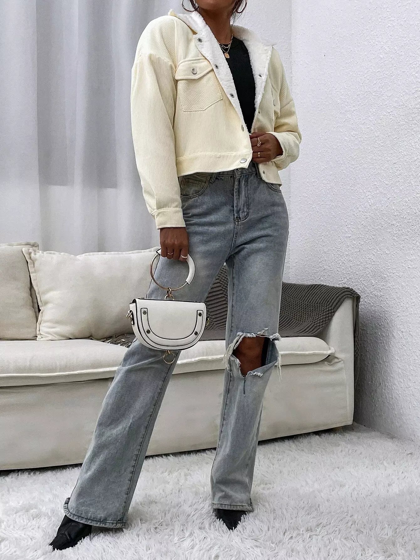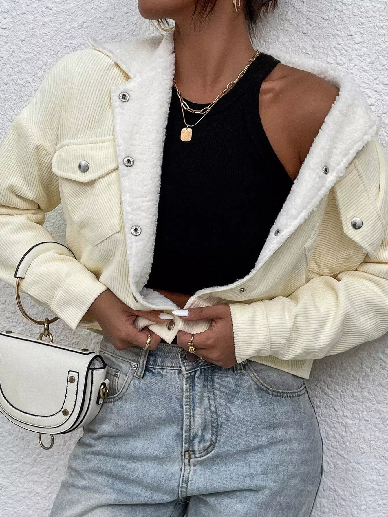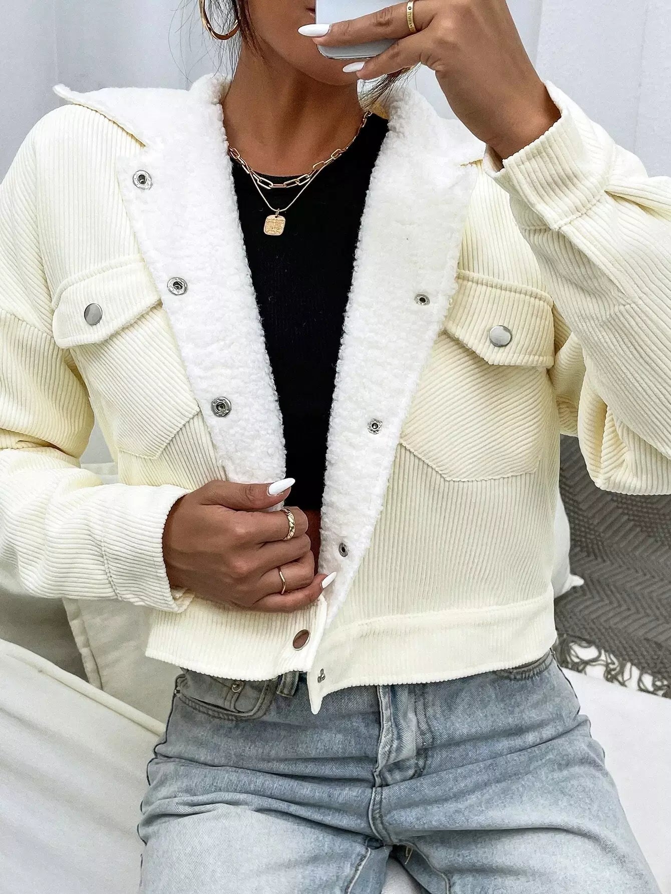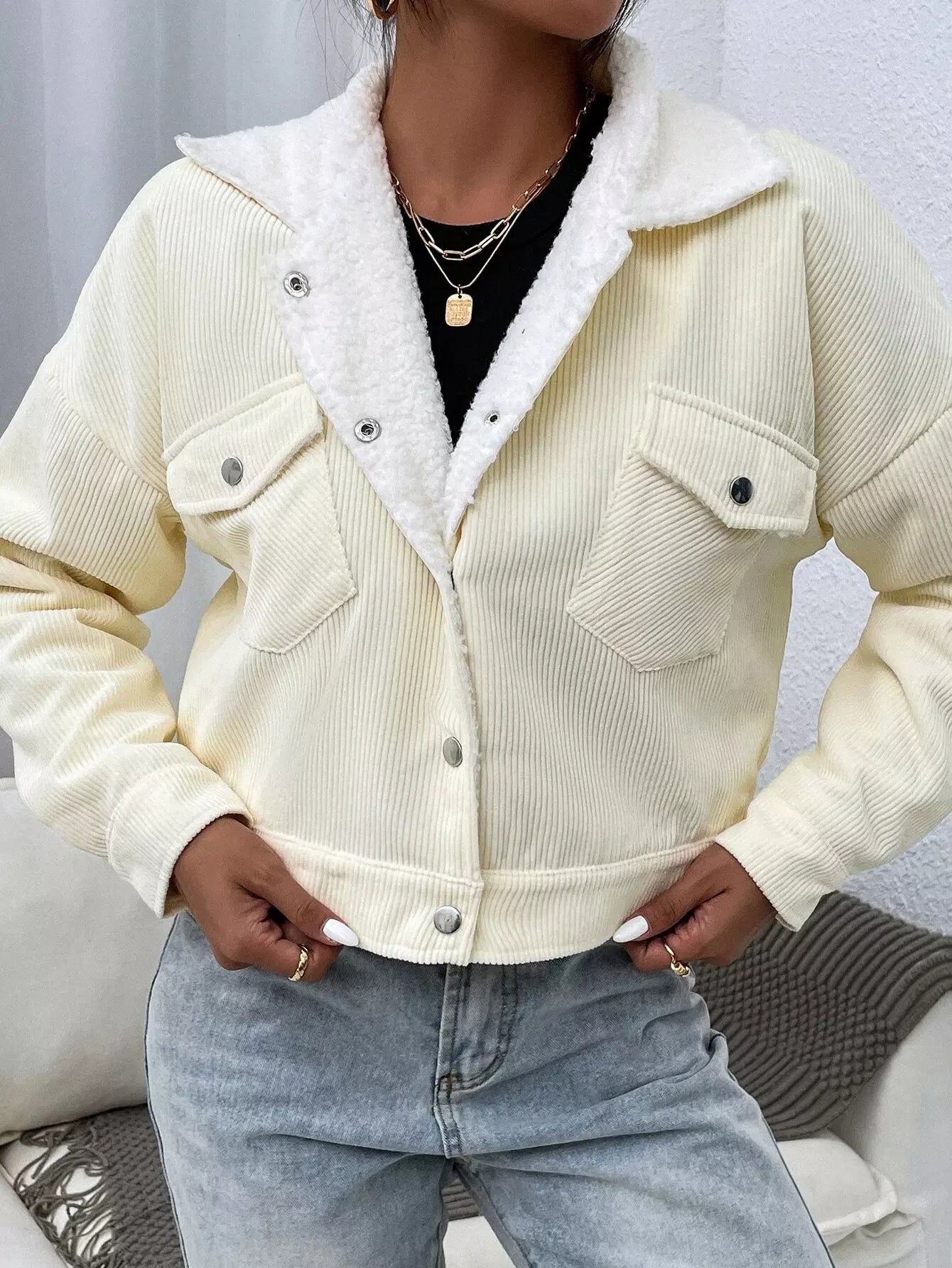 سترة من قماش مخملي مبطنة بقماش تيدي مع جيوب وكتف منسدلة