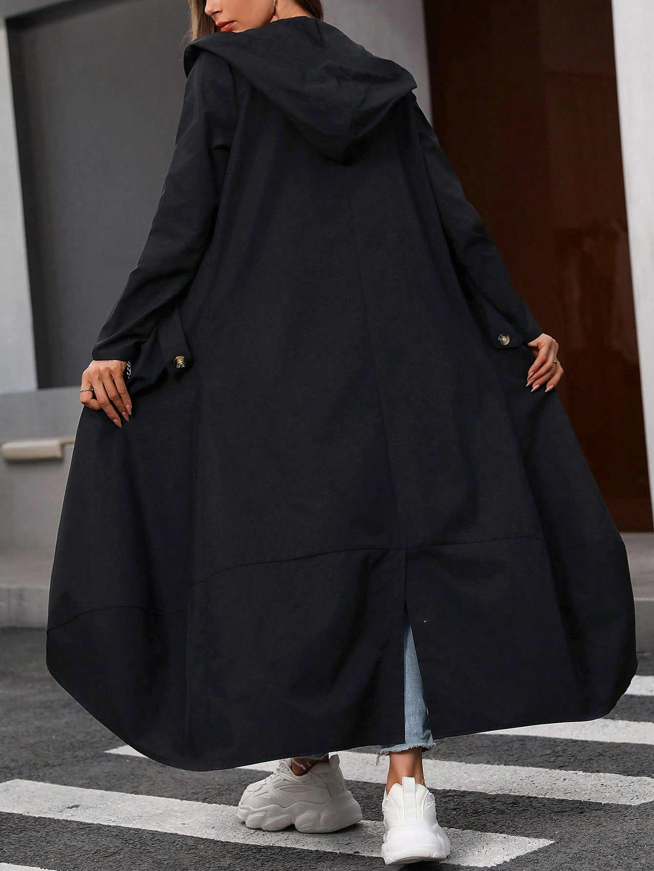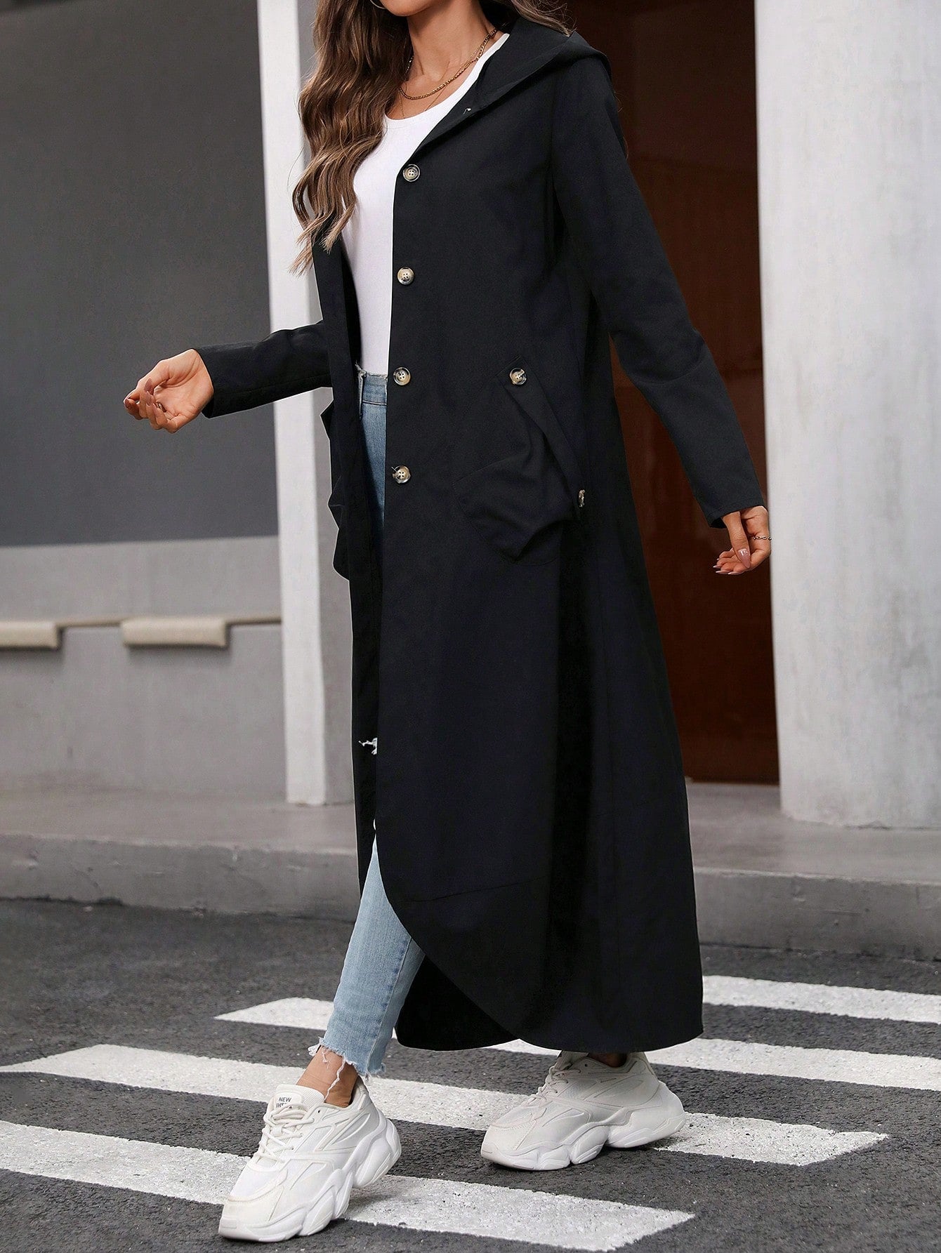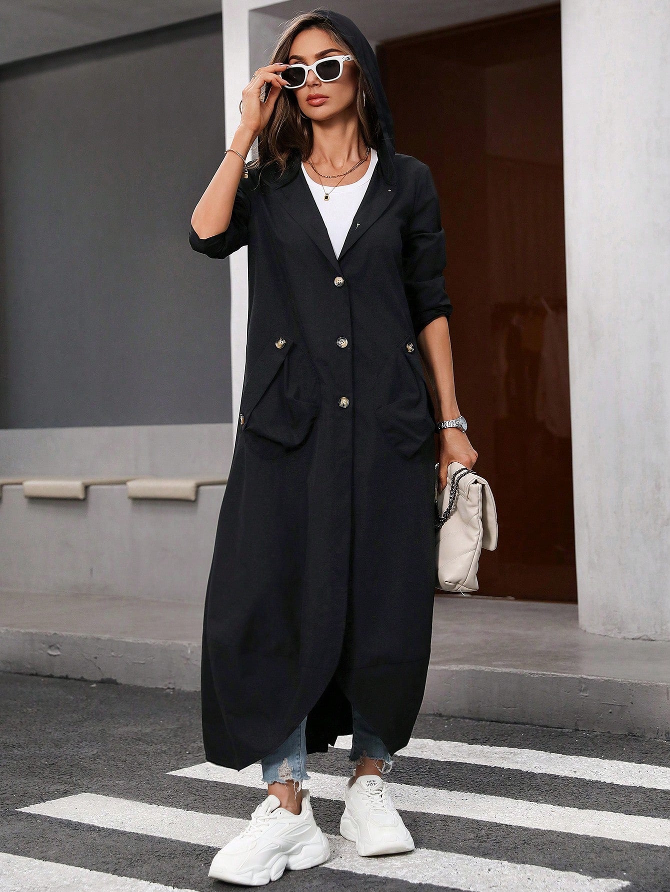 جاكيت نسائي طويل من لون، بصف أزرار واحد، مناسب للارتداء اليومي، مزود بجيوب جانبية