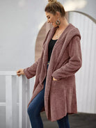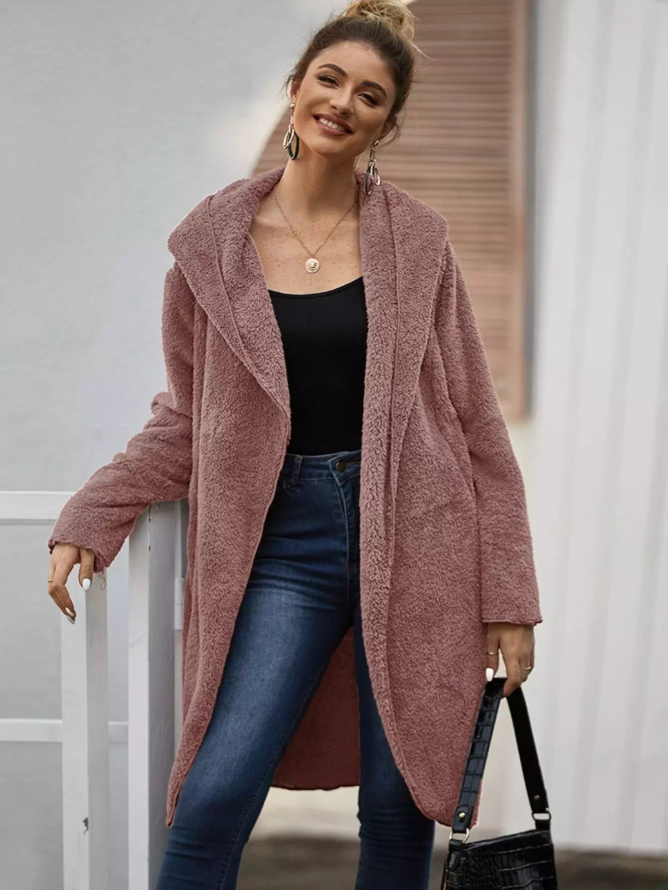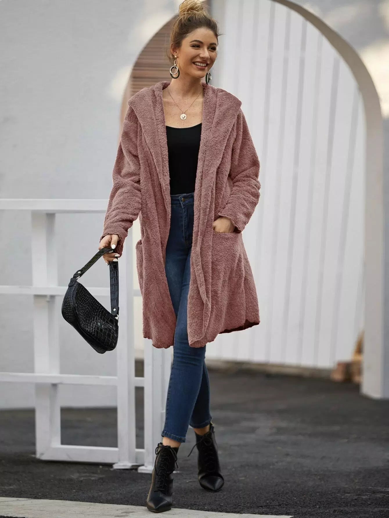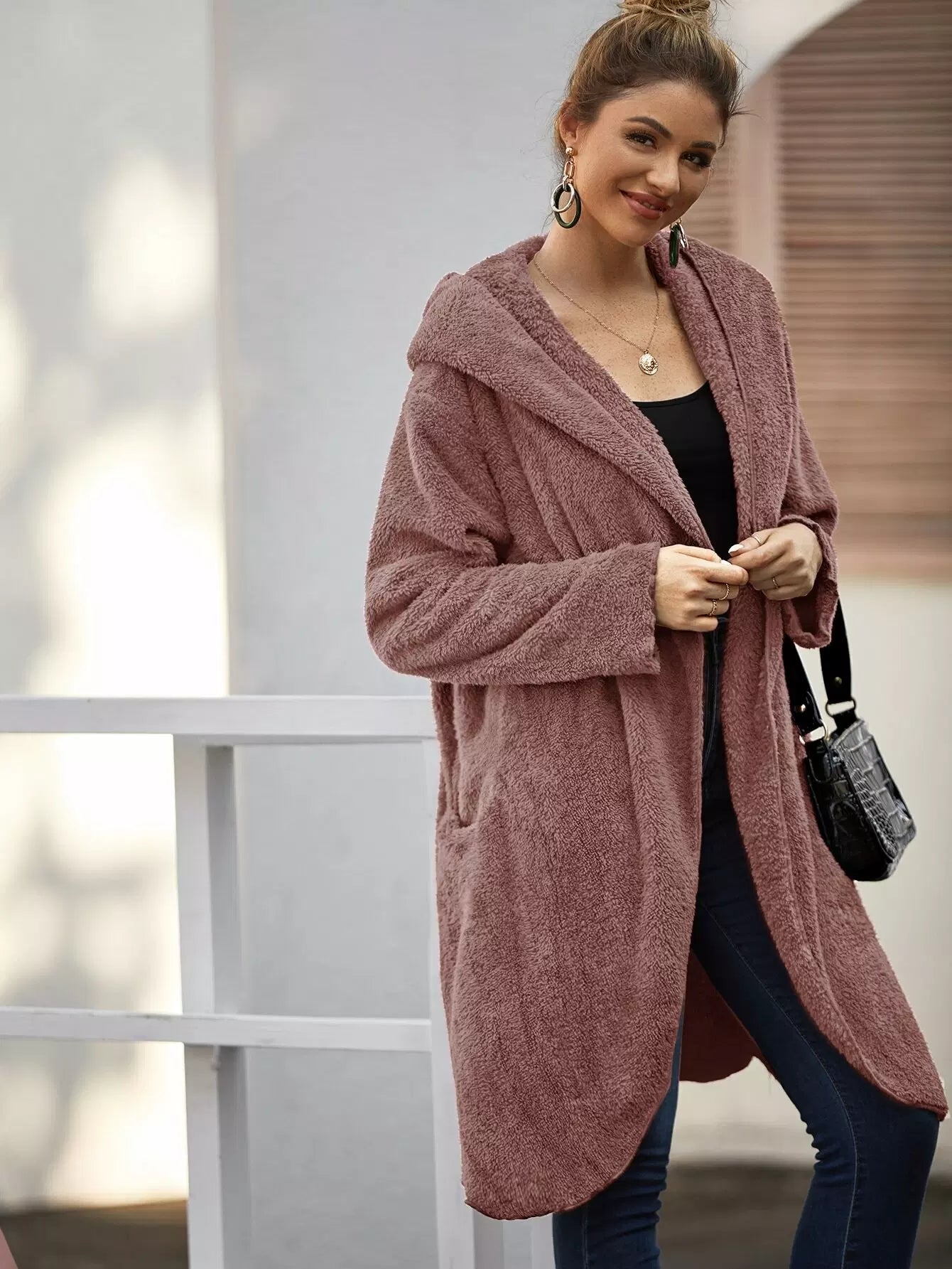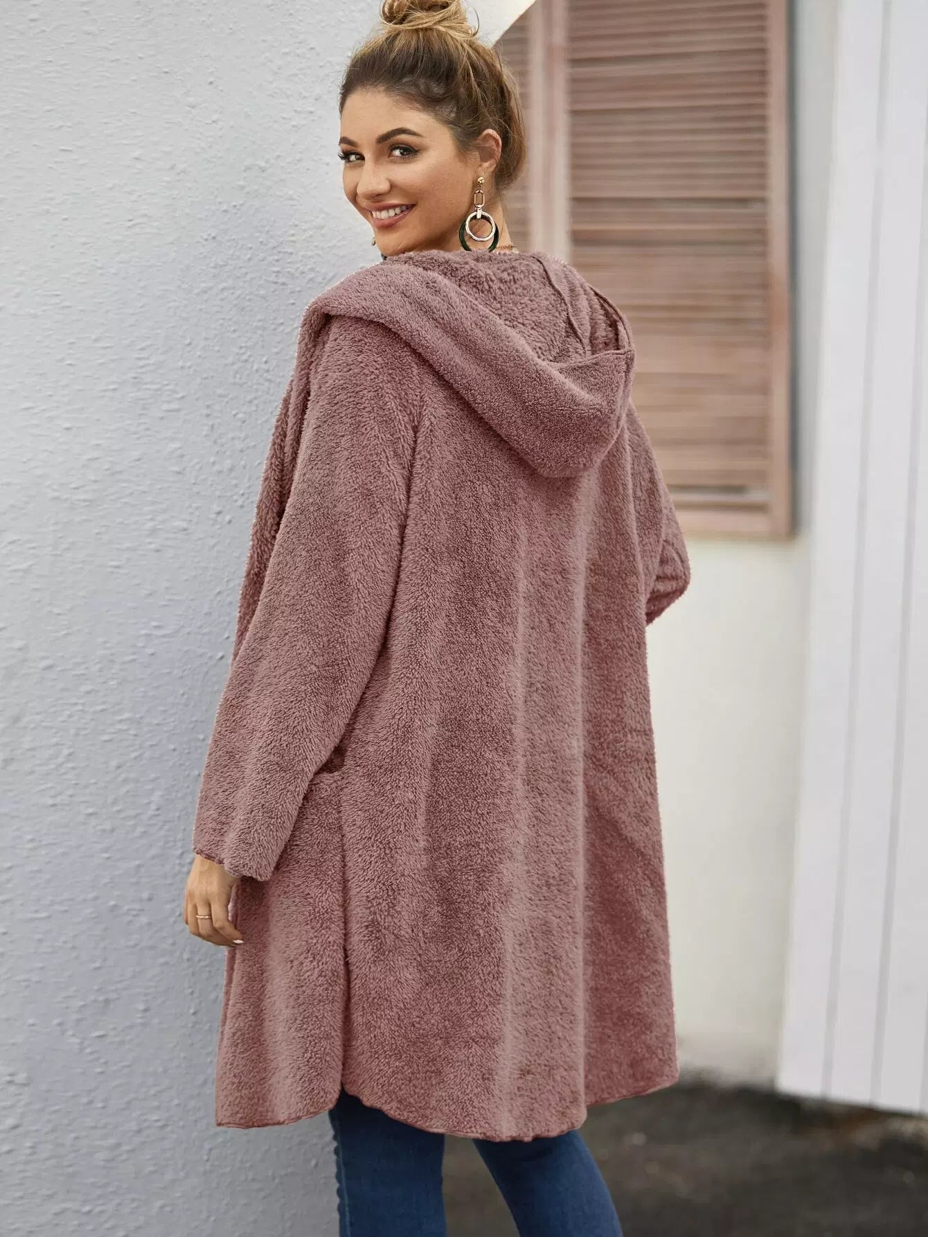 للنساء - معطف تيدي بغطاء للرأس وجيب مزدوج مفتوح من الأمام