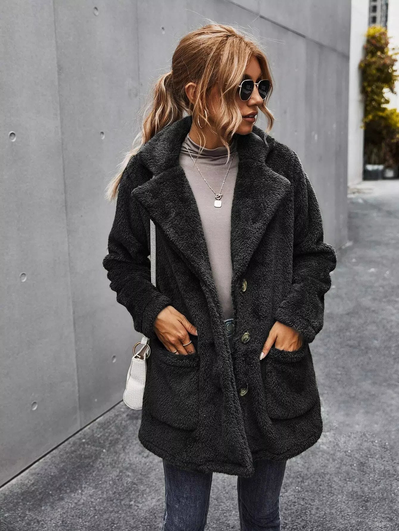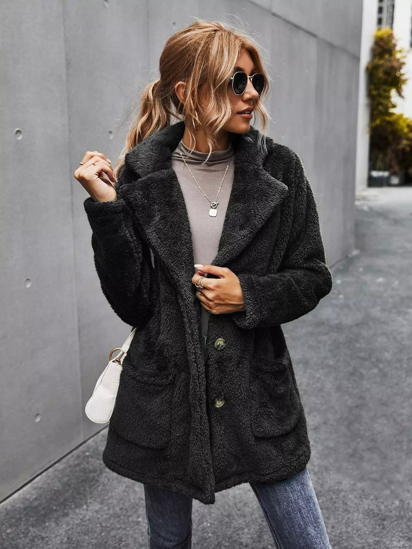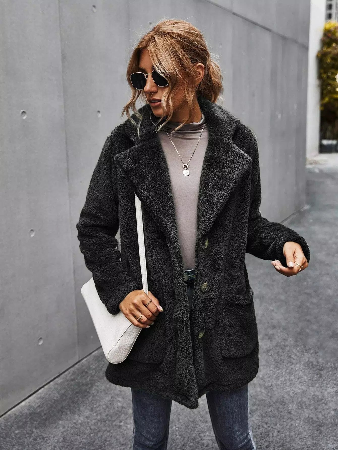 معطف تيدي بجيب مزدوج أمامي بأزرار