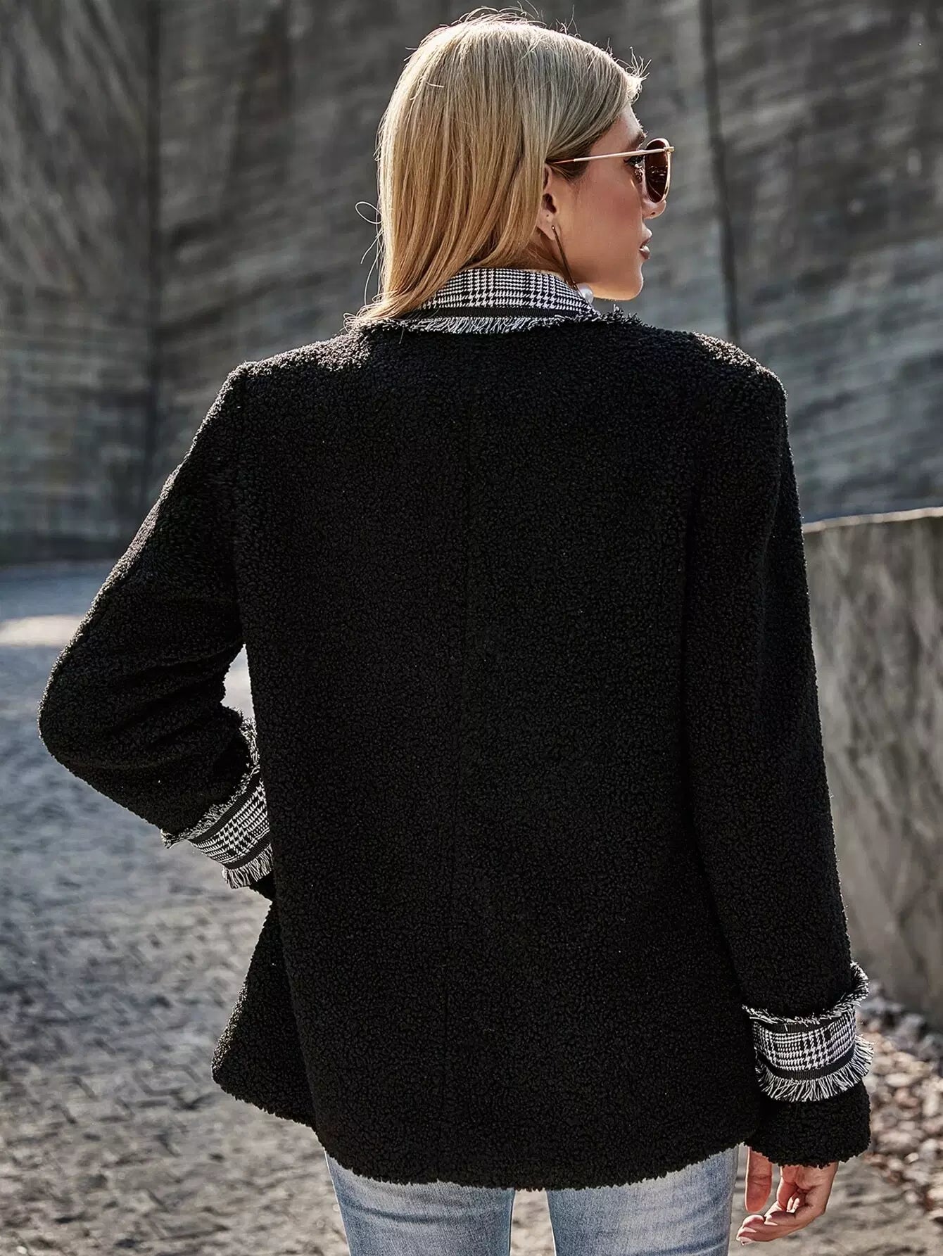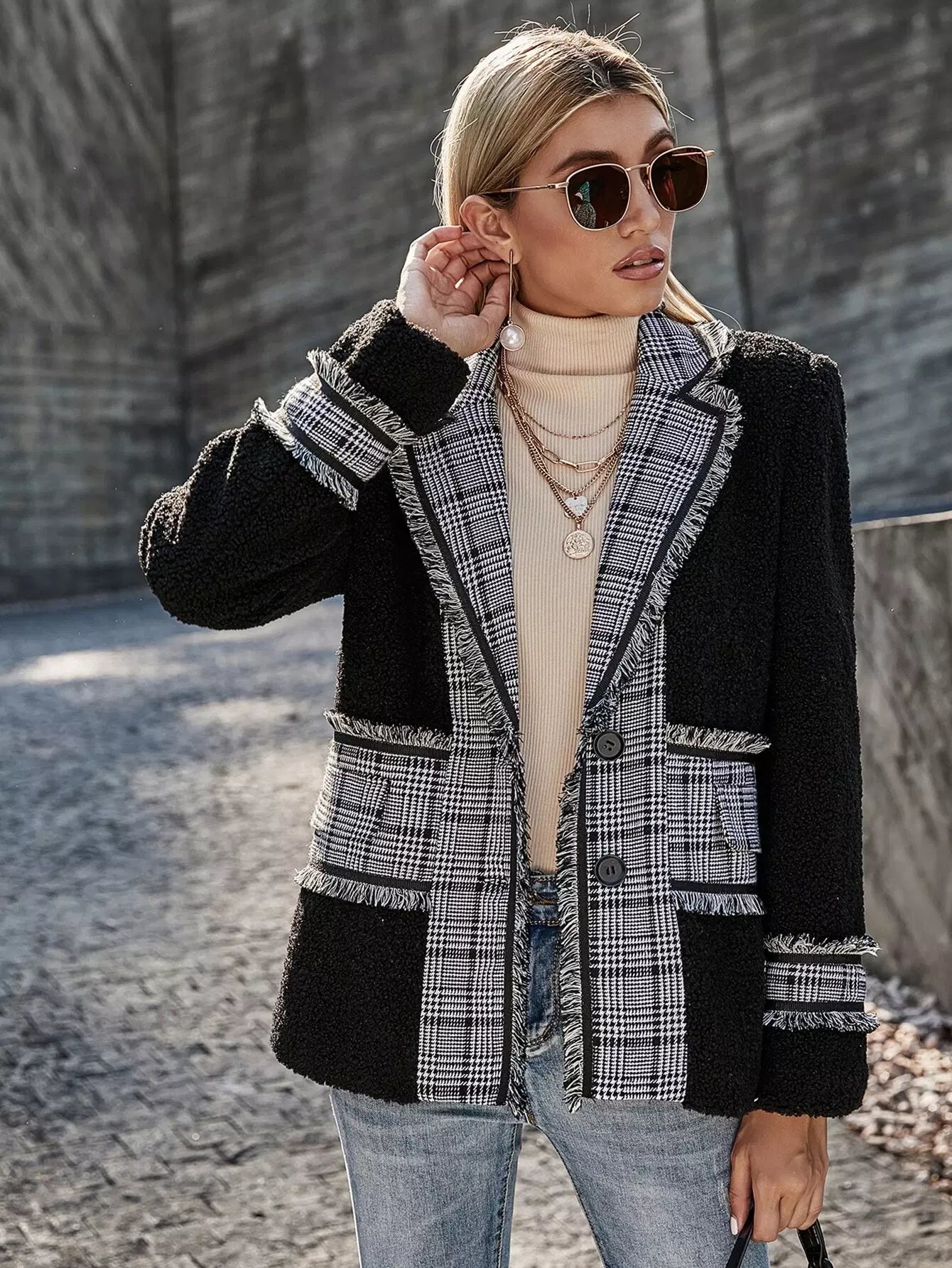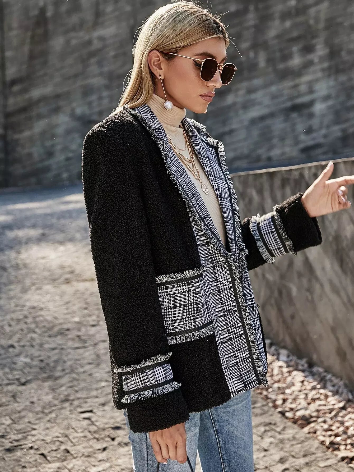 معطف تيدي بلوحة مربعات متباينة اللون بدون حزام