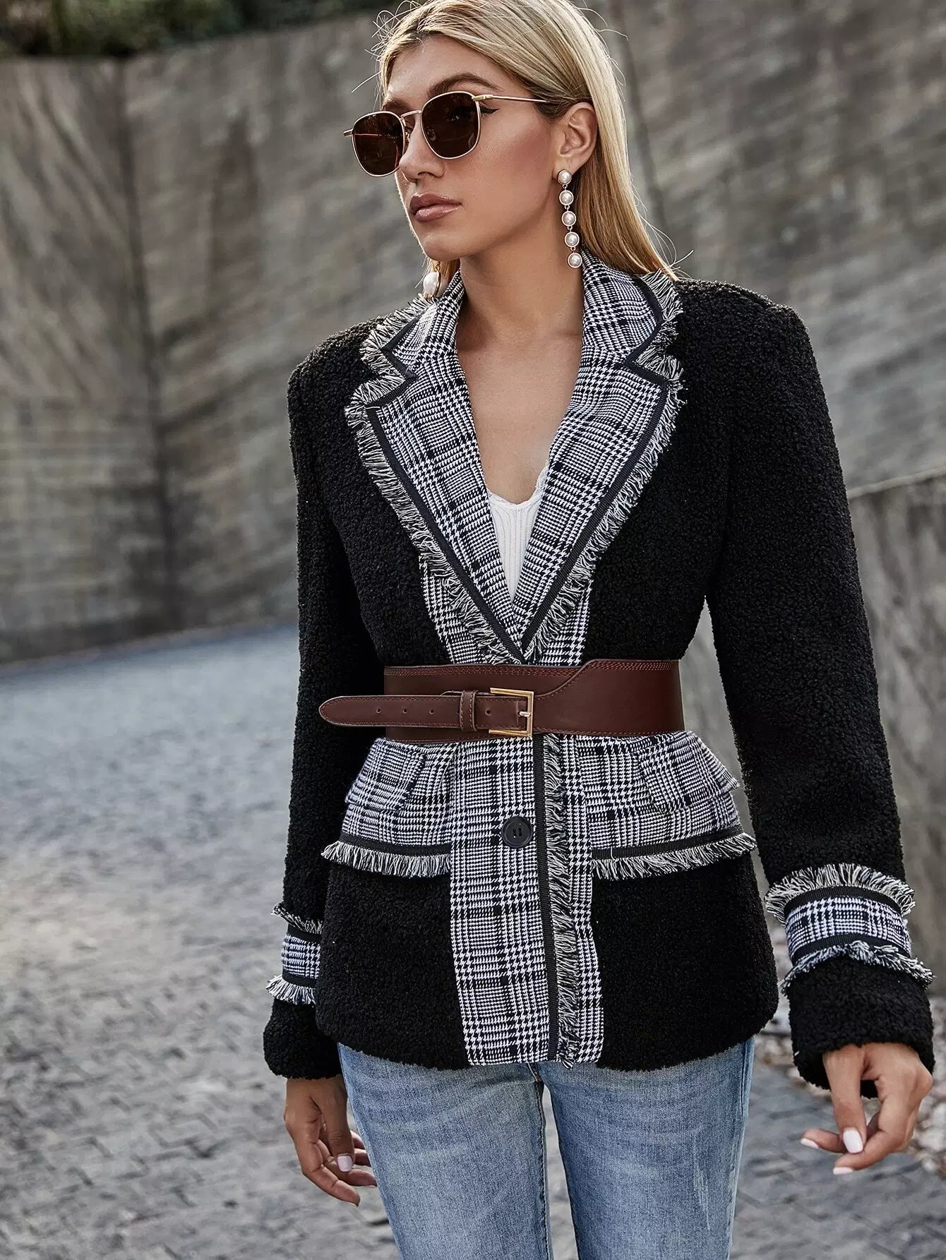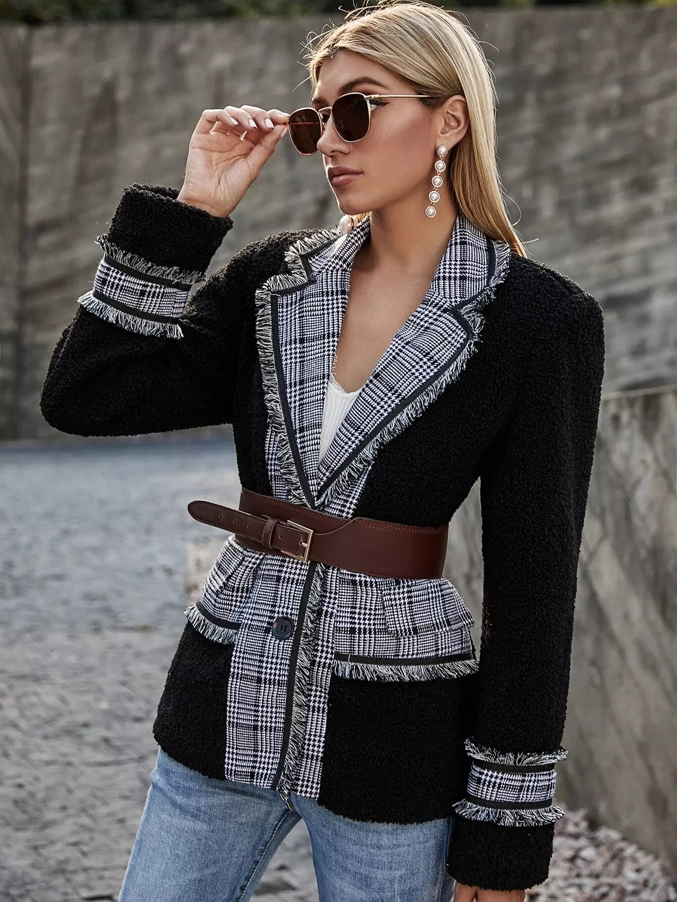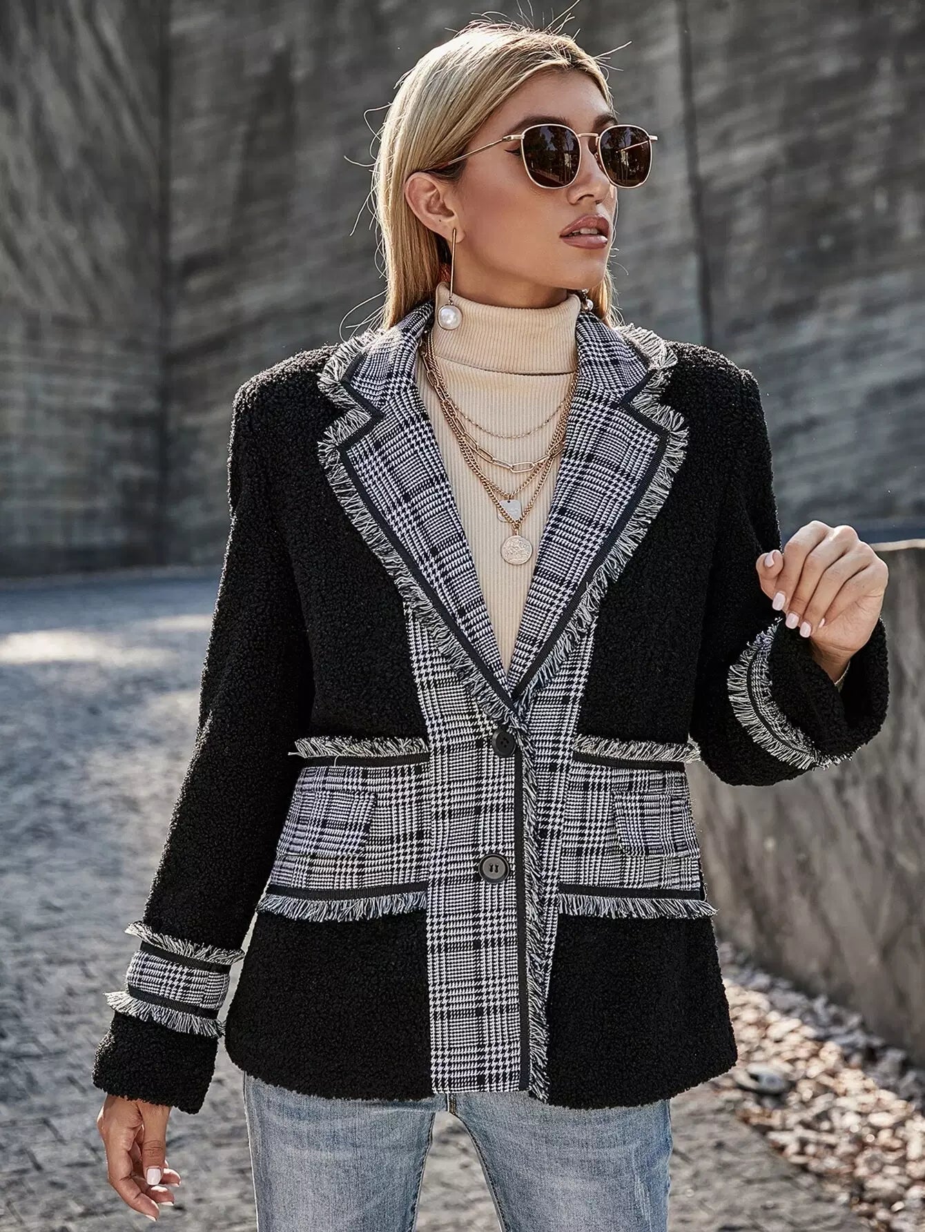 معطف تيدي بلوحة مربعات متباينة اللون بدون حزام