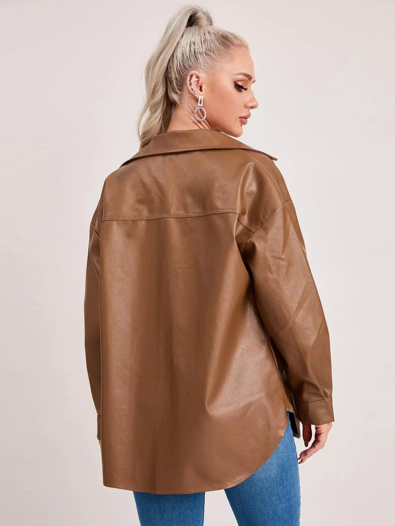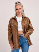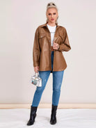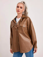 للنساء - معطف من جلد البولي يوريثان بجيب أمامي وكتف منسدل وجيب قلاب