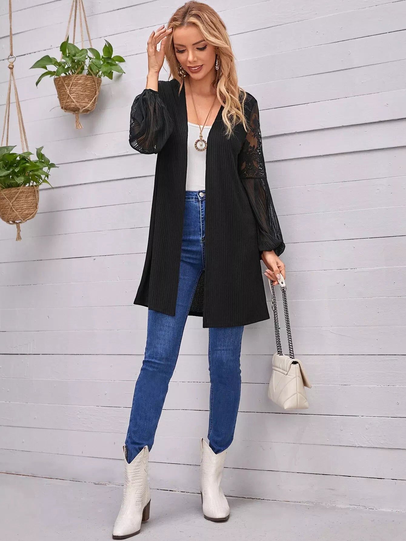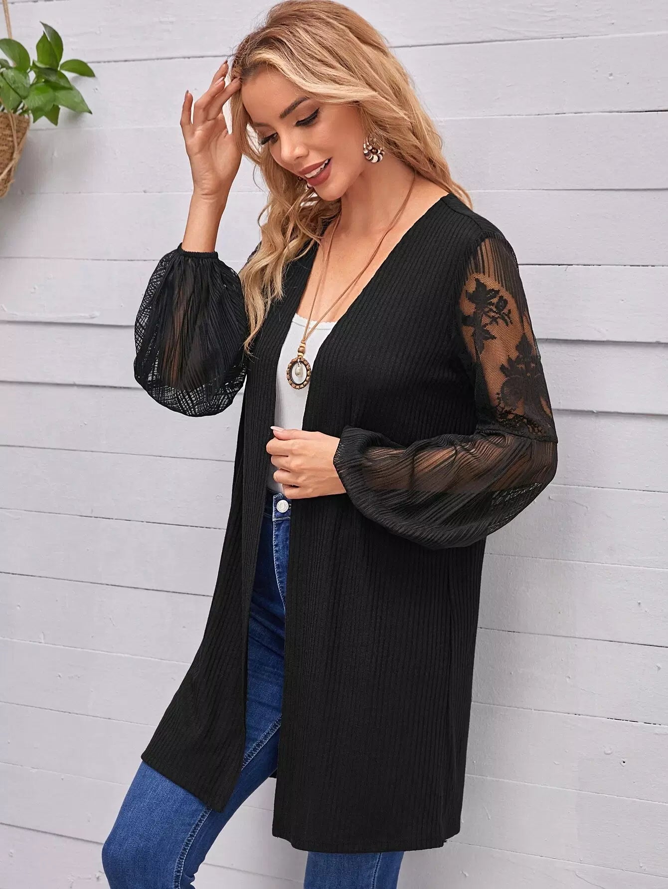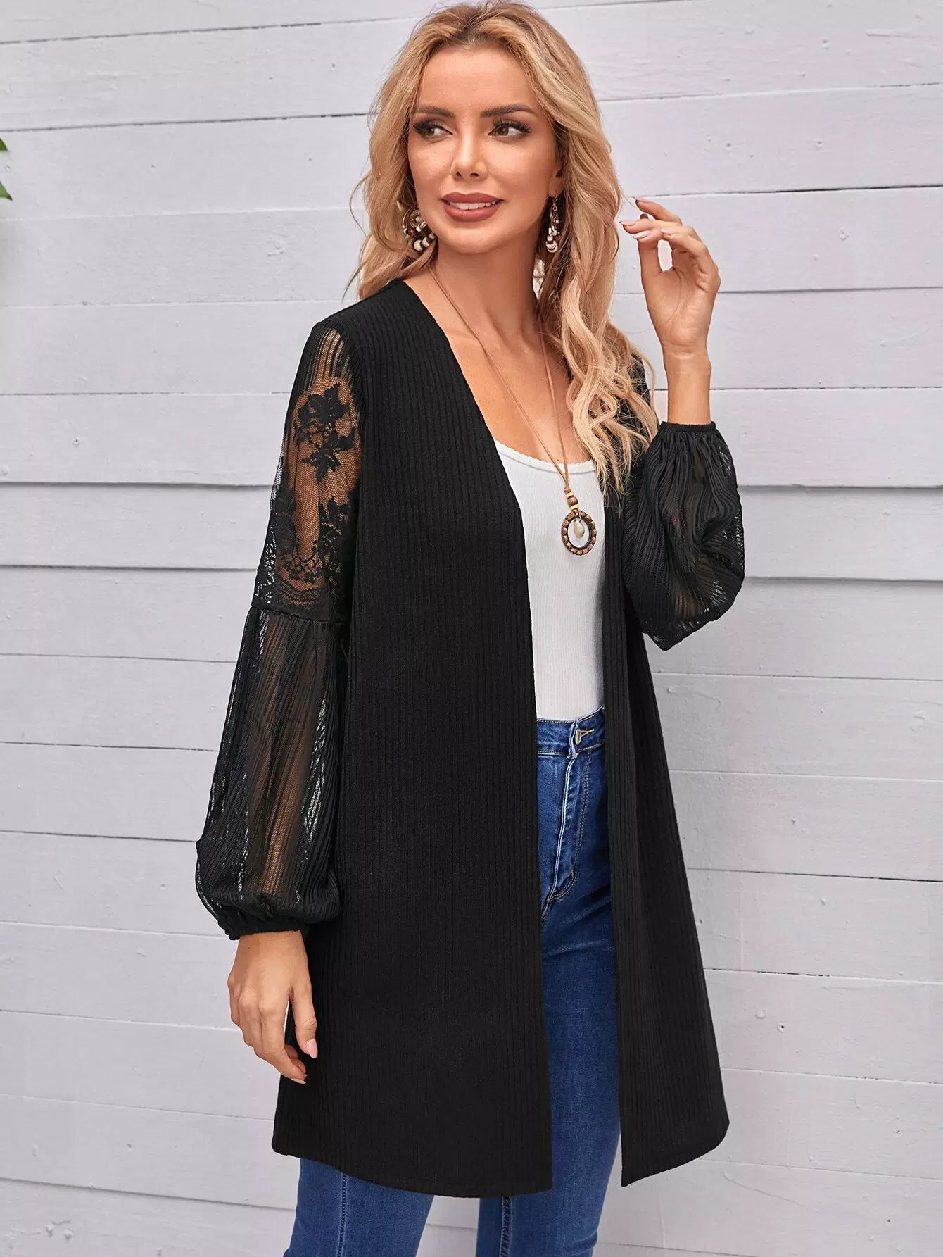 معطف مفتوح من الأمام بأكمام واسعة ولوحة دانتيل