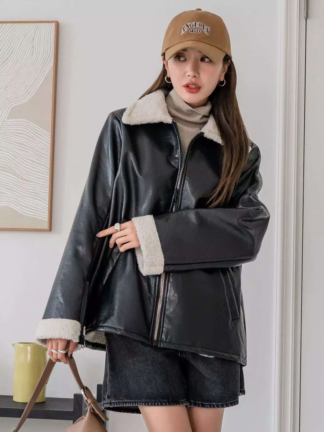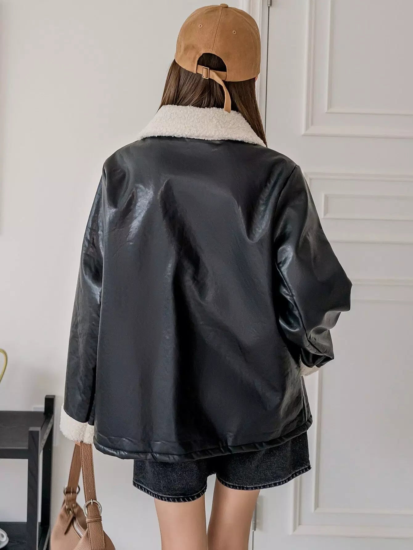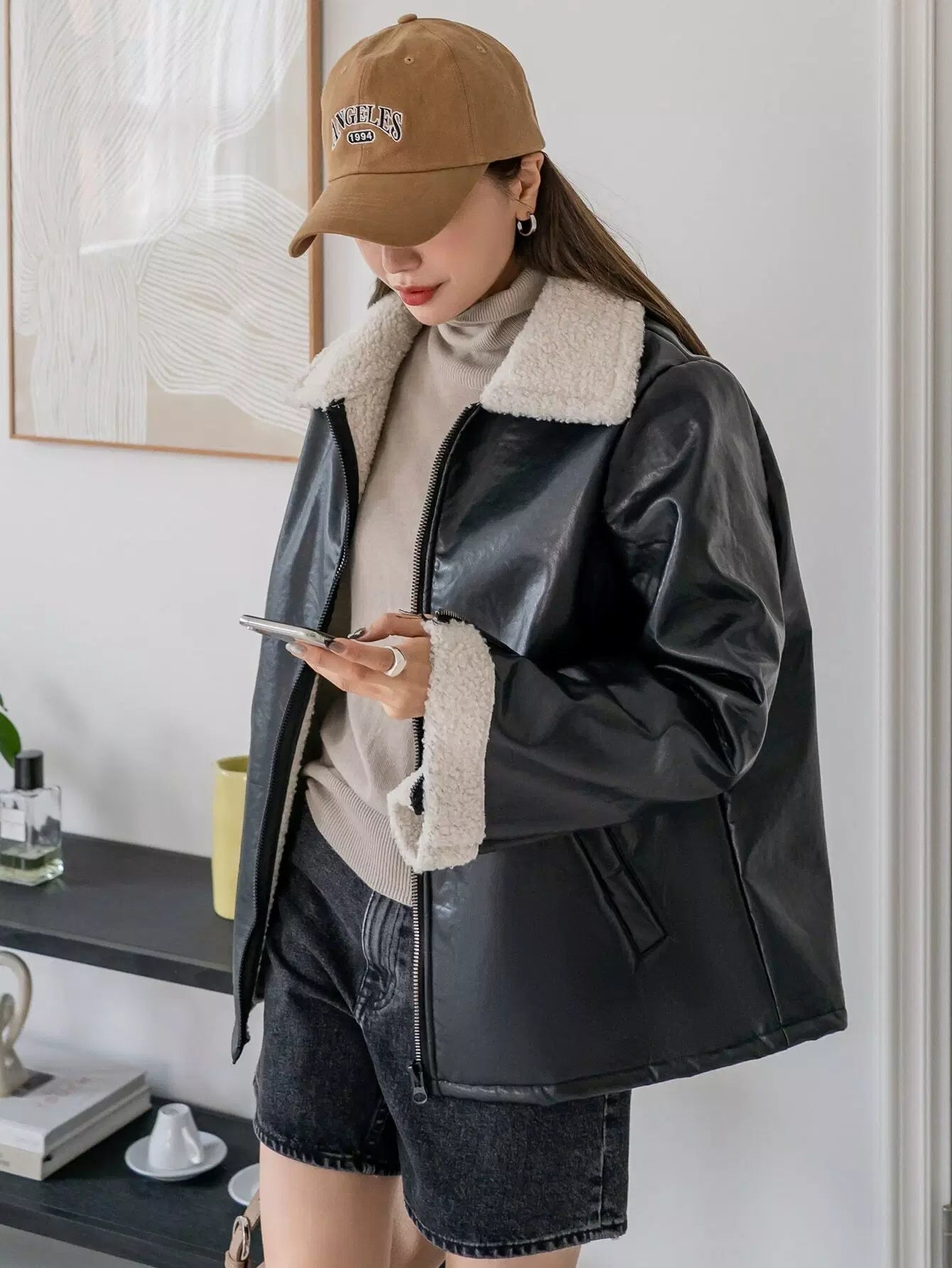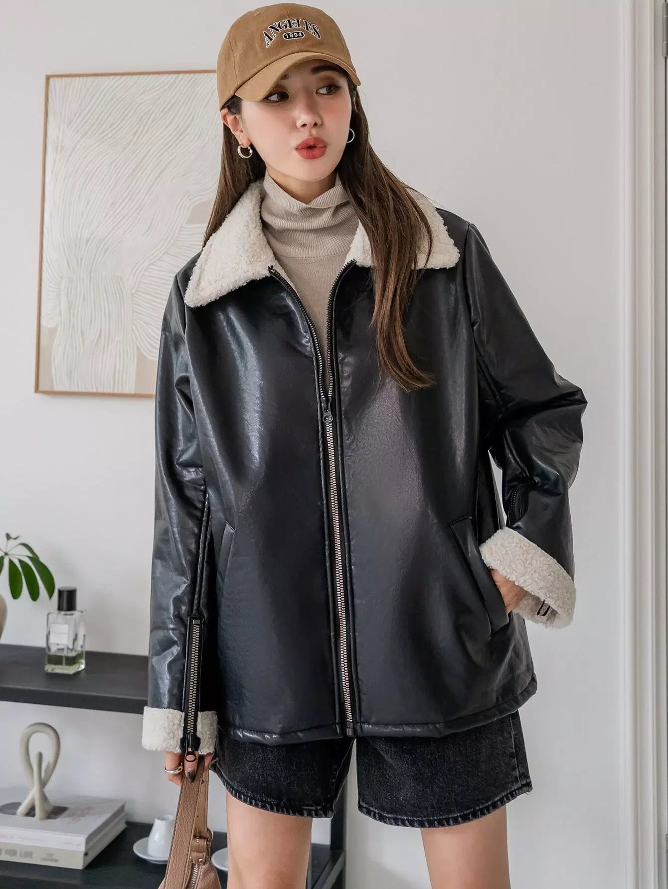 معطف من جلد البولي يوريثان مبطن بالجلد