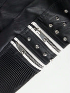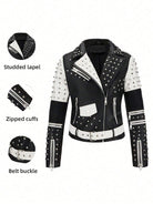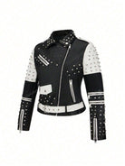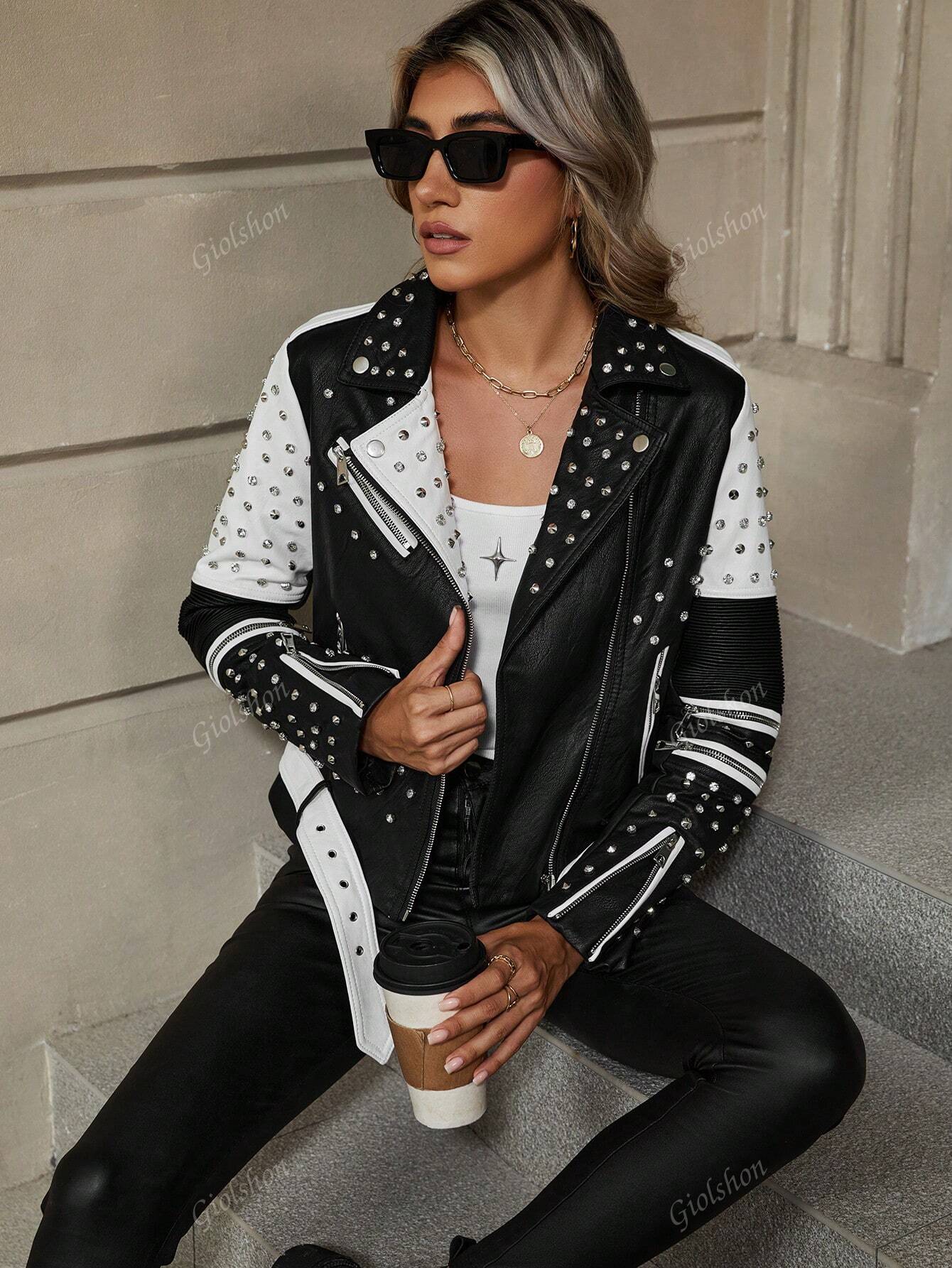 جاكيت بايكر نسائي من الجلد الصناعي مناسب للخريف والشتاء - مرصع بالألماس، بسحاب غير متماثل لأجواء باردة جريئة