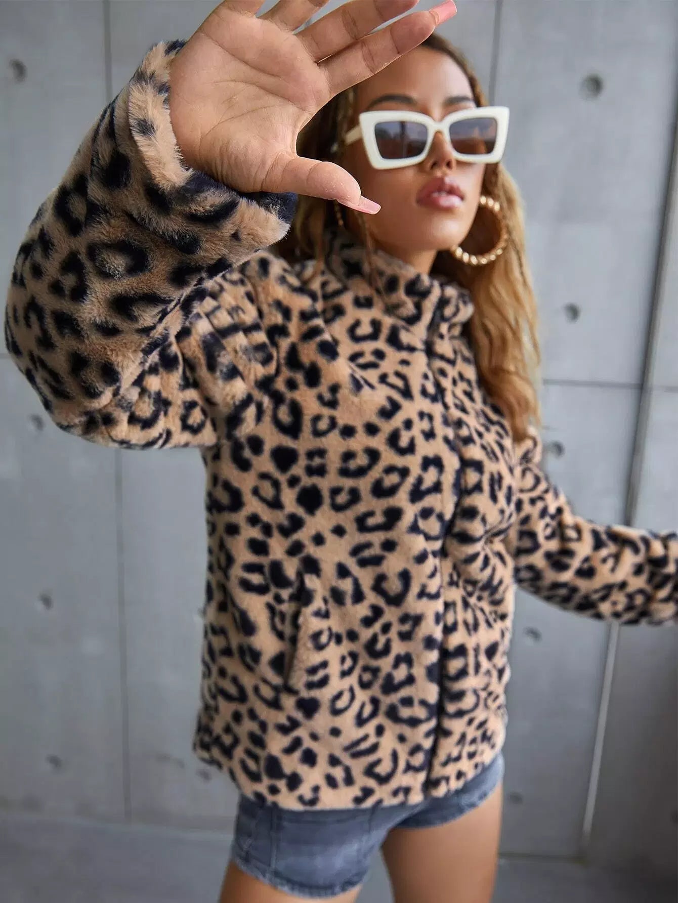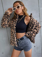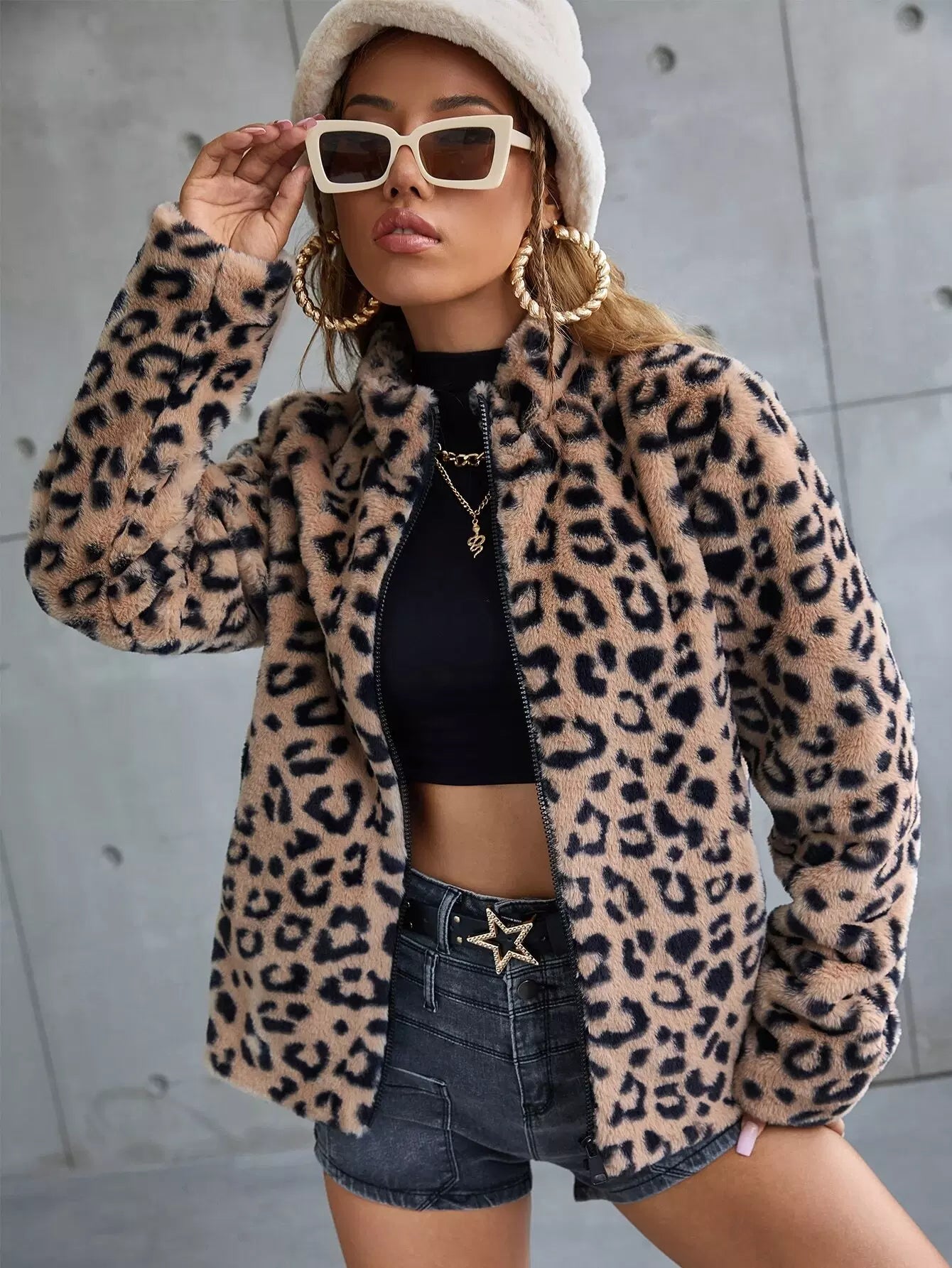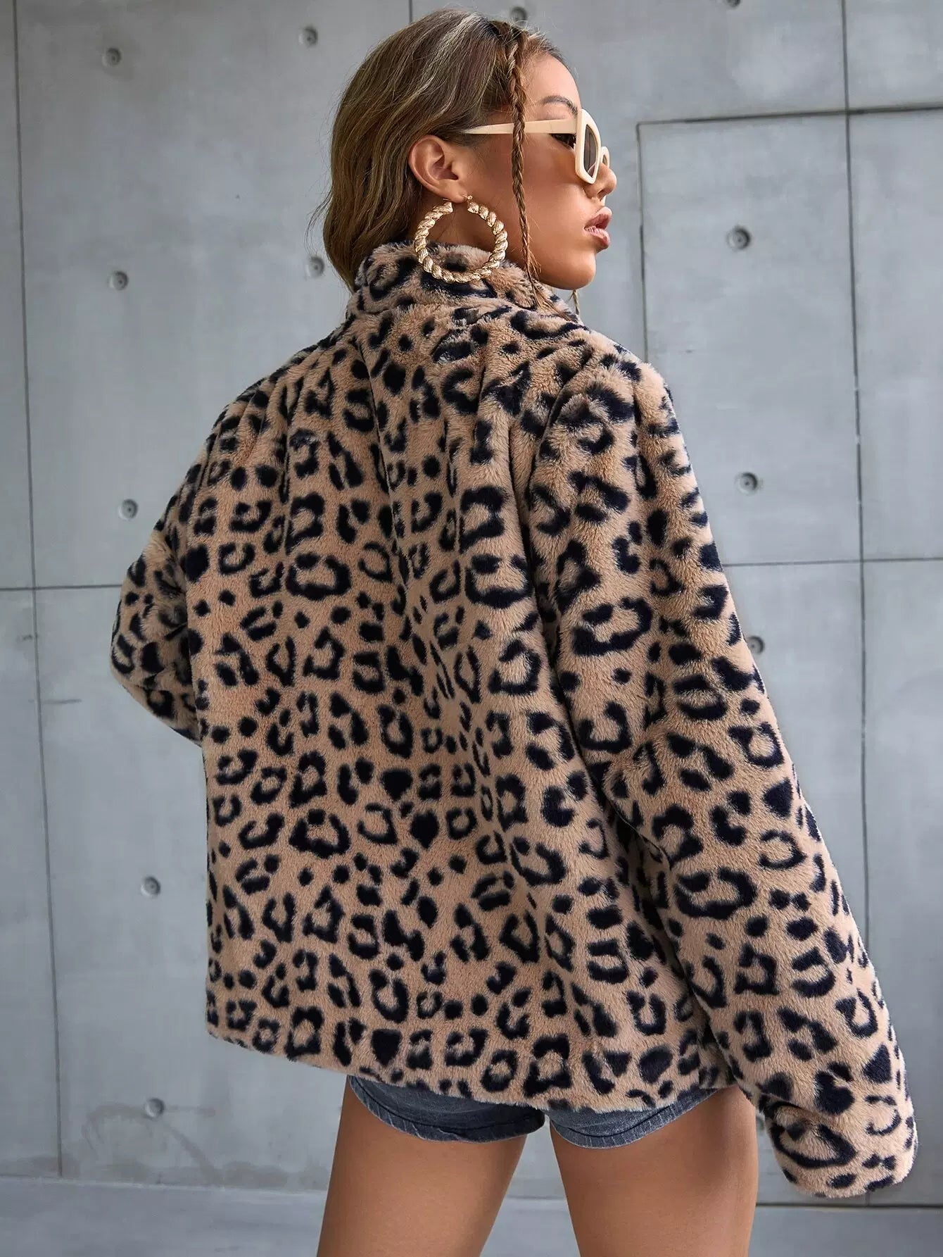 معطف بنقشة جلد النمر وجيب مائل وسحاب