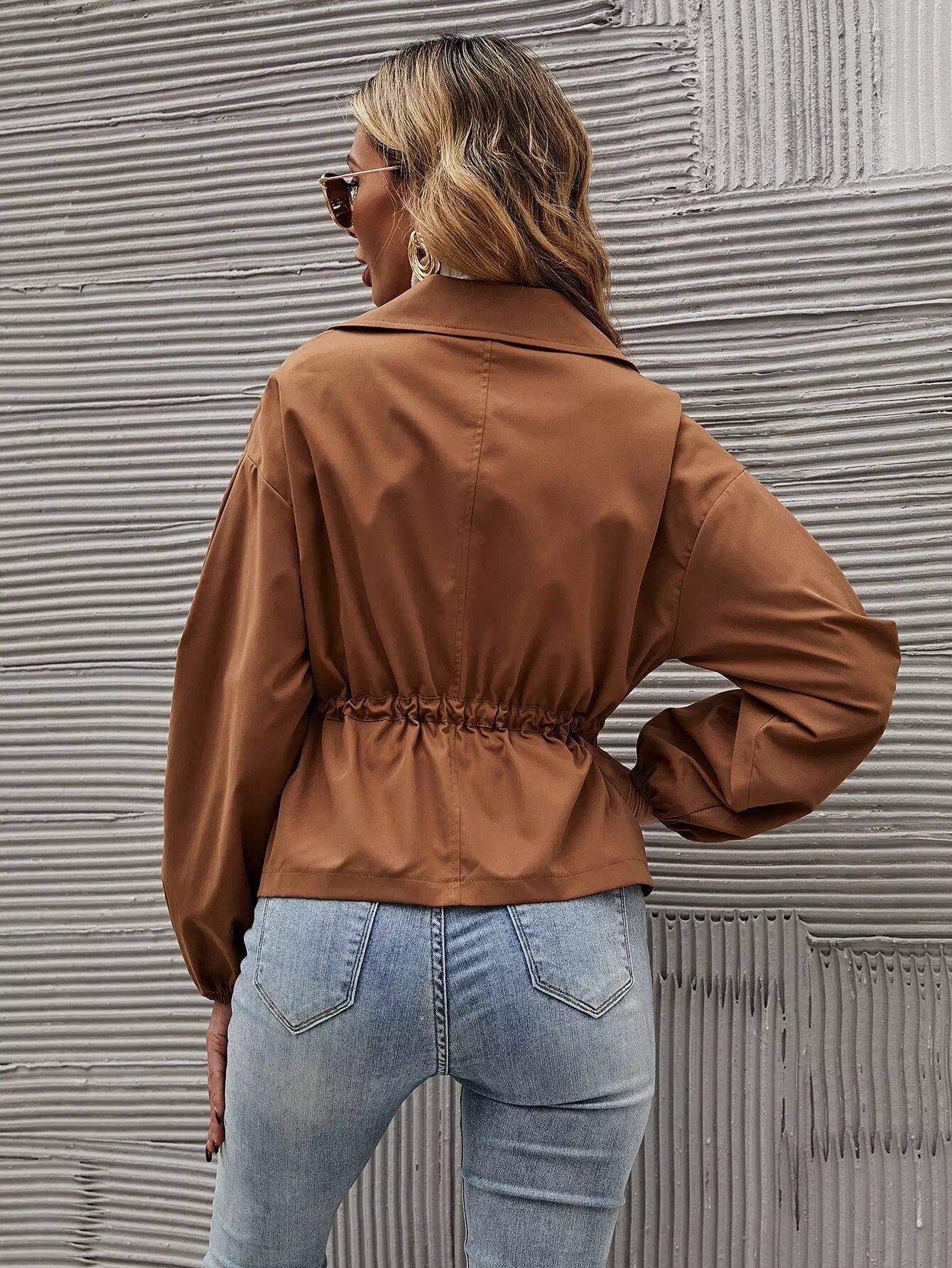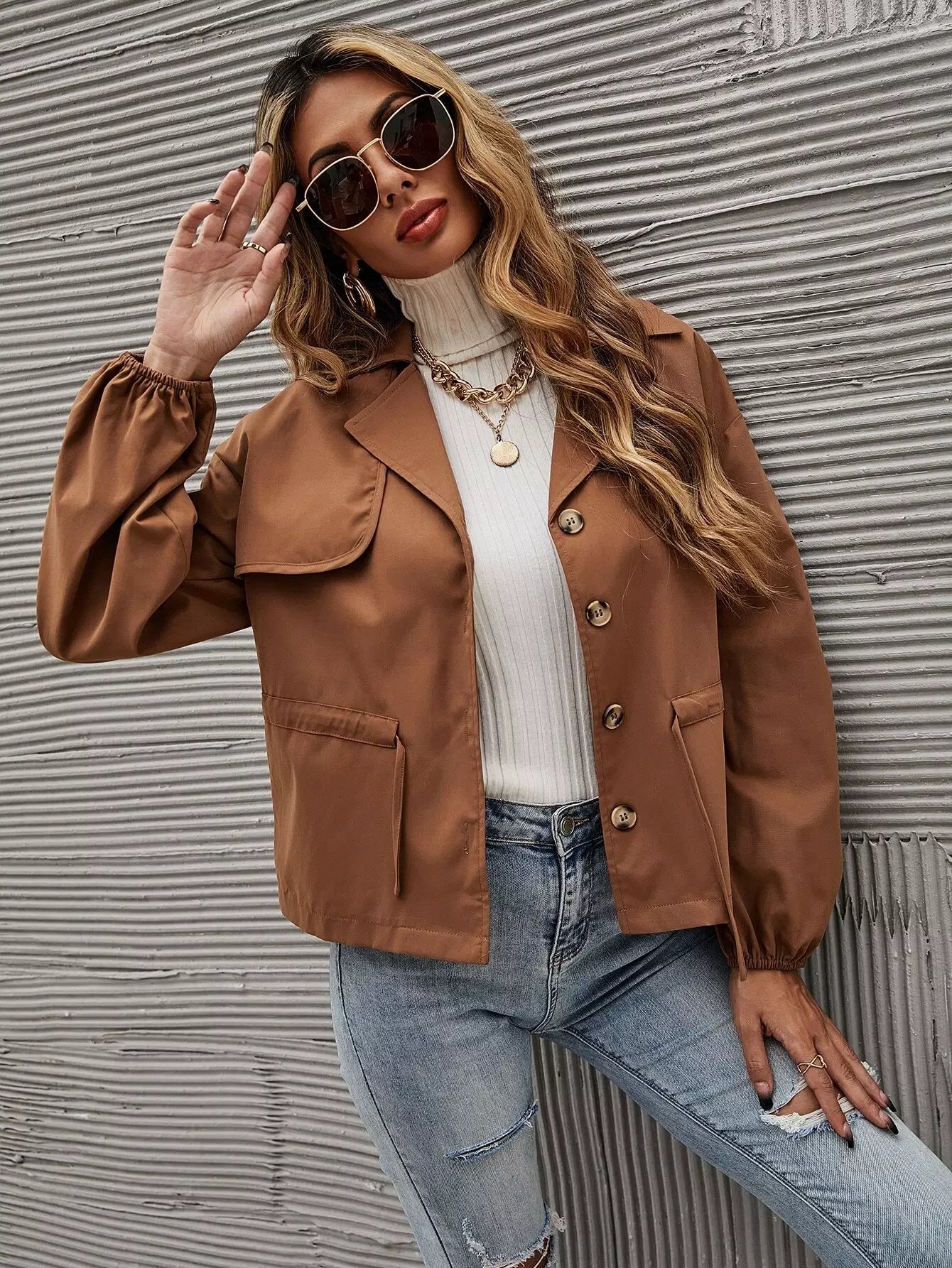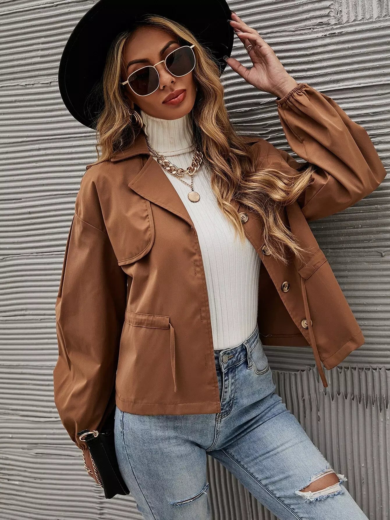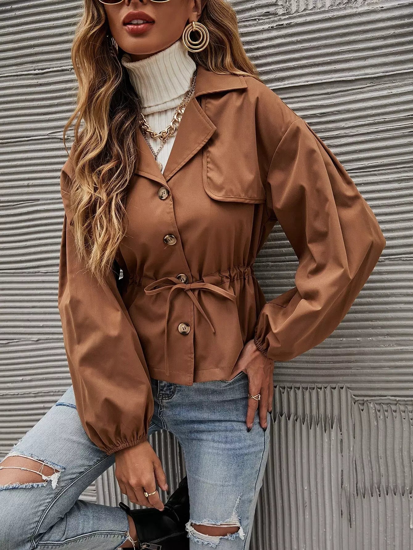 جاكيت برباط خصر بأزرار منسدلة على الكتف بياقة منسدلة على الياقة
