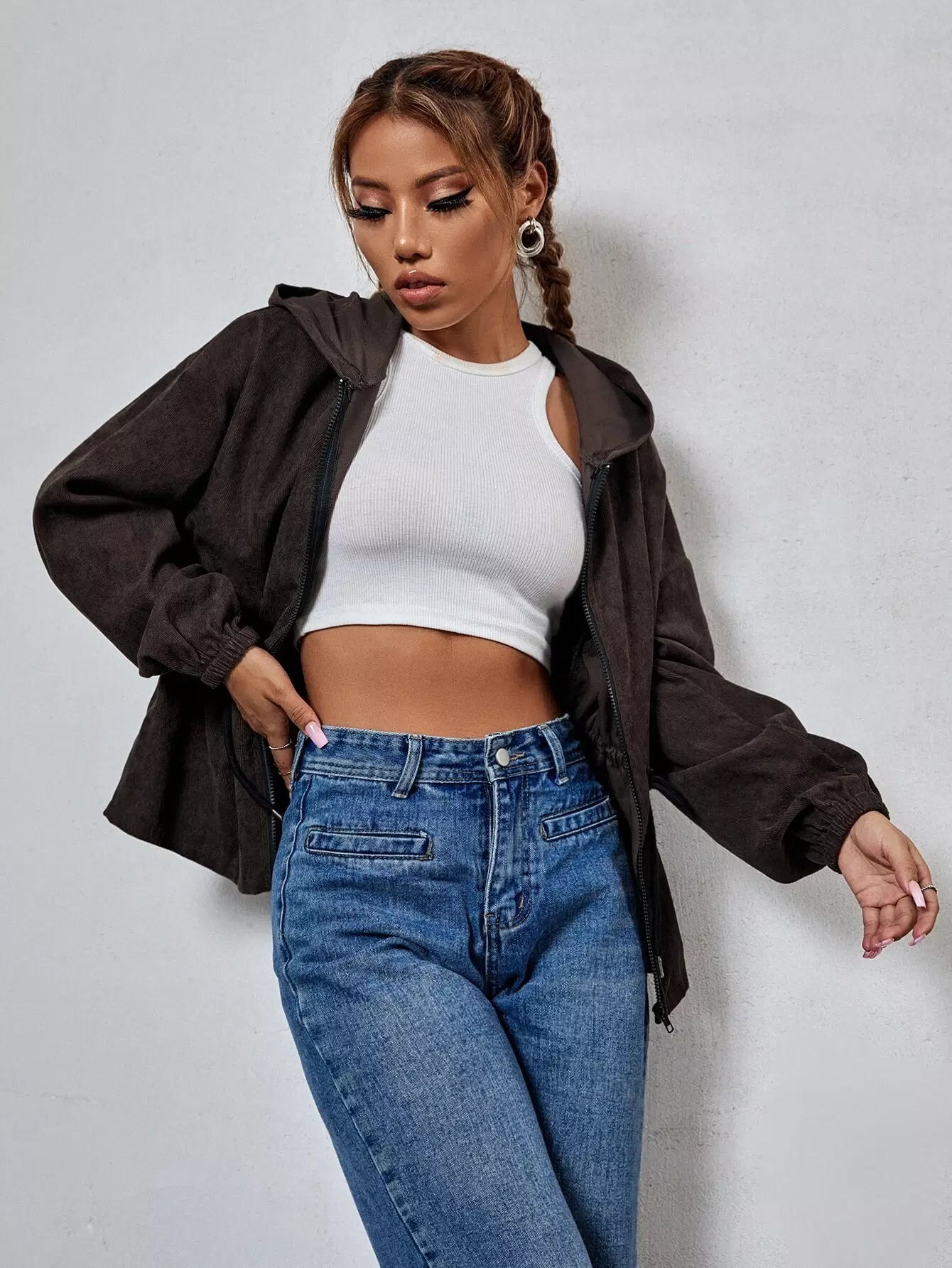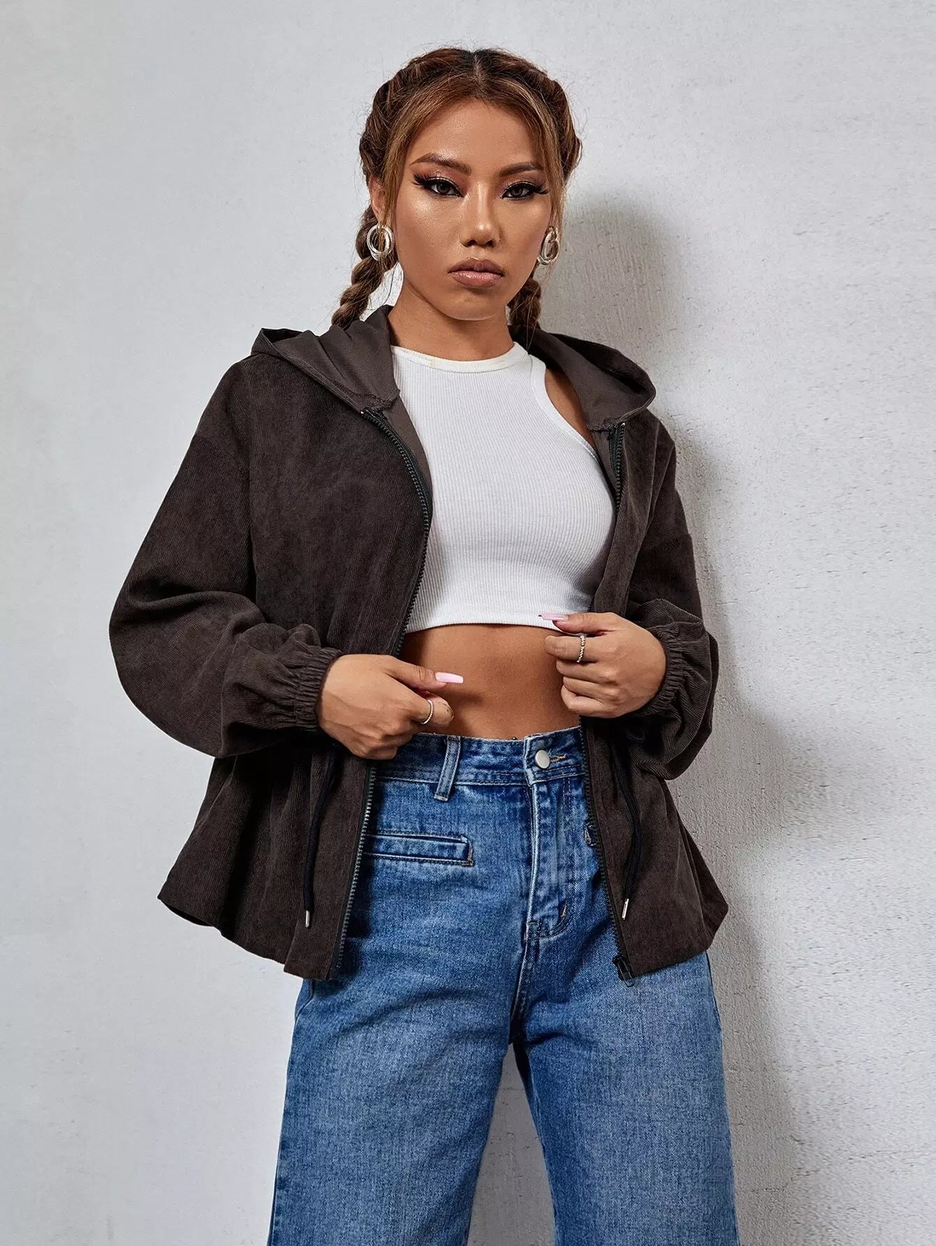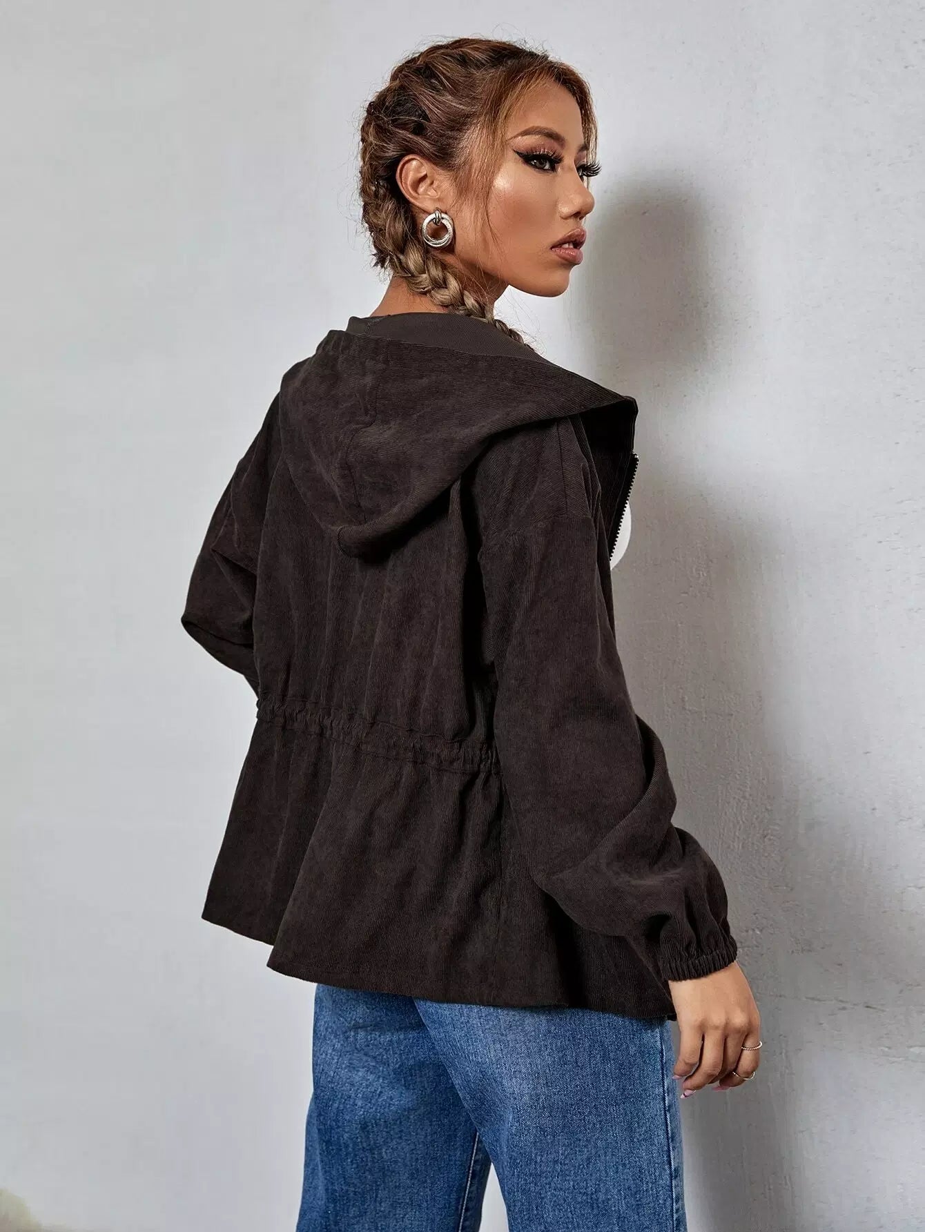 للنساء - سترة بقلنسوة ذات كتف منسدل ورباط وخصر وسحاب