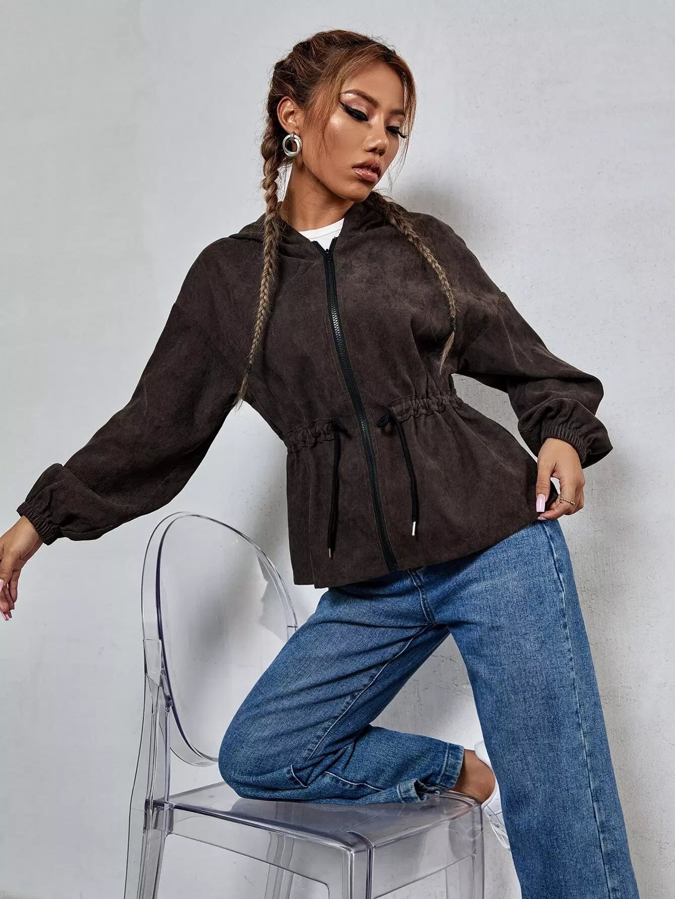 جاكيت منسدل الكتفين برباط على الخصر بسحاب بغطاء للرأس