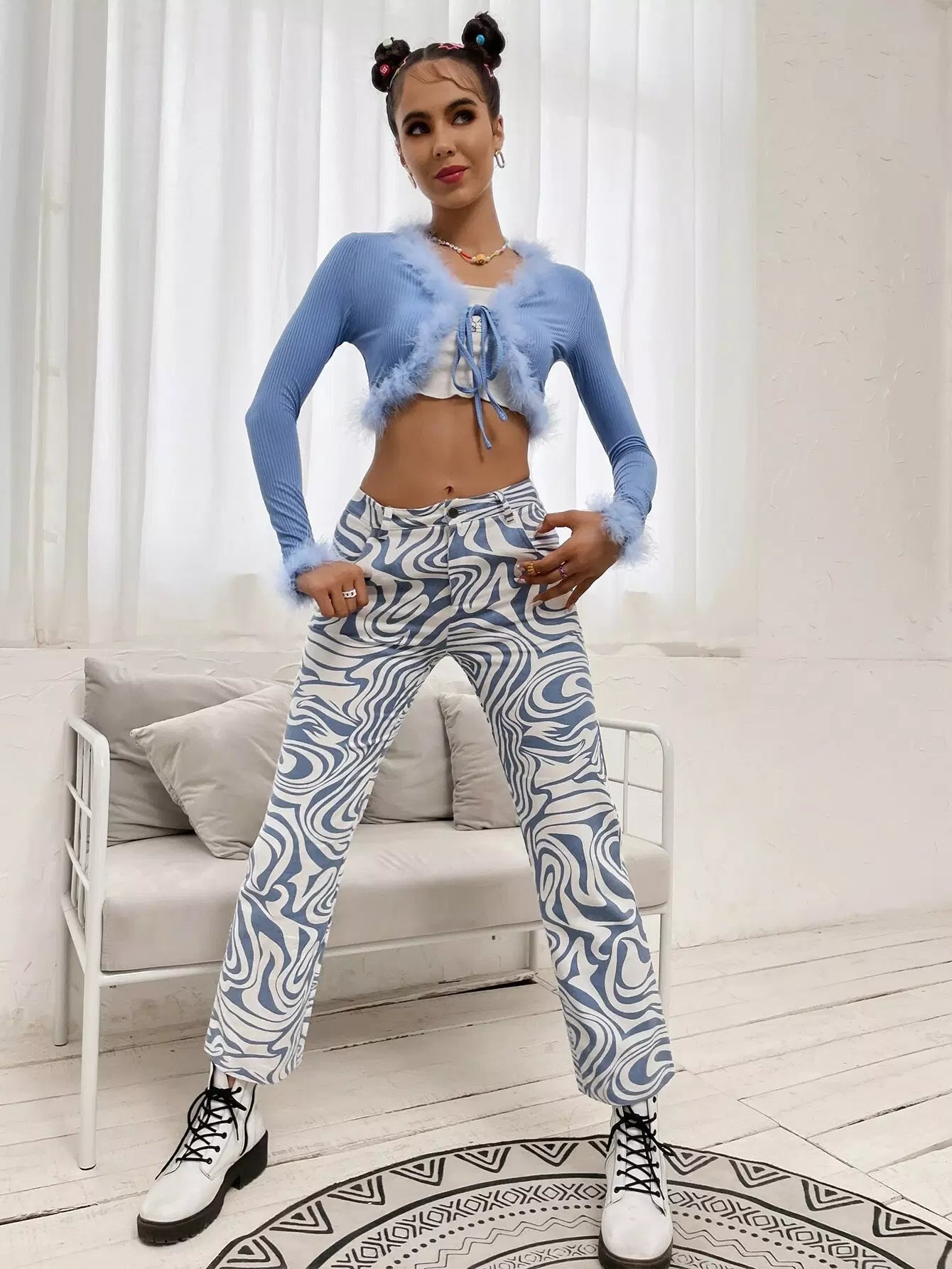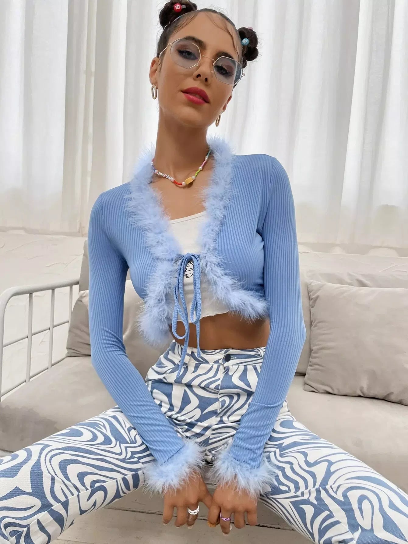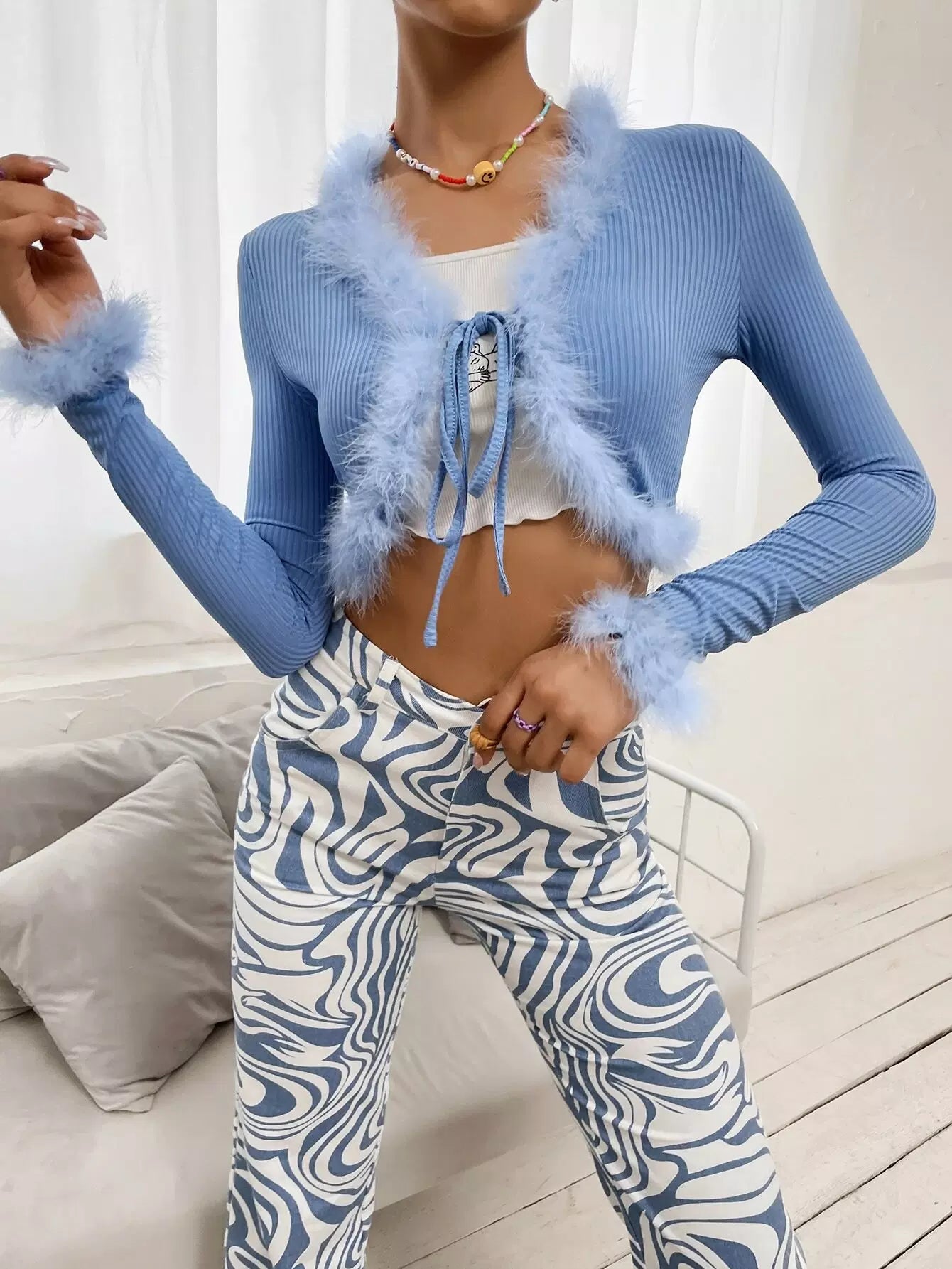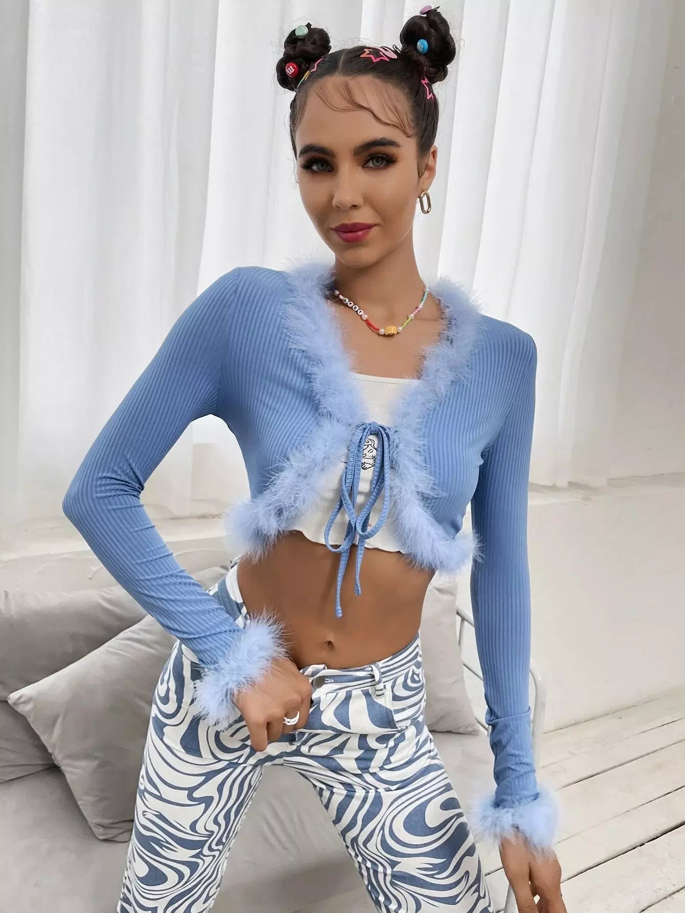 سترة قصيرة محبوكة مضلعة بعقدة أمامية وحواف غامضة