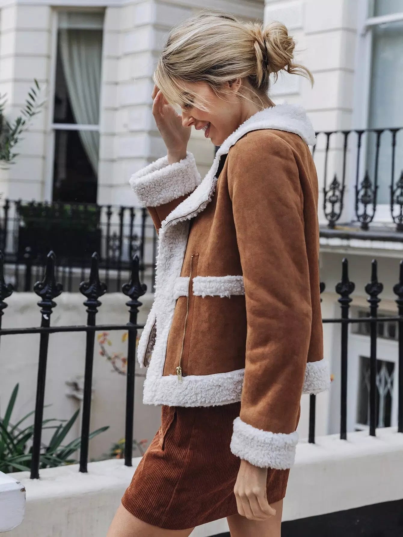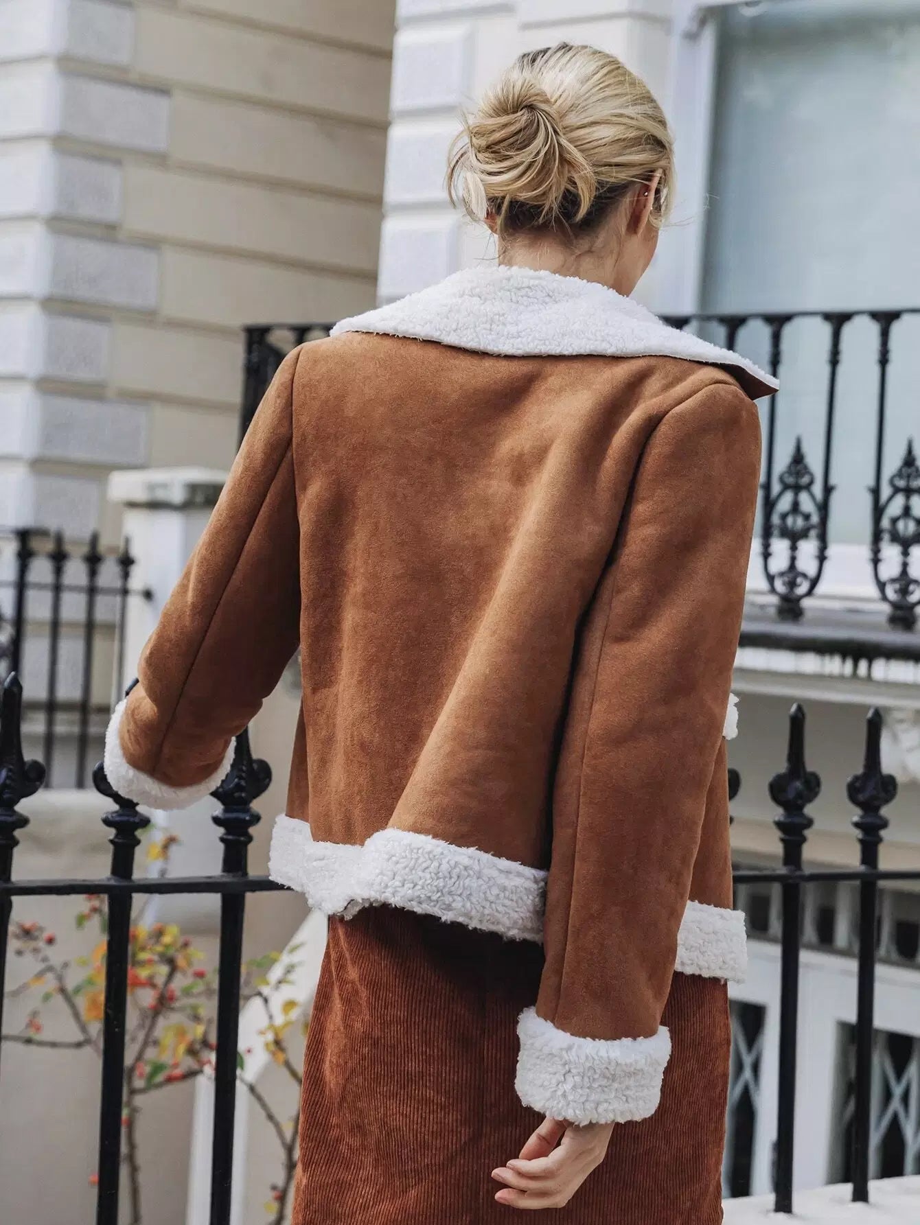 سترة من جلد السويد مع ياقة مدببة وحواف من الفرو الصناعي