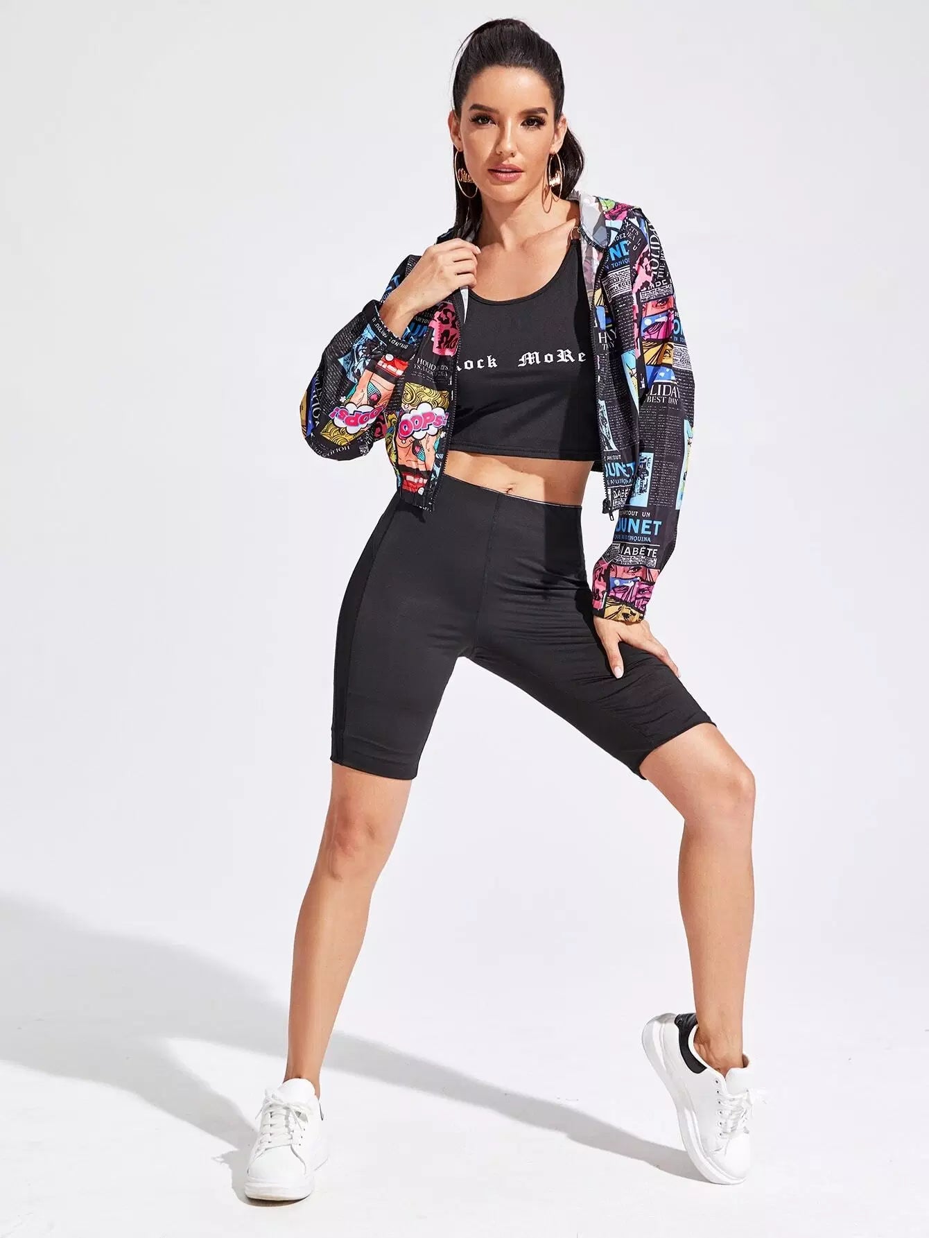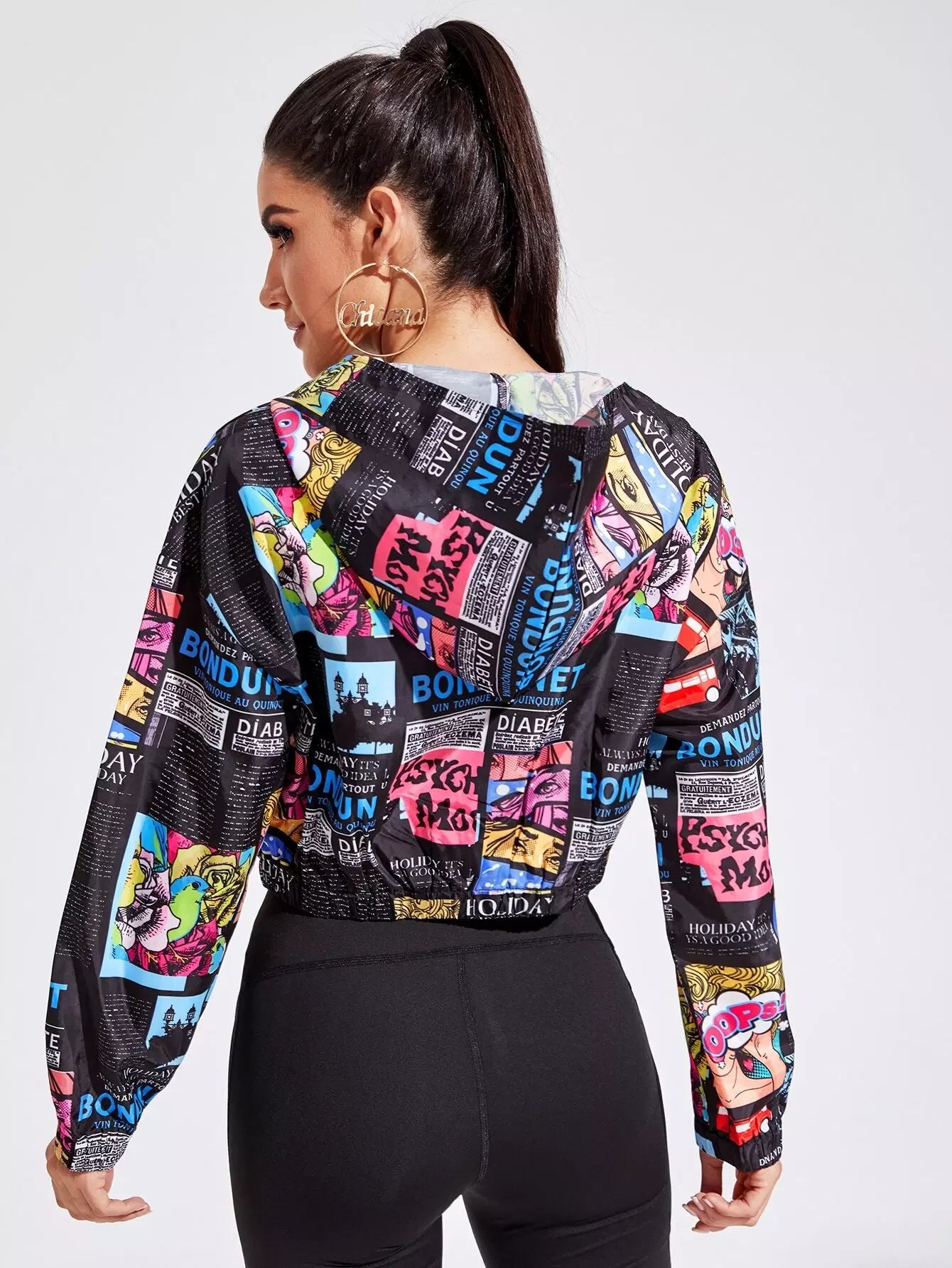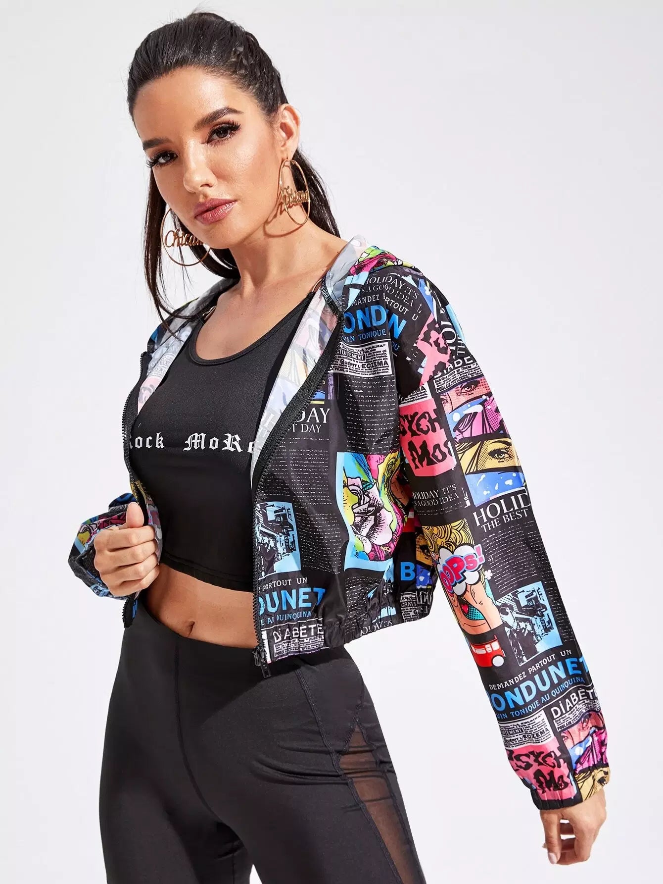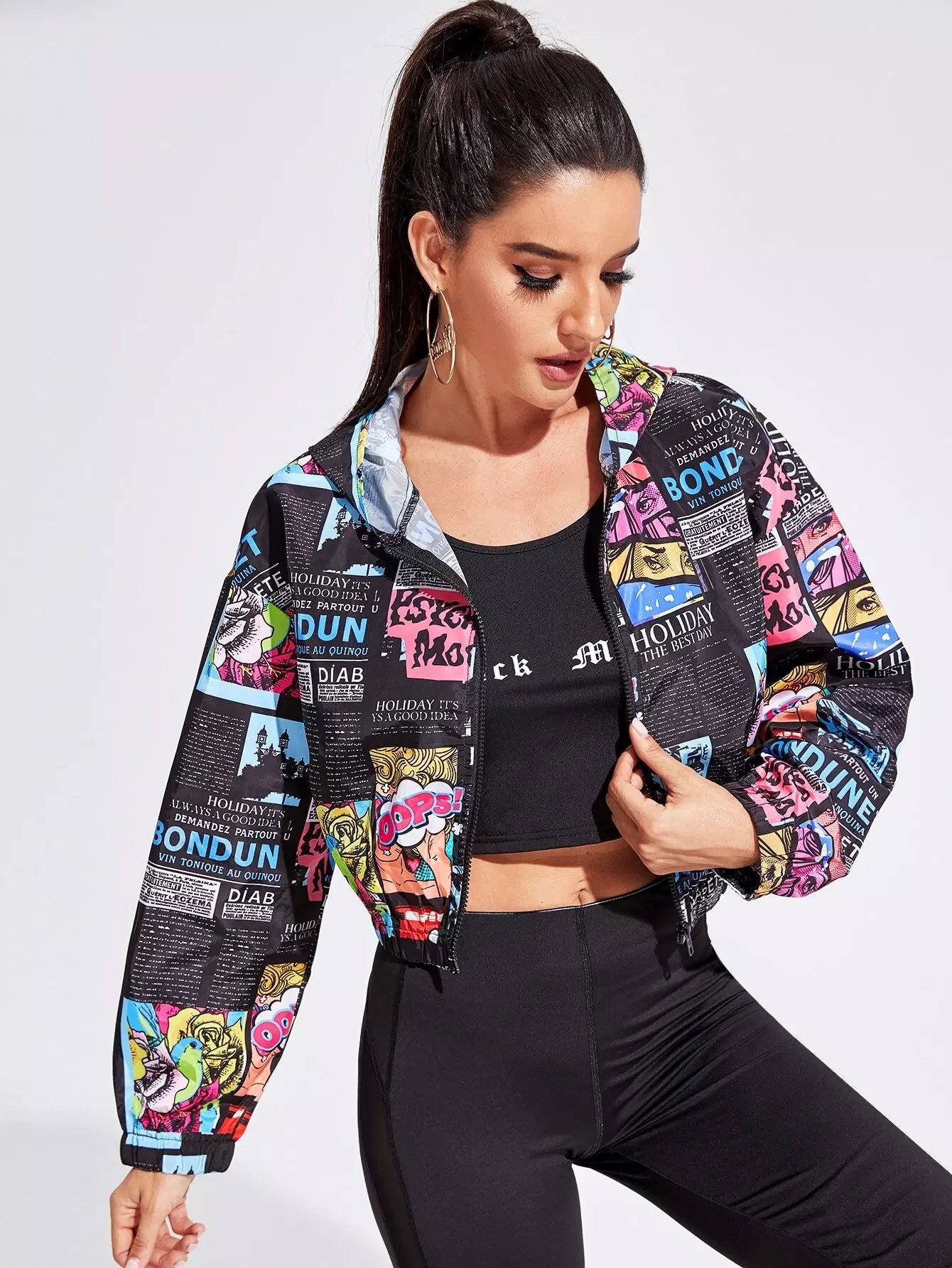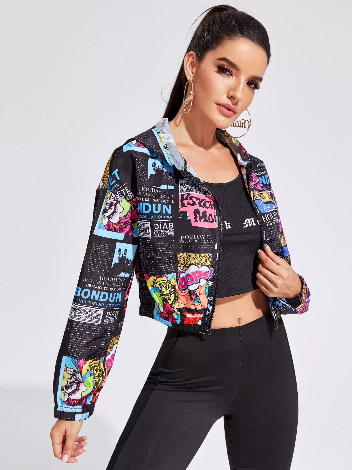 جاكيت بوب آرت مطبوع عليه طباعة فن البوب سحاب بغطاء واق من الرياح بغطاء عاكس