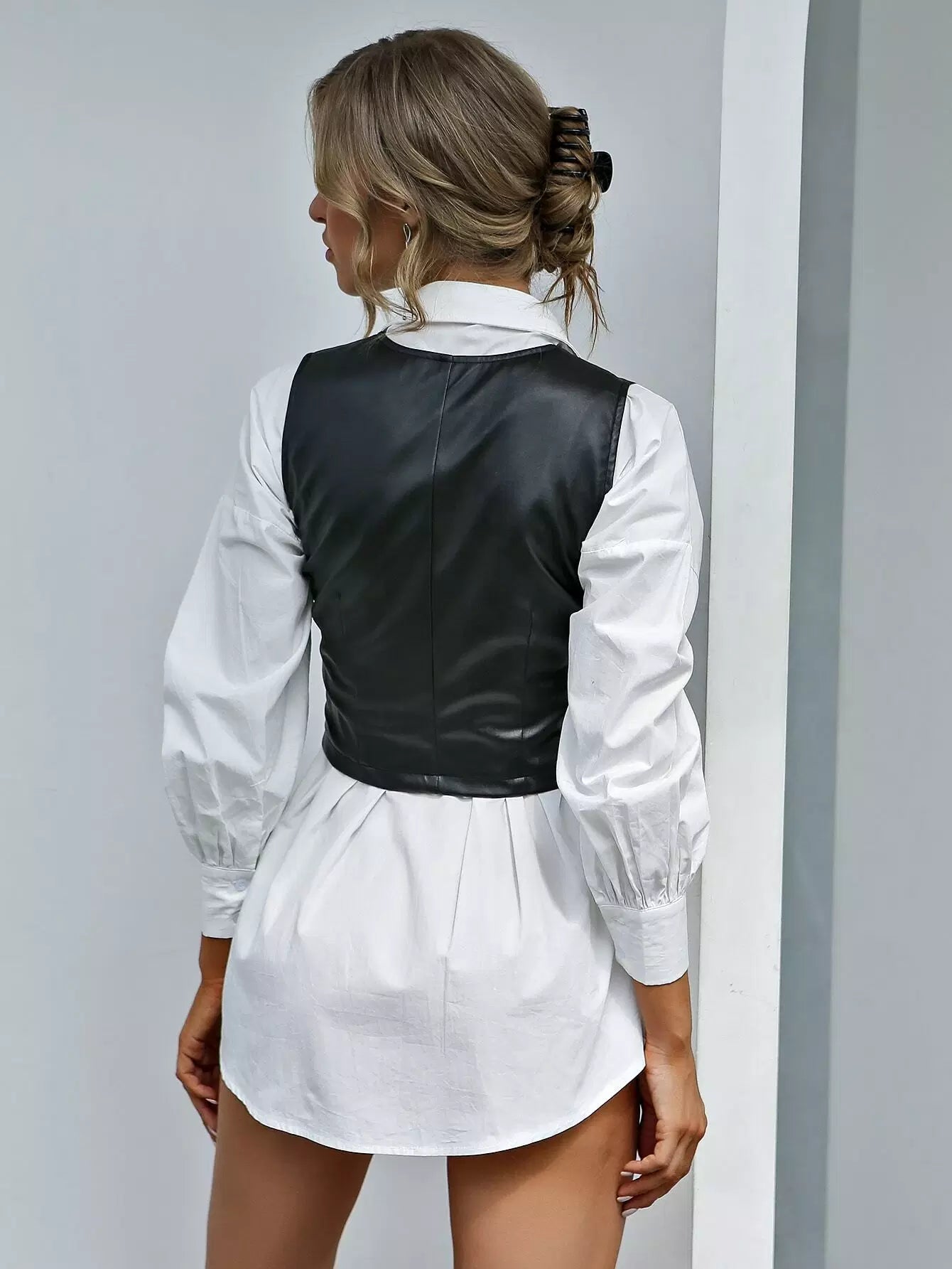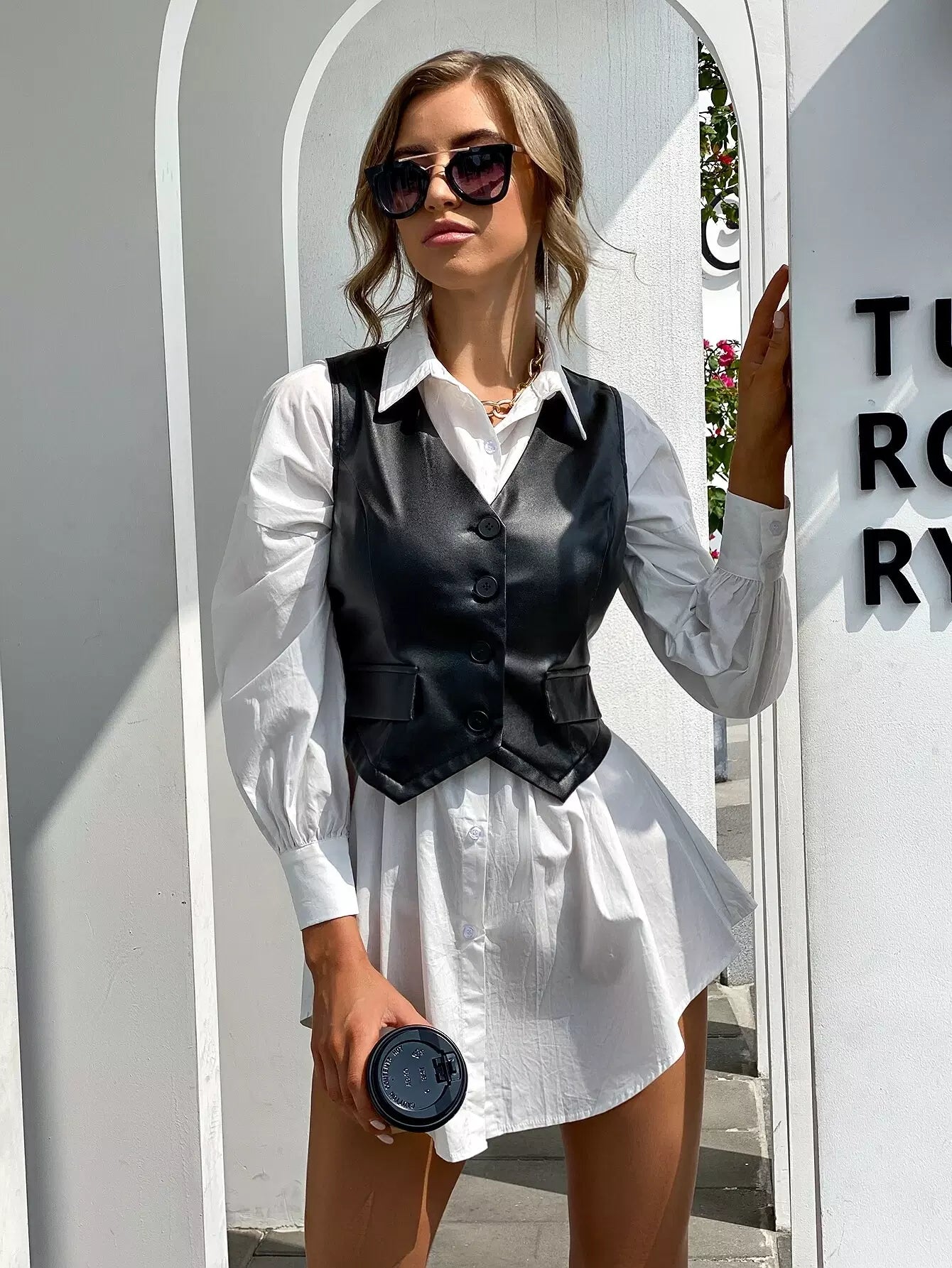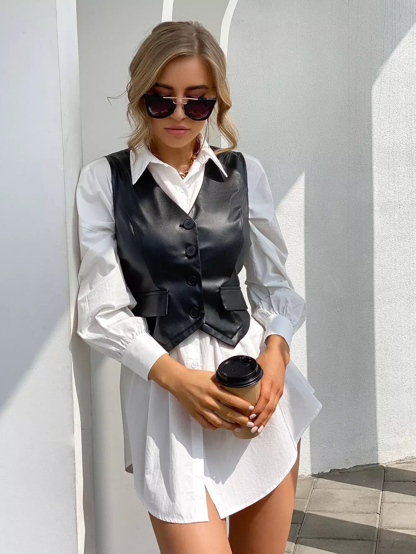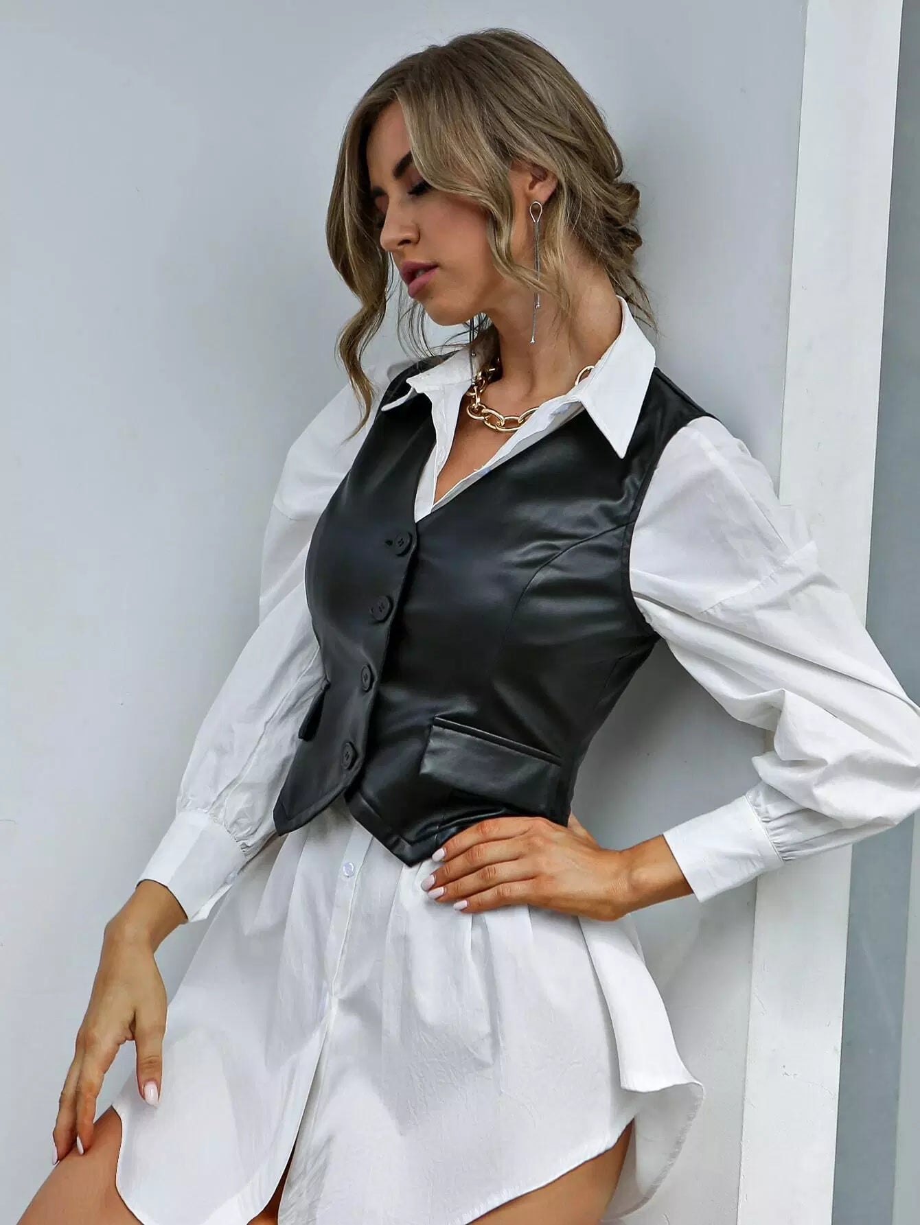 سترة بأزرار أمامية من جلد البولي يوريثان بأزرار من الأمام بدون فستان