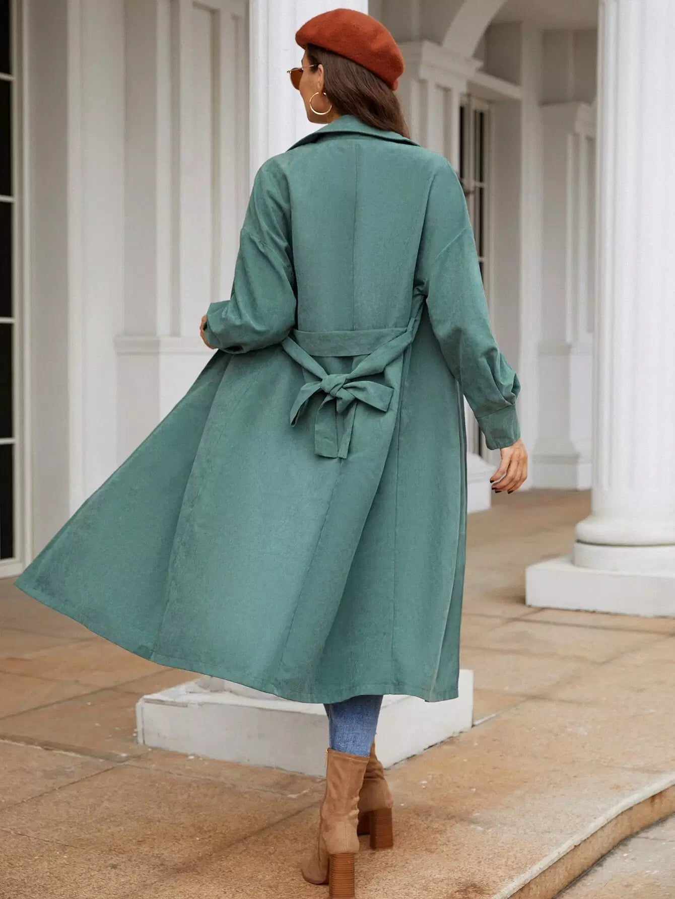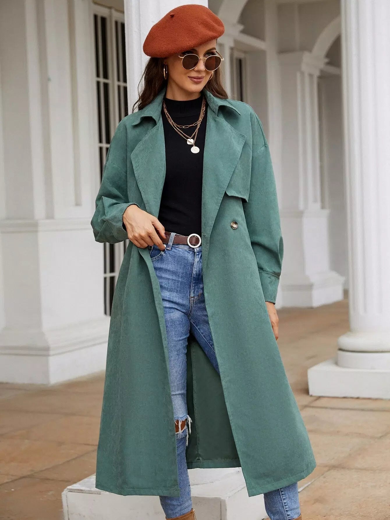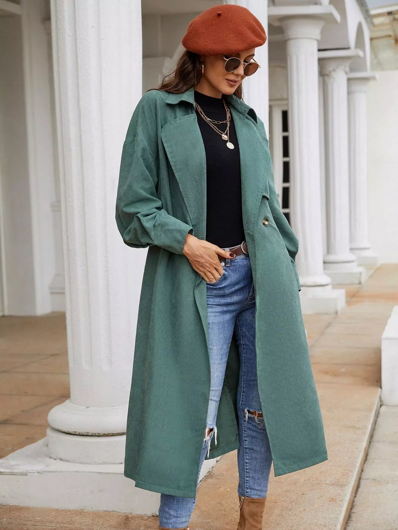 معطف واق من المطر بكتف منسدل وزر مزدوج بدون حزام