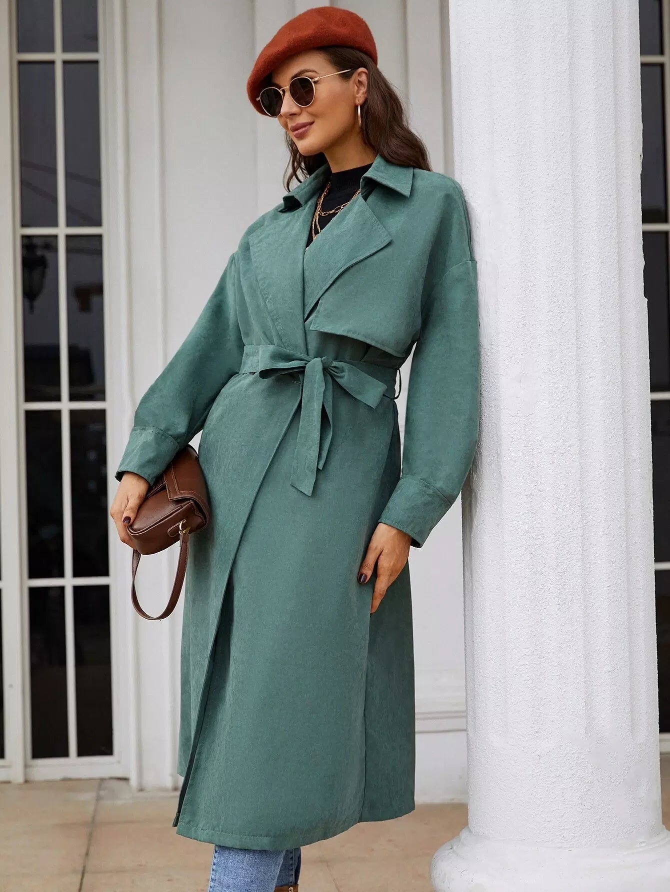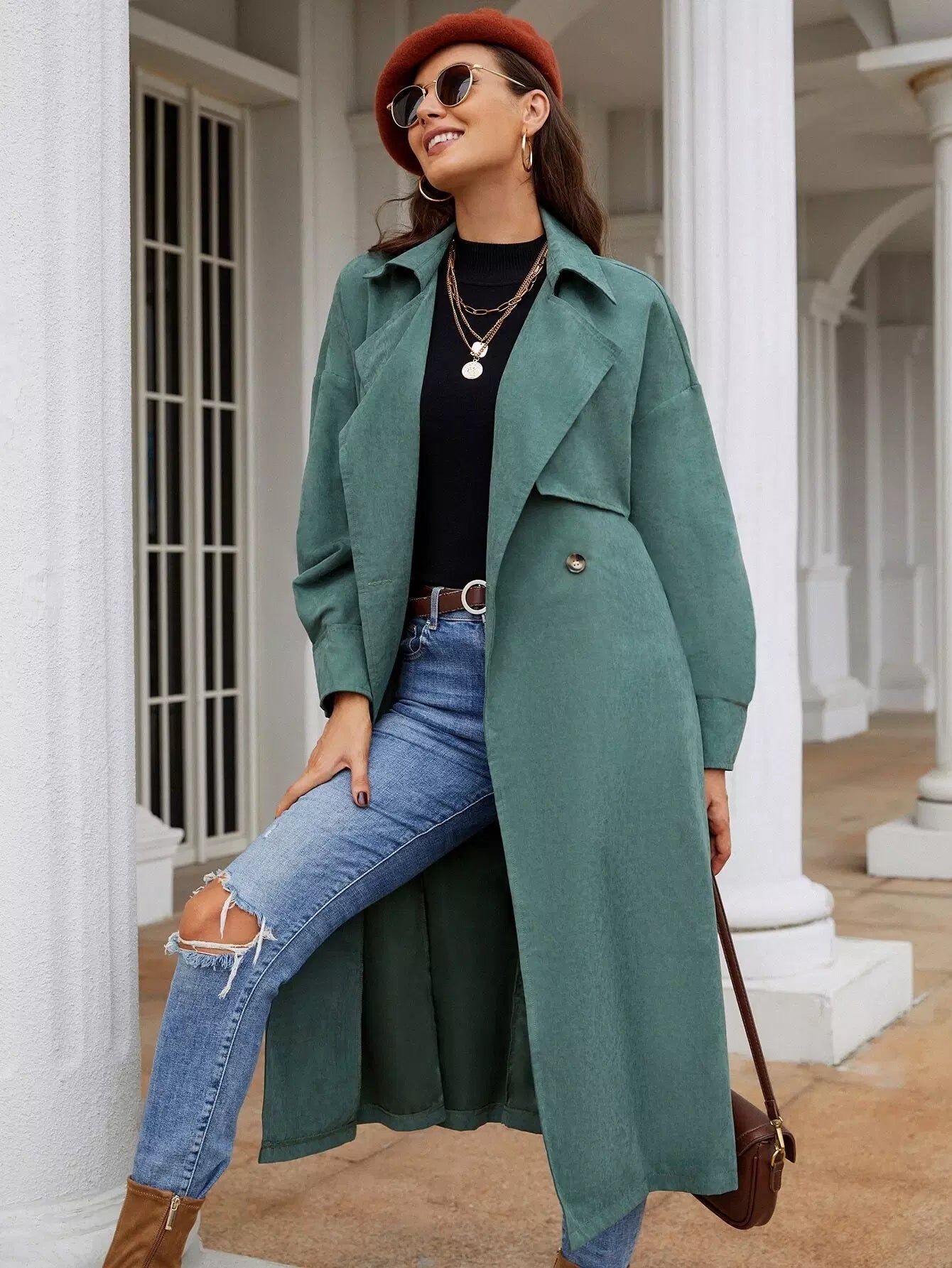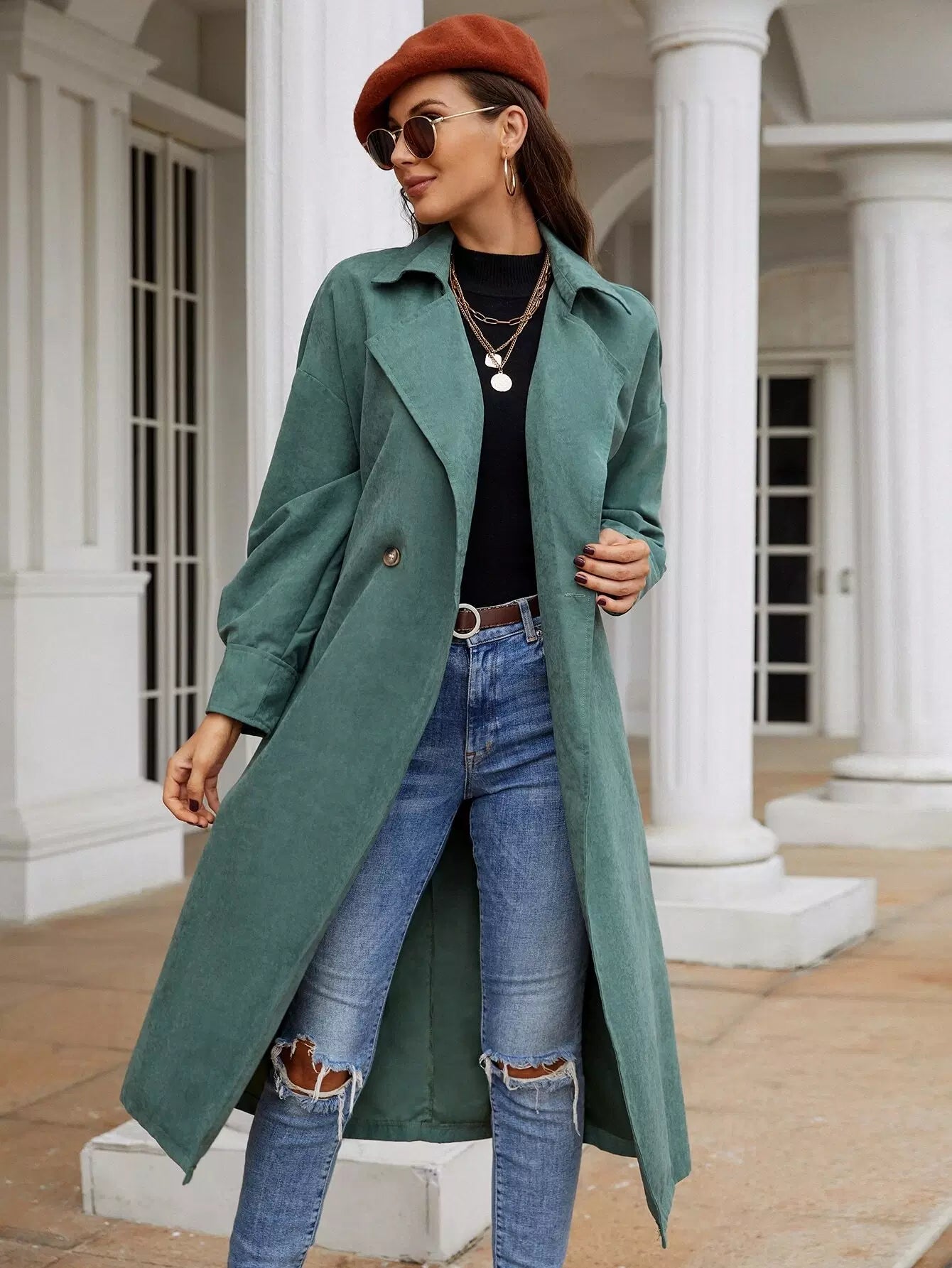 معطف واق من المطر بكتف منسدل وزر مزدوج بدون حزام