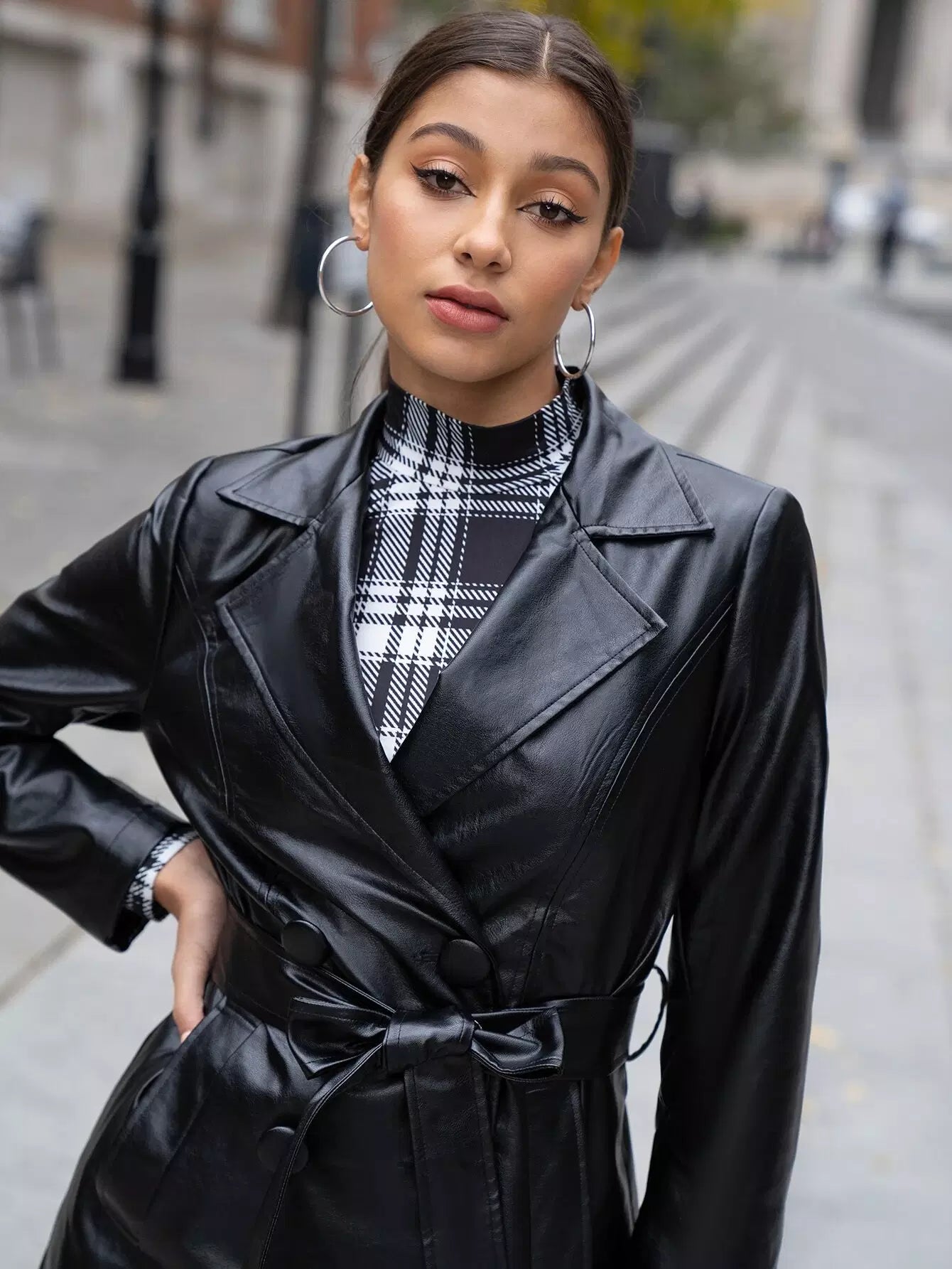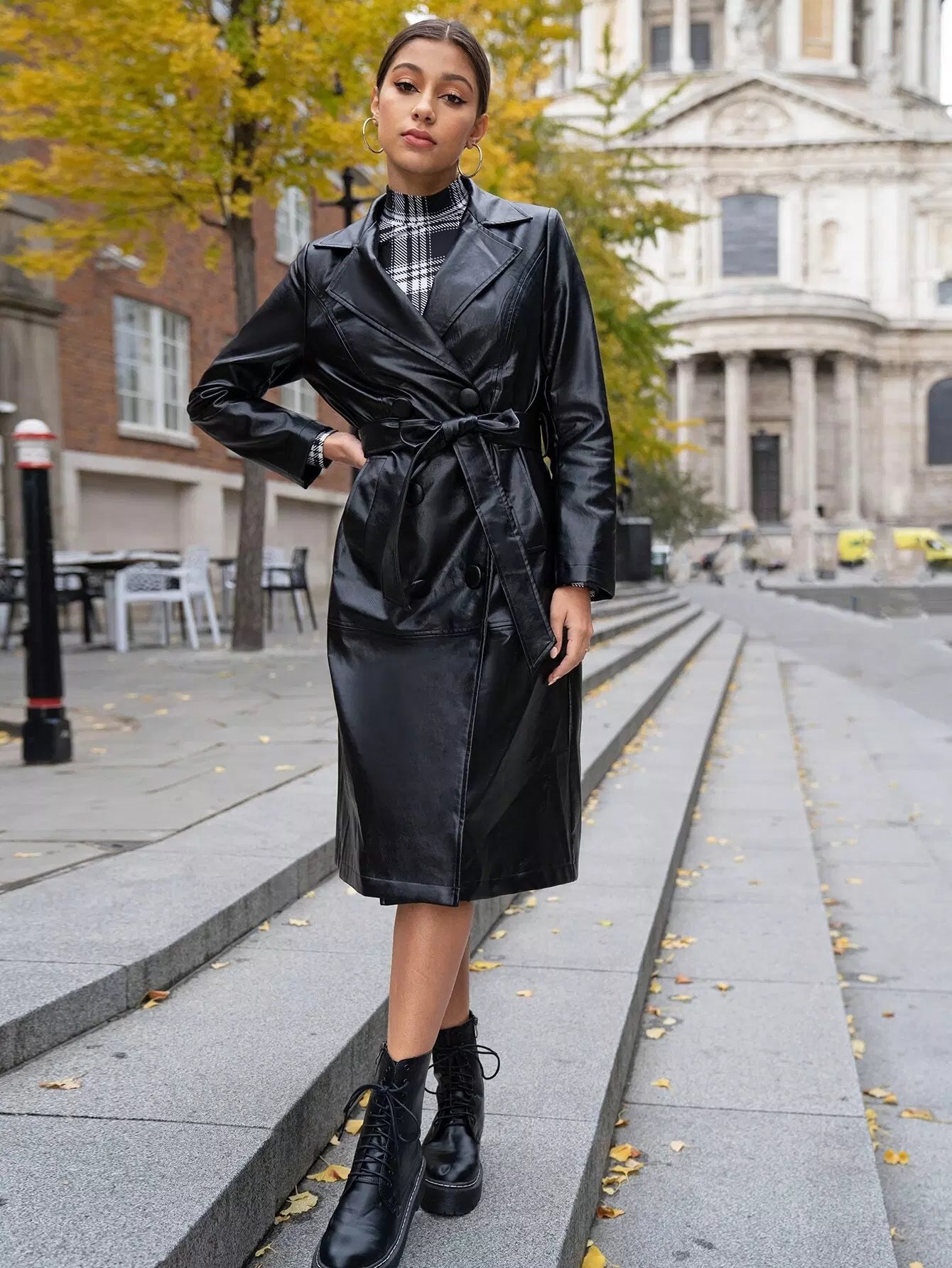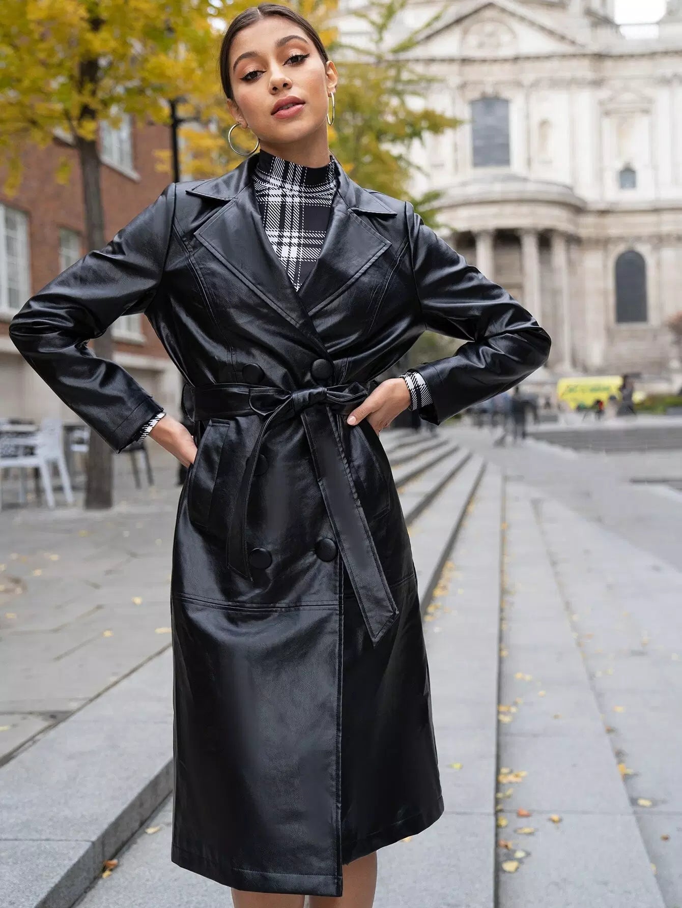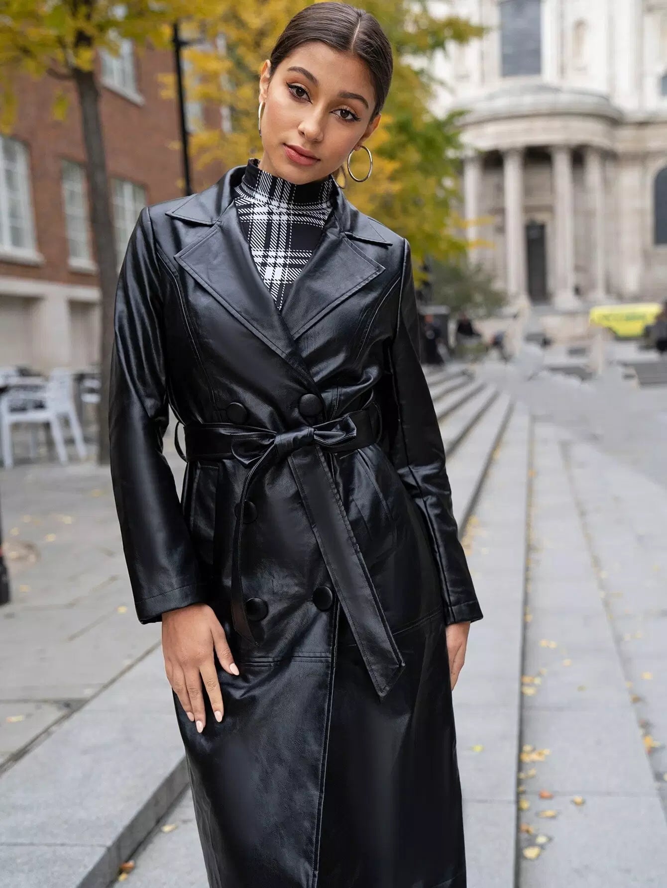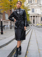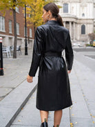 معطف من جلد البولي يوريثان بياقة ذات زر مزدوج بدون حزام