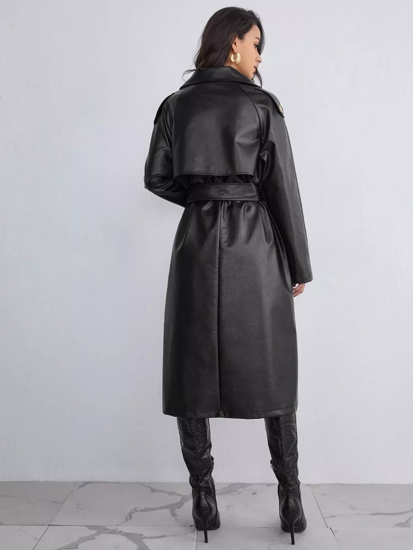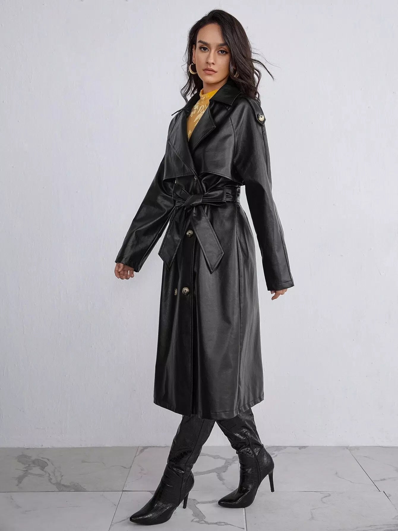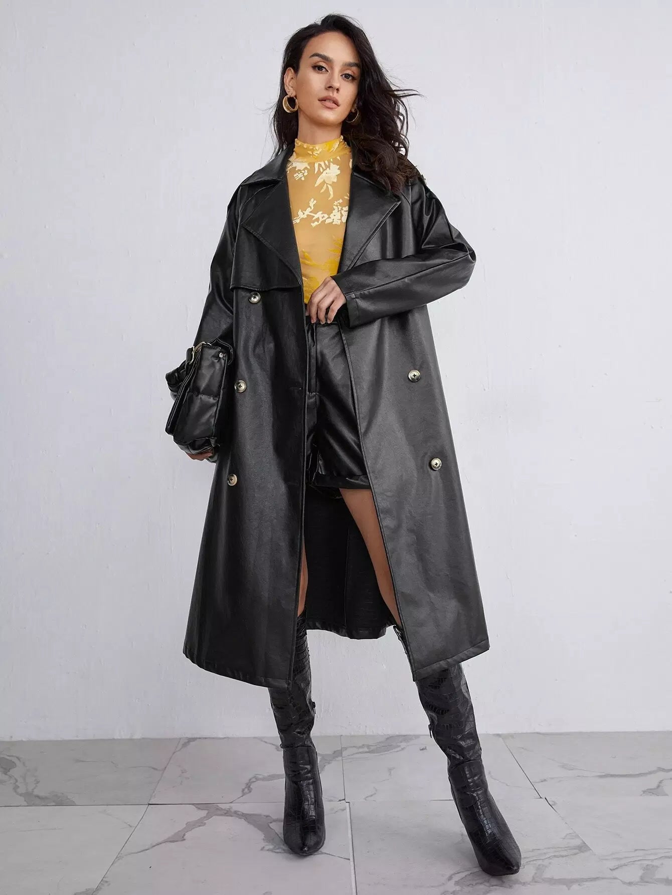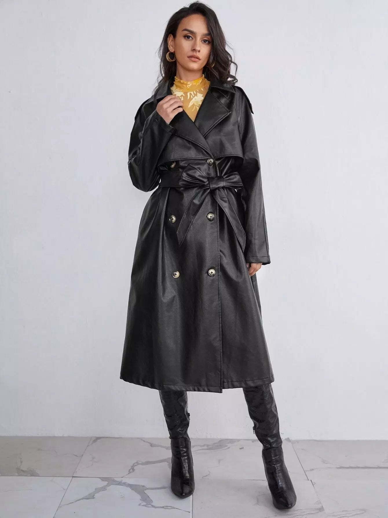 معطف واق من المطر من جلد البولي يوريثان بأكمام راجلان مزدوج الصدر بدون حزام