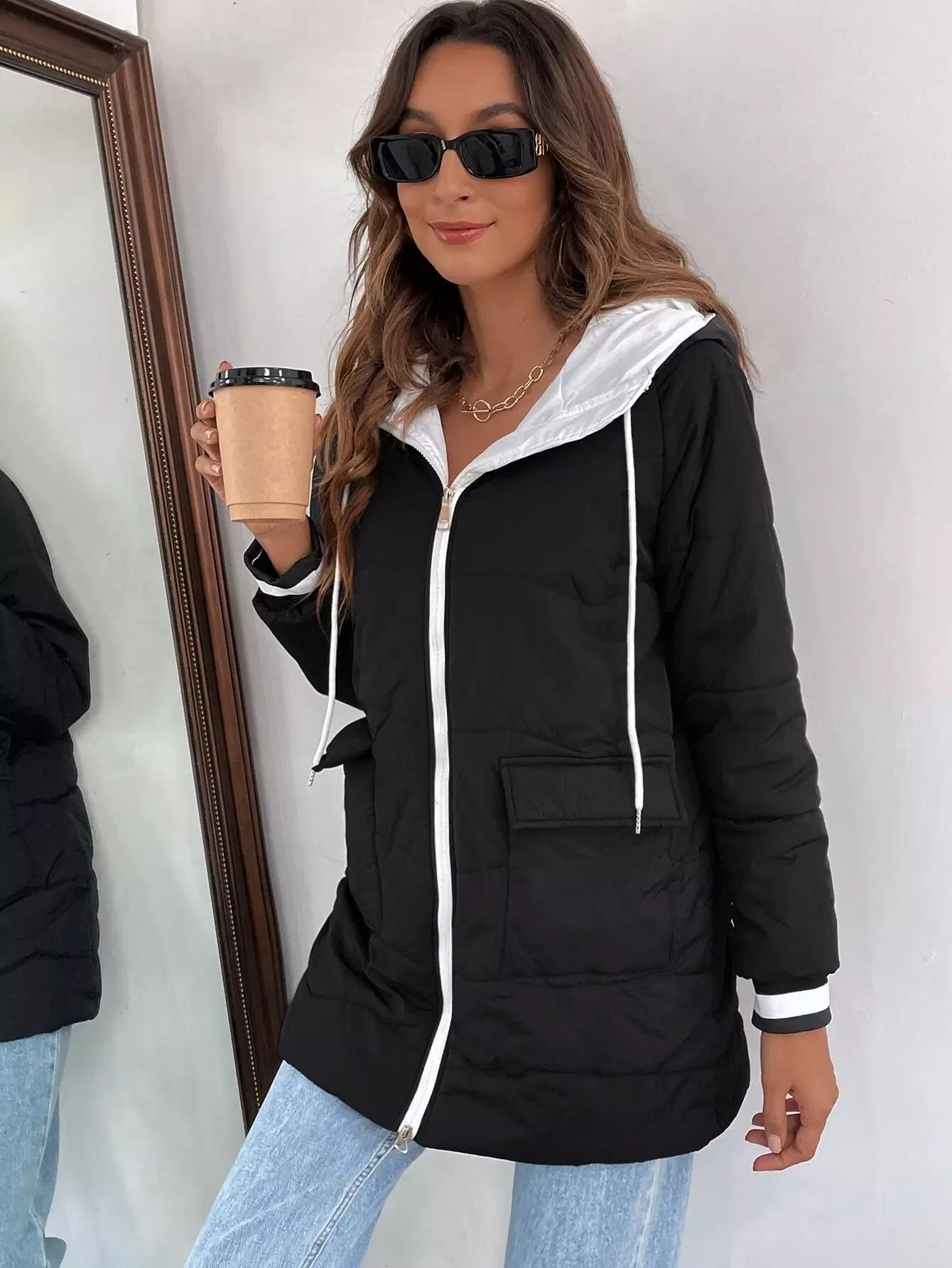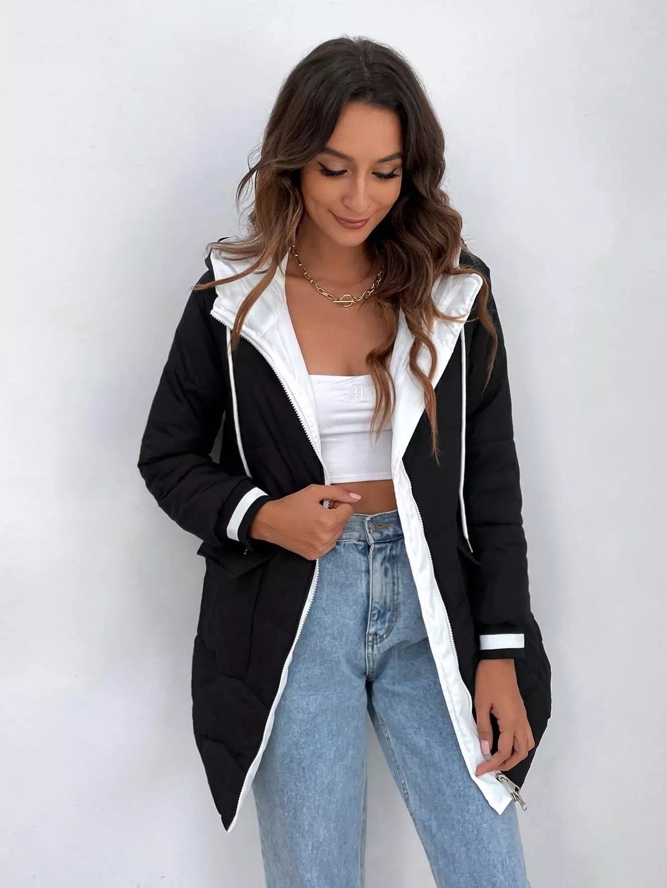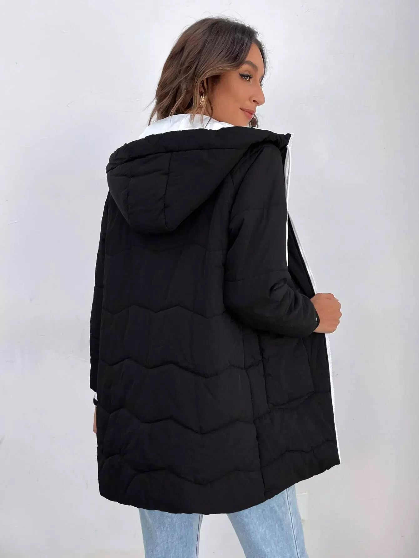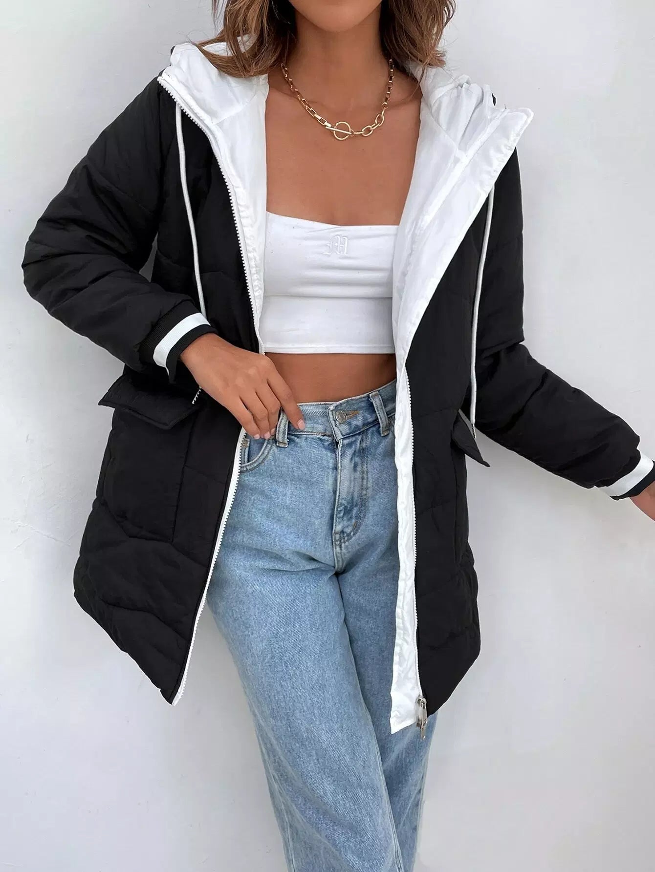 معطف منفوخ بغطاء رأس وجيب قابل للطي وسلك سحب مع لوحة متباينة اللون