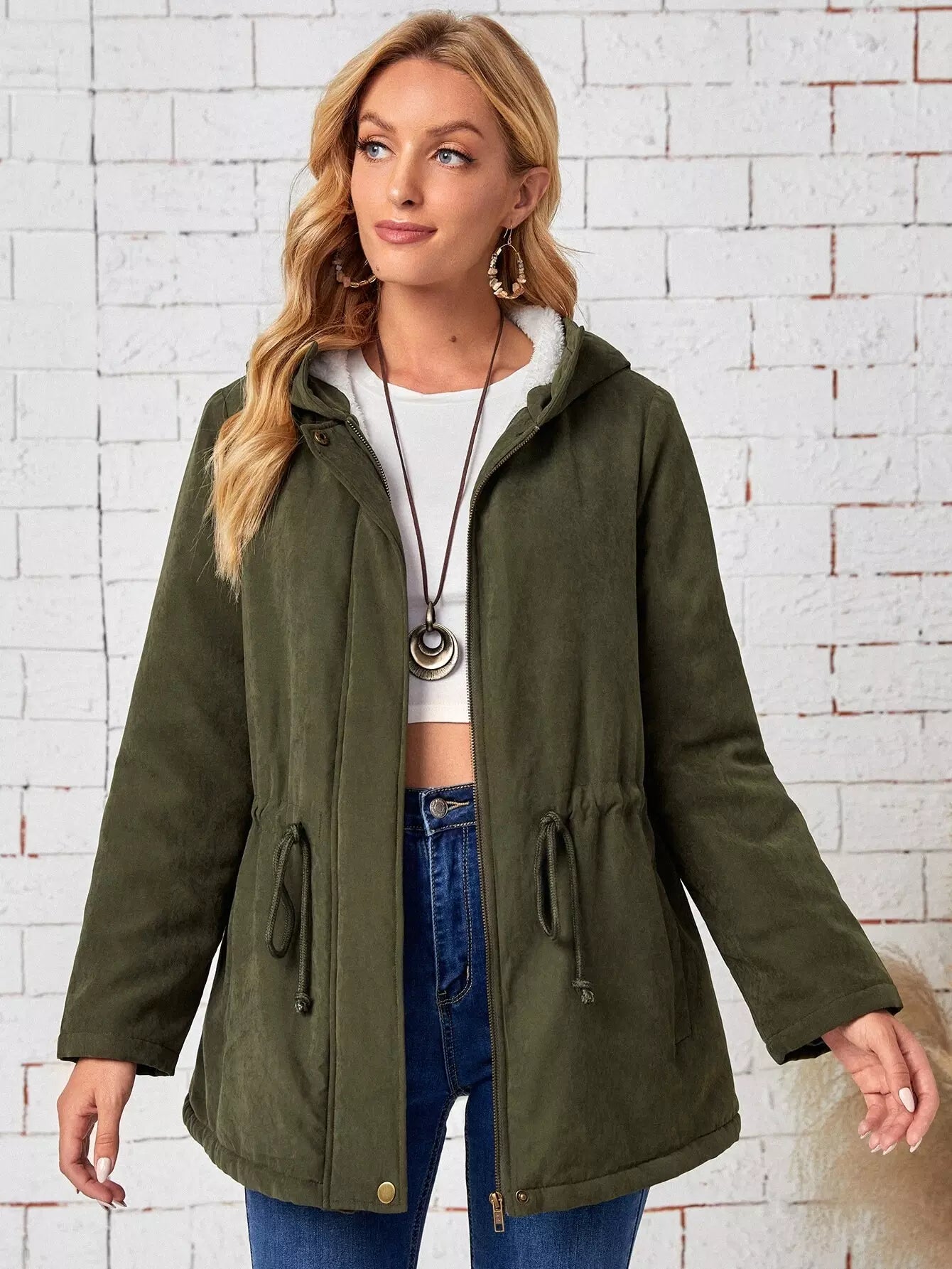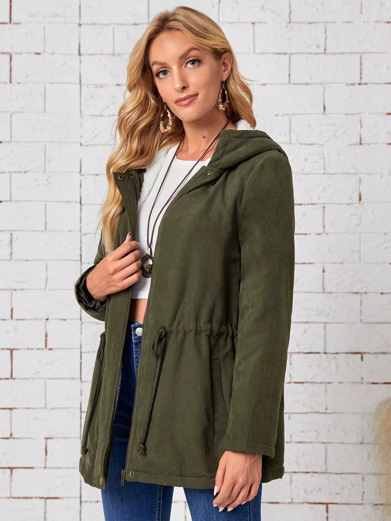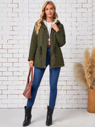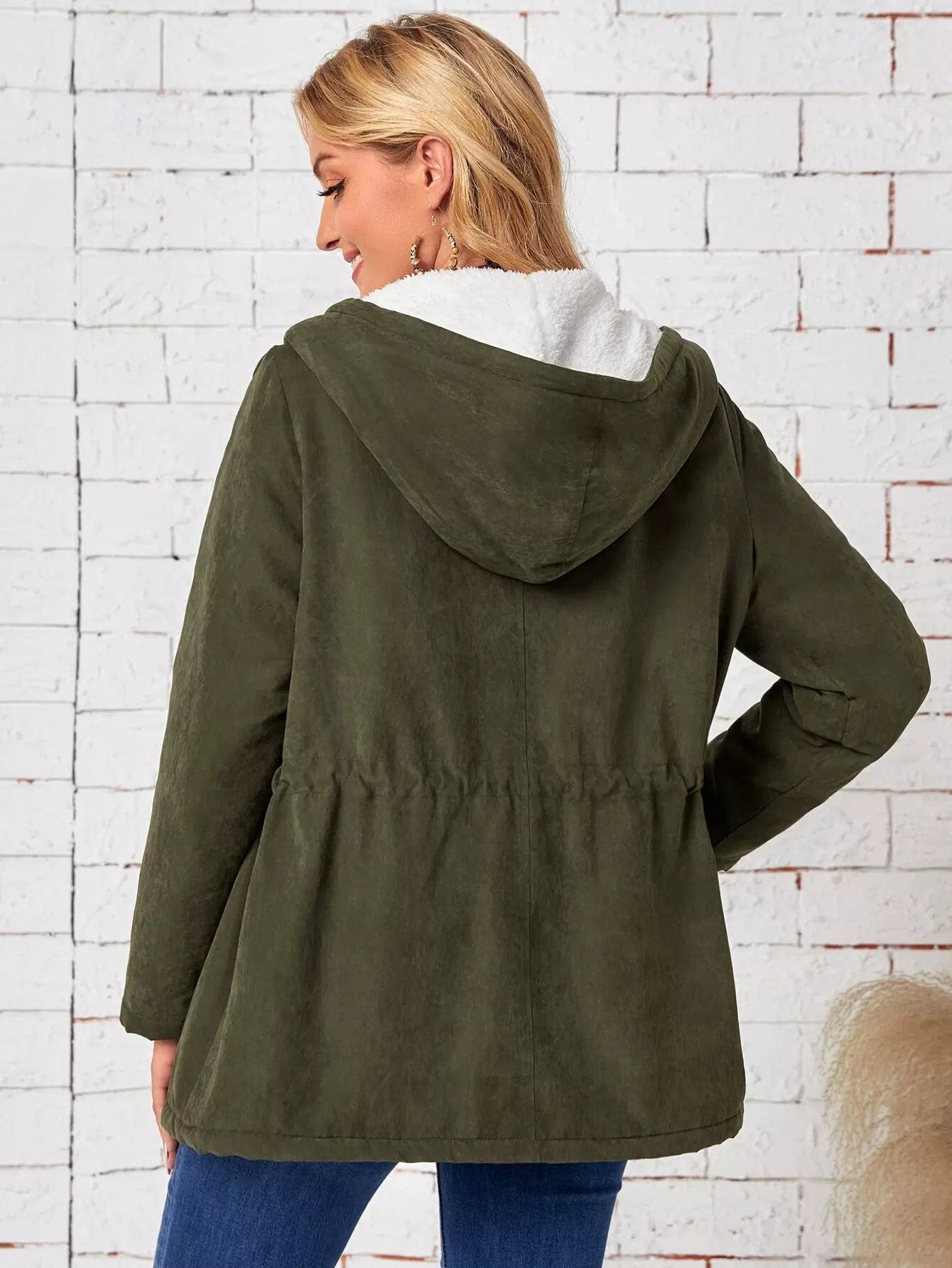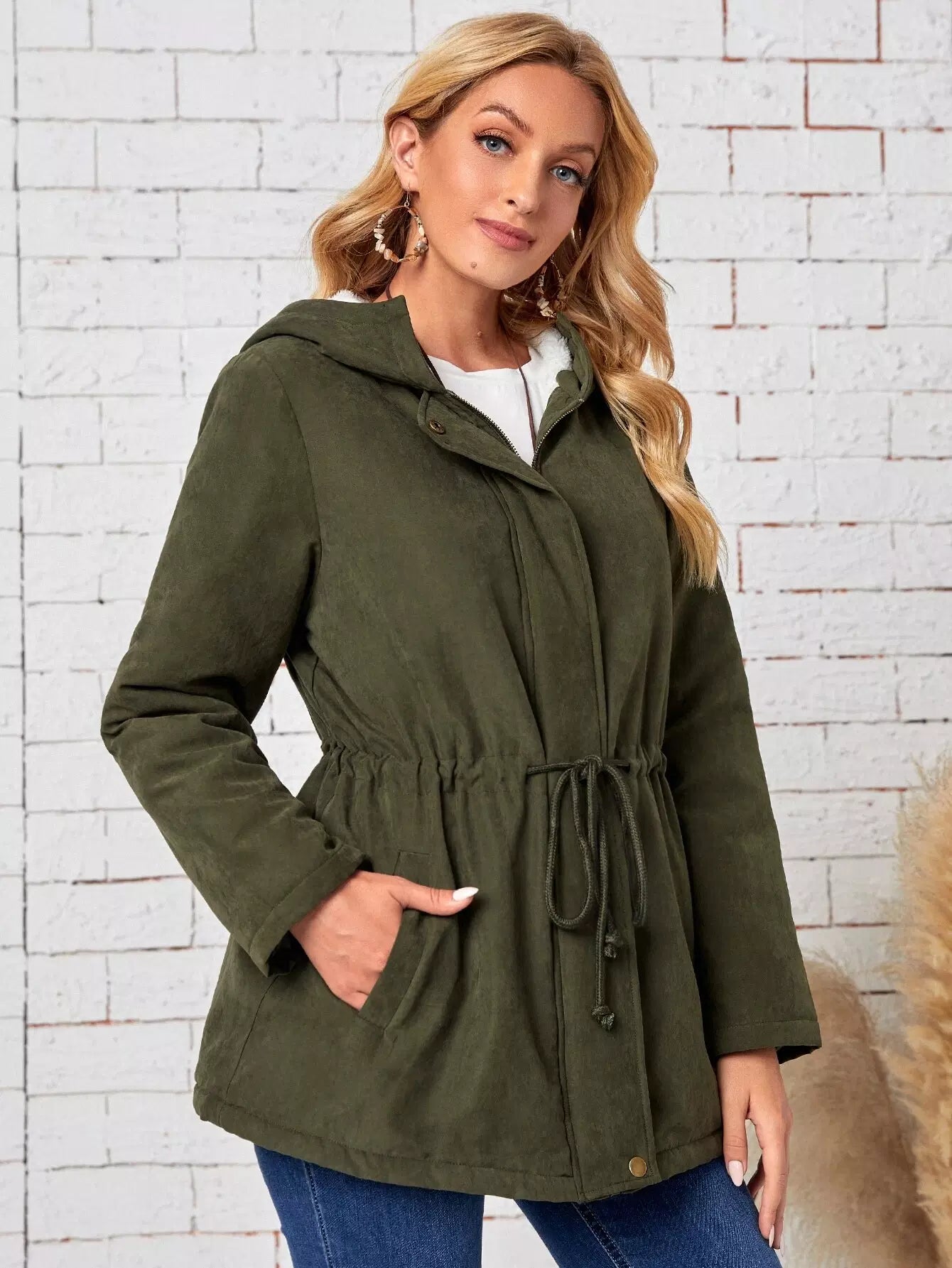 معطف شتوي مبطن بغطاء للرأس ومزود بسحّاب ورباط على الخصر وأزرار كبس