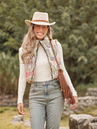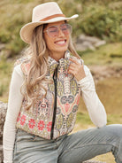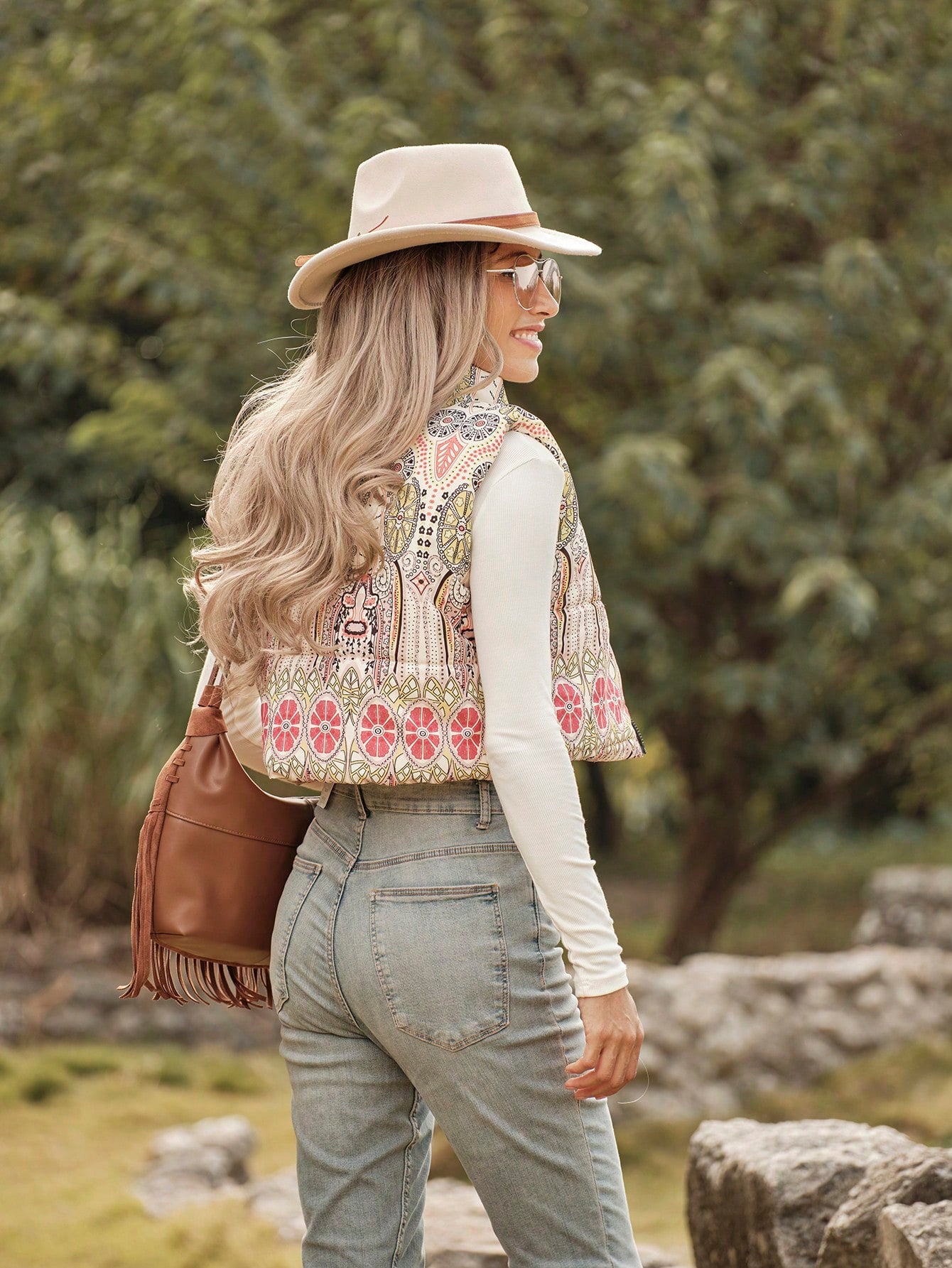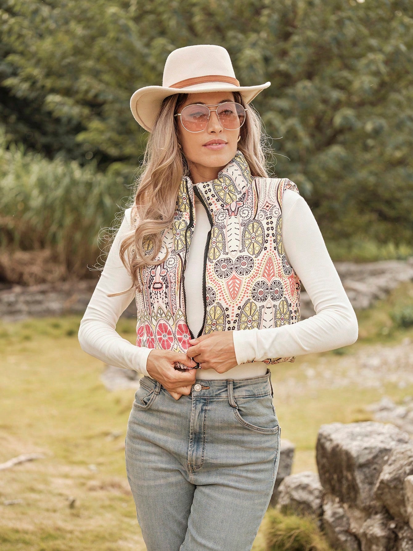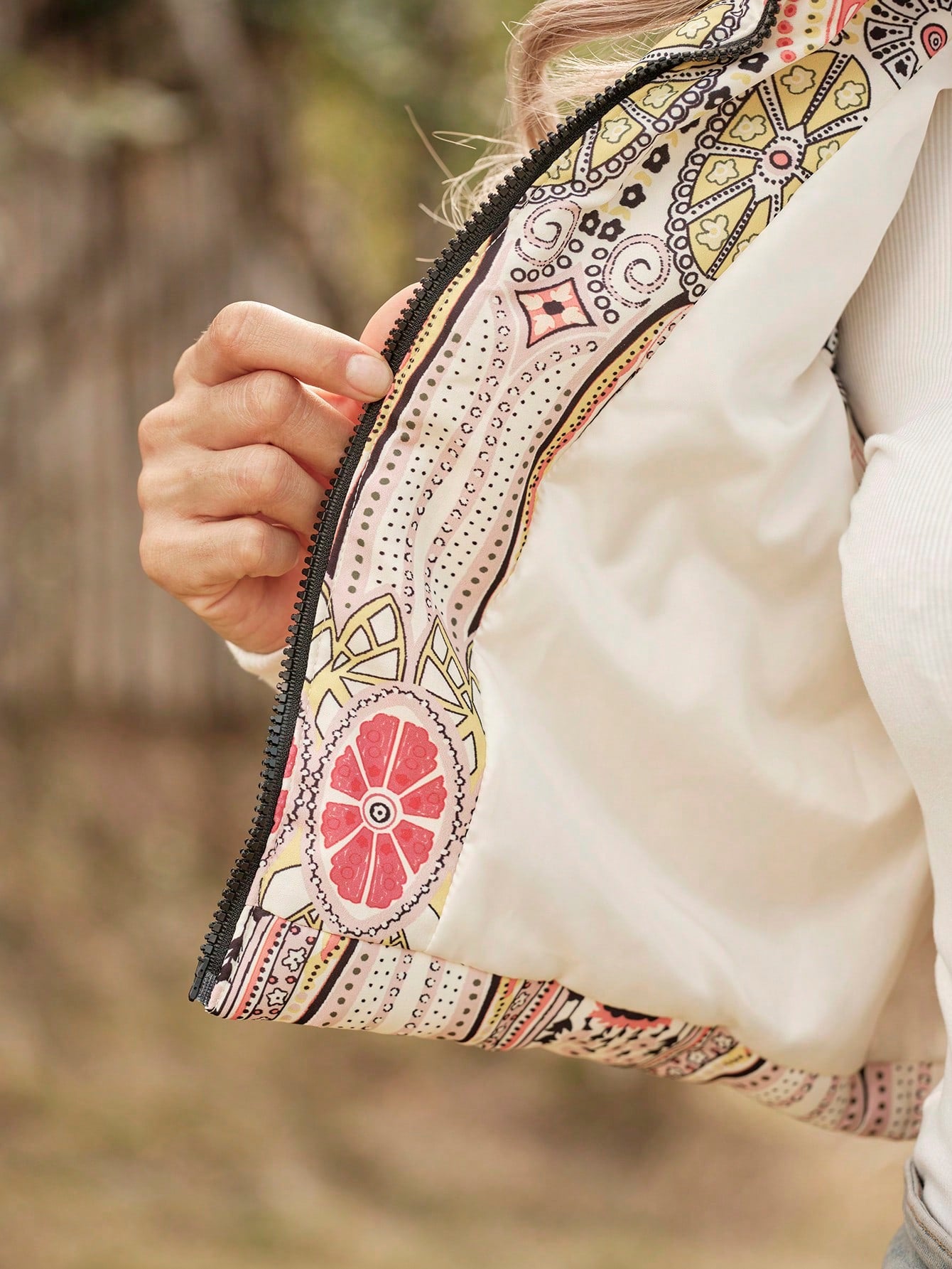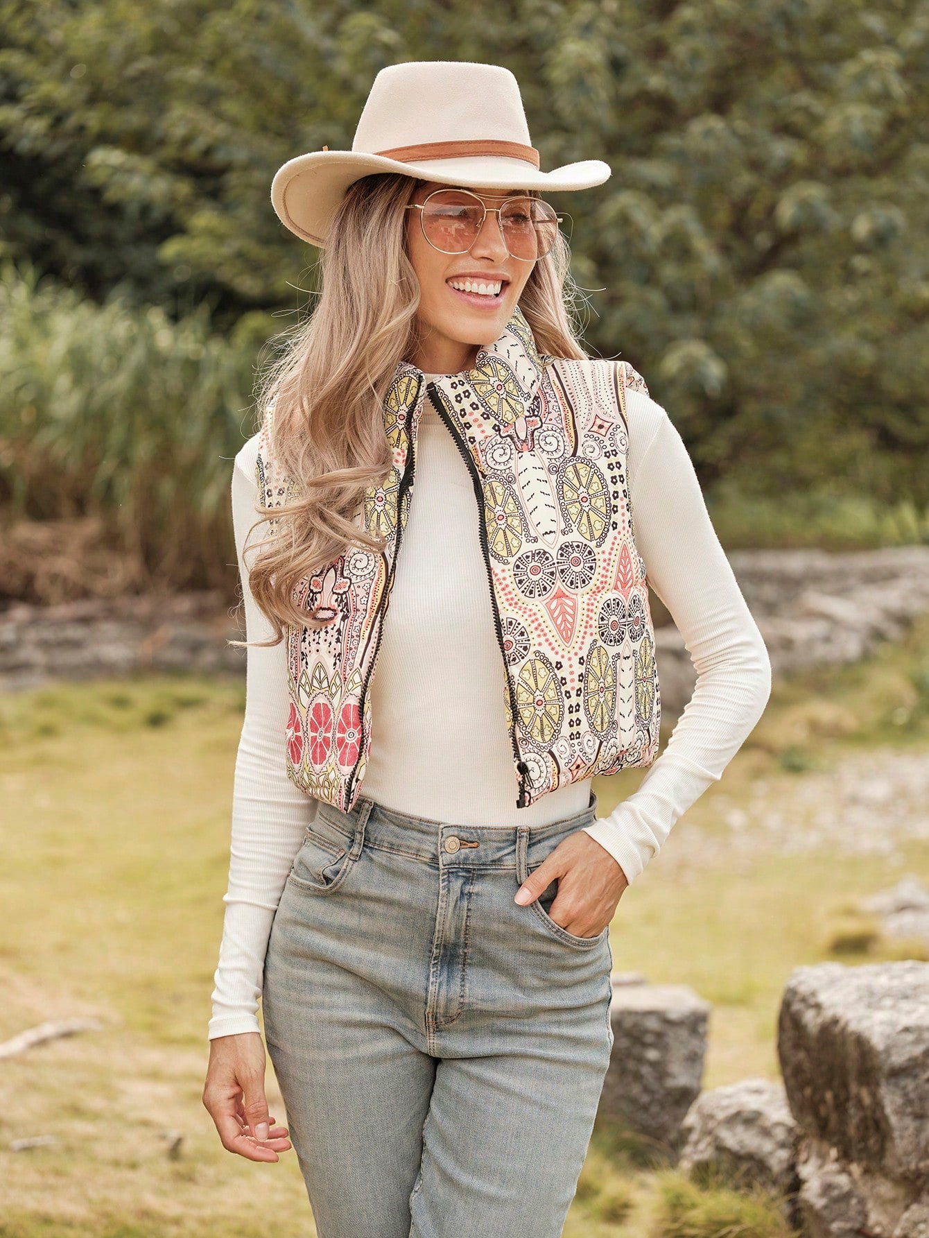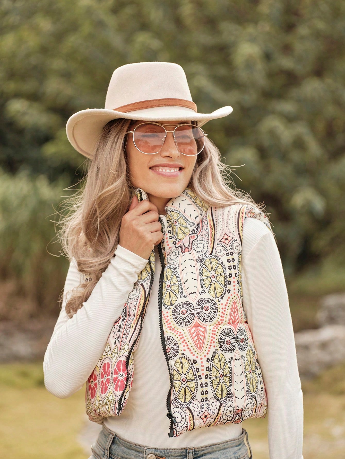 LanaWest Women Front Zip Up Sleeveless Allover Print Winter Jacket, Casual For Daily Wear