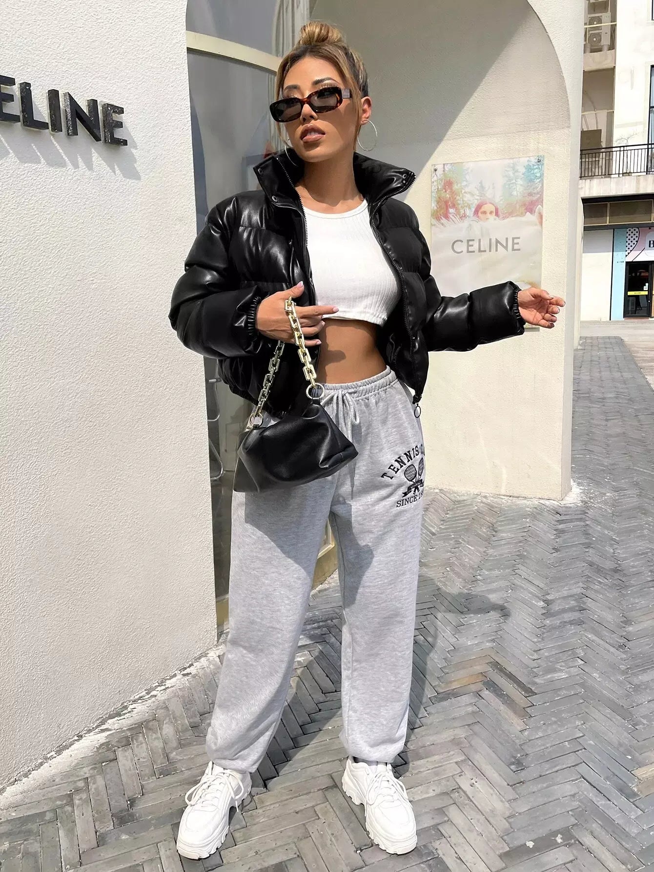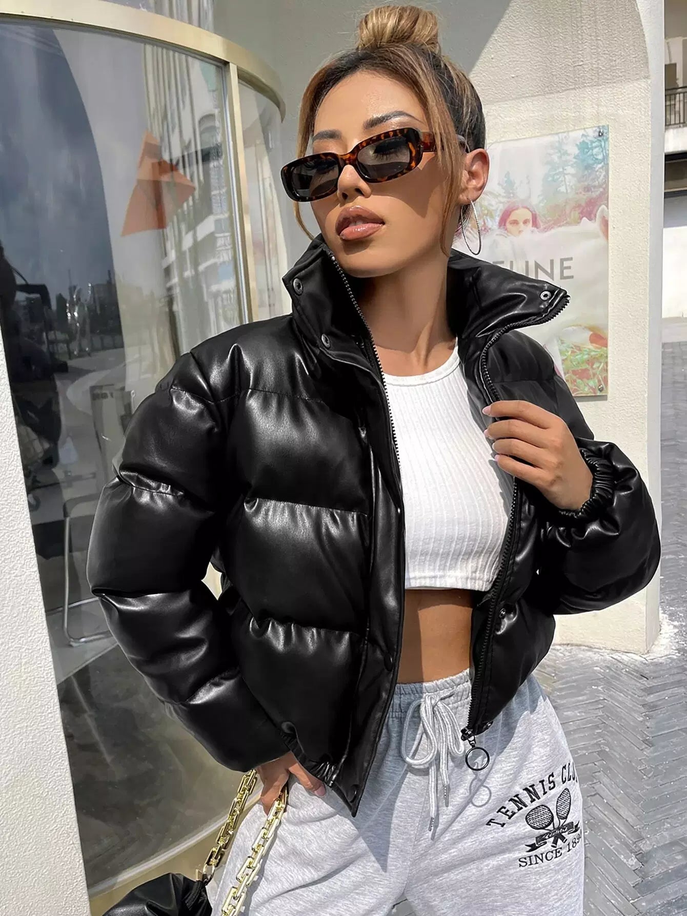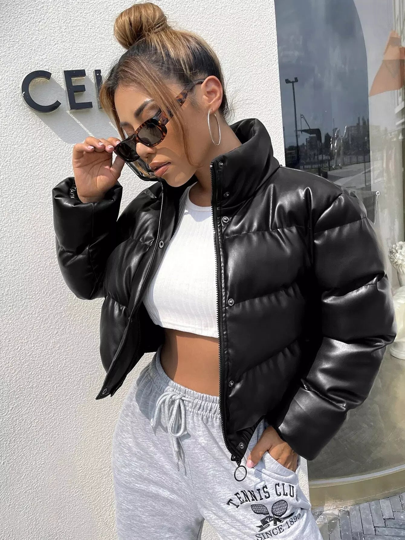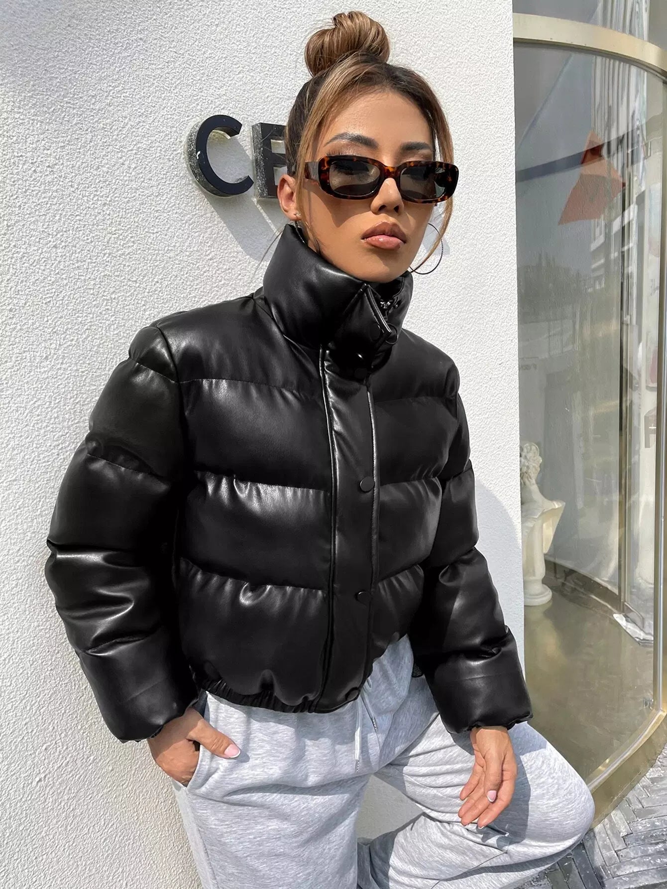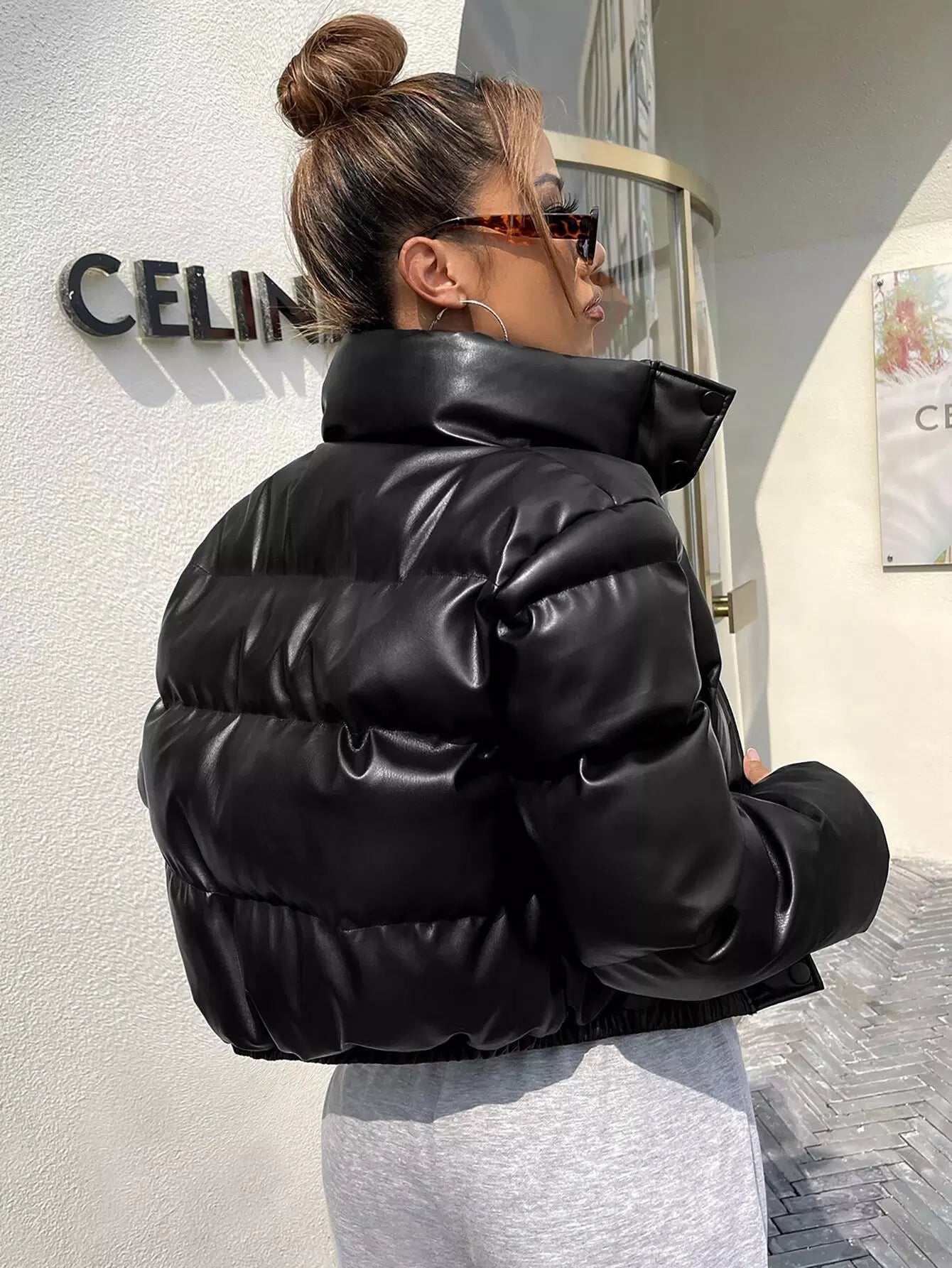 معطف قصير من الجلد الصناعي مزود بسحاب وأزرار كبس