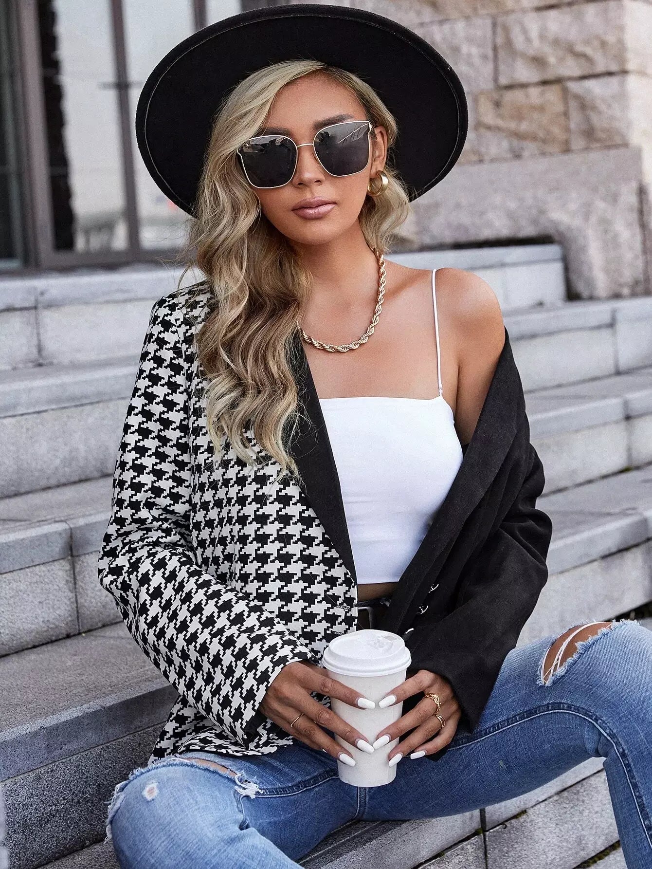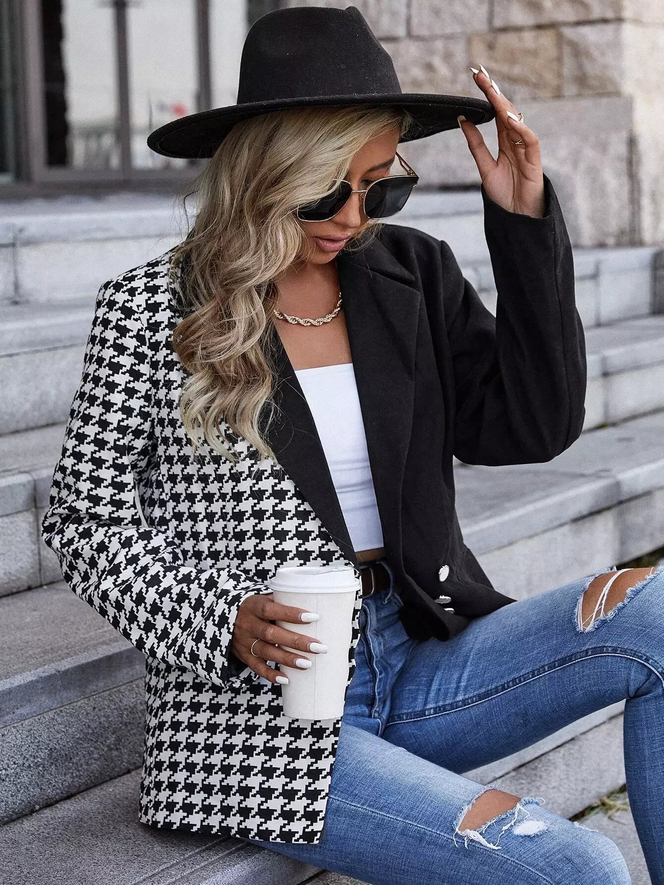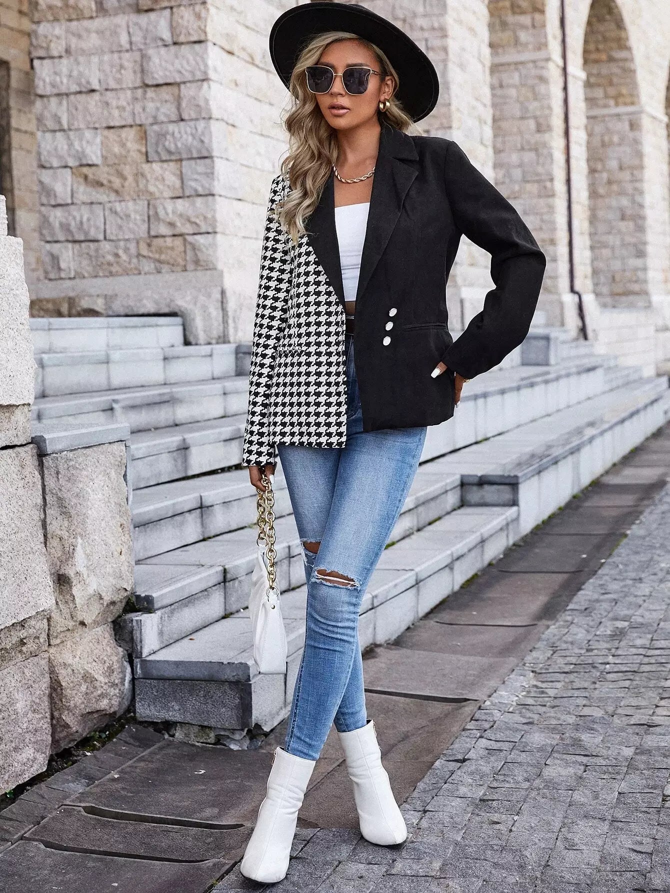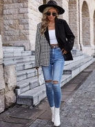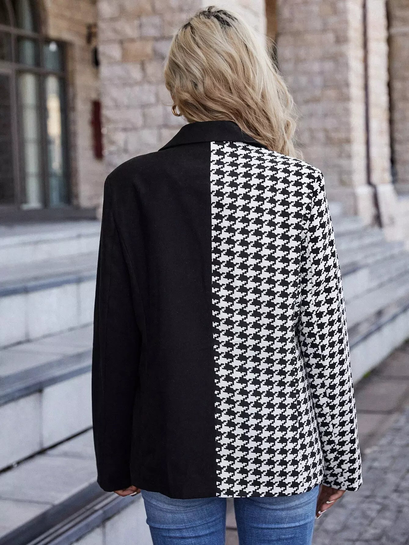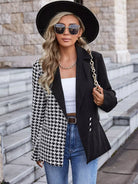 Houndstooth Lapel Collar Button Detail Blazer