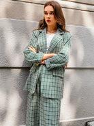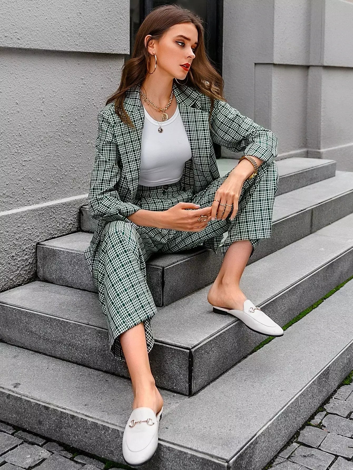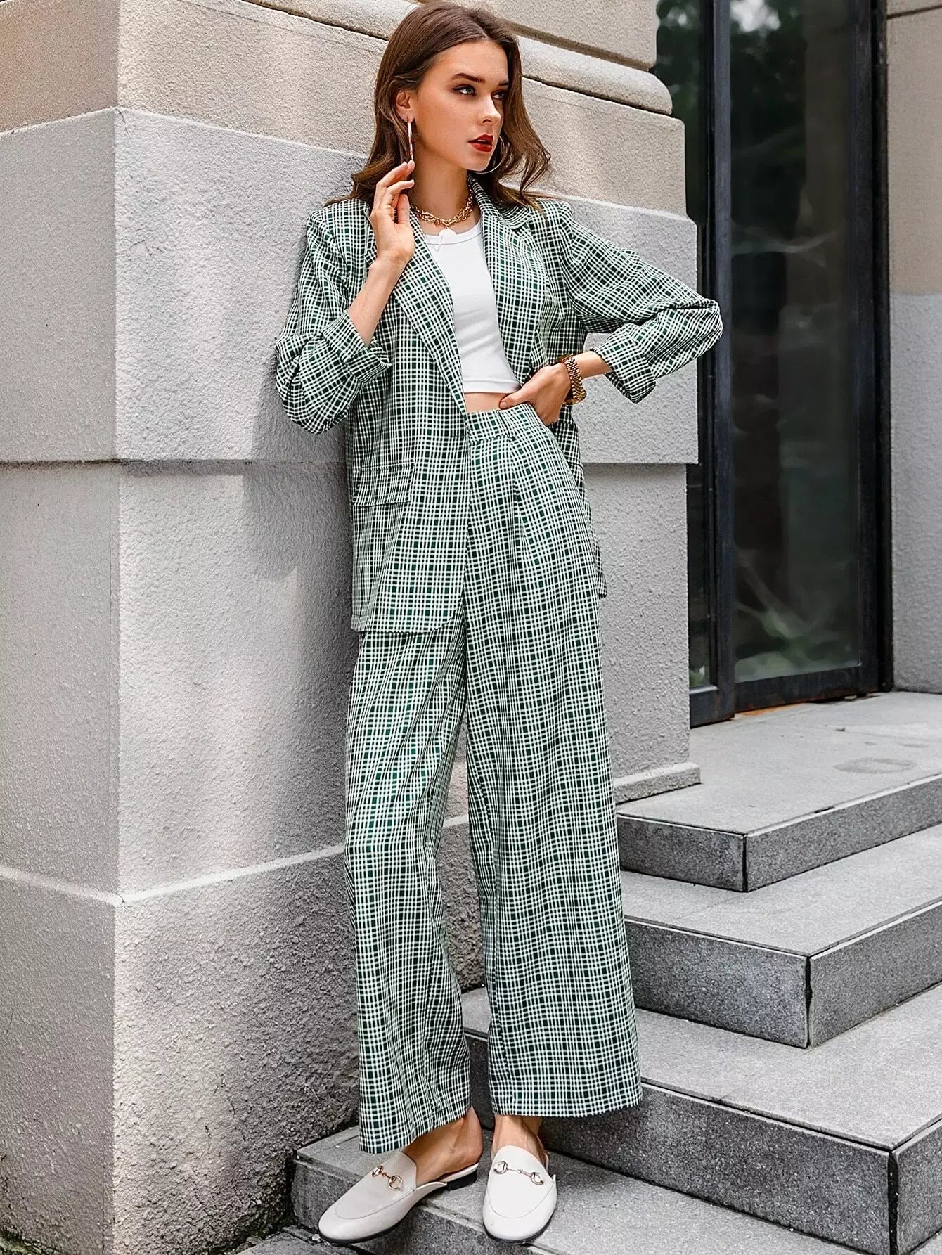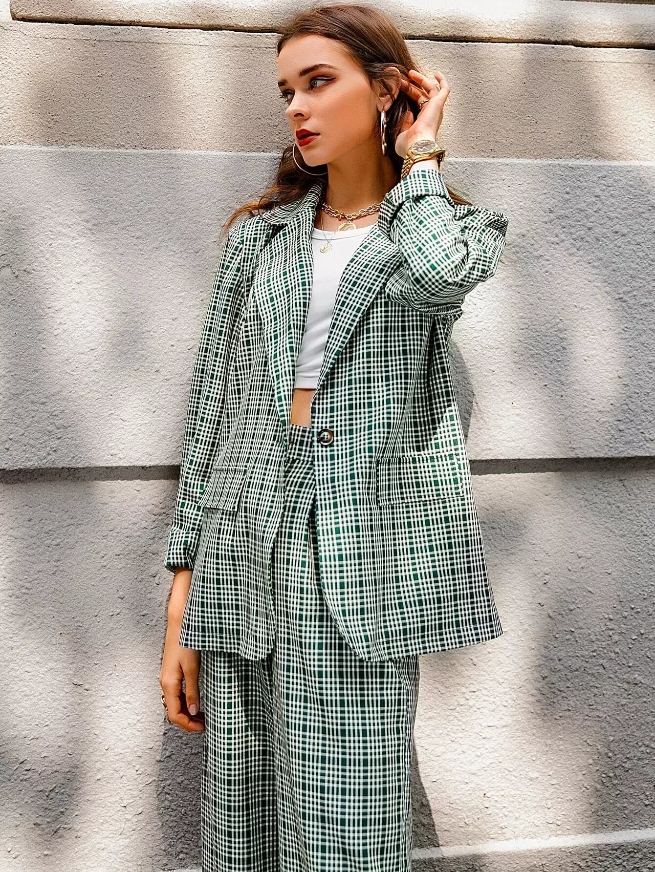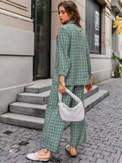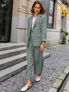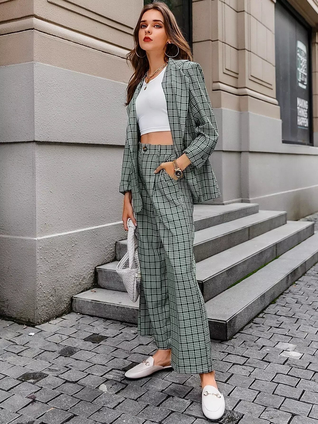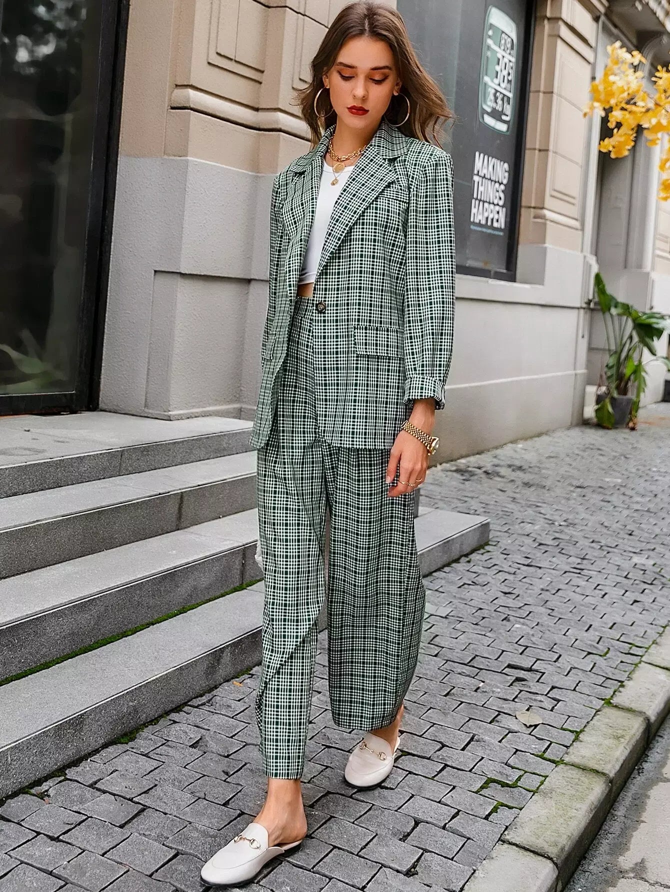 للنساء - طقم سترة وسروال منقوش بزر واحد