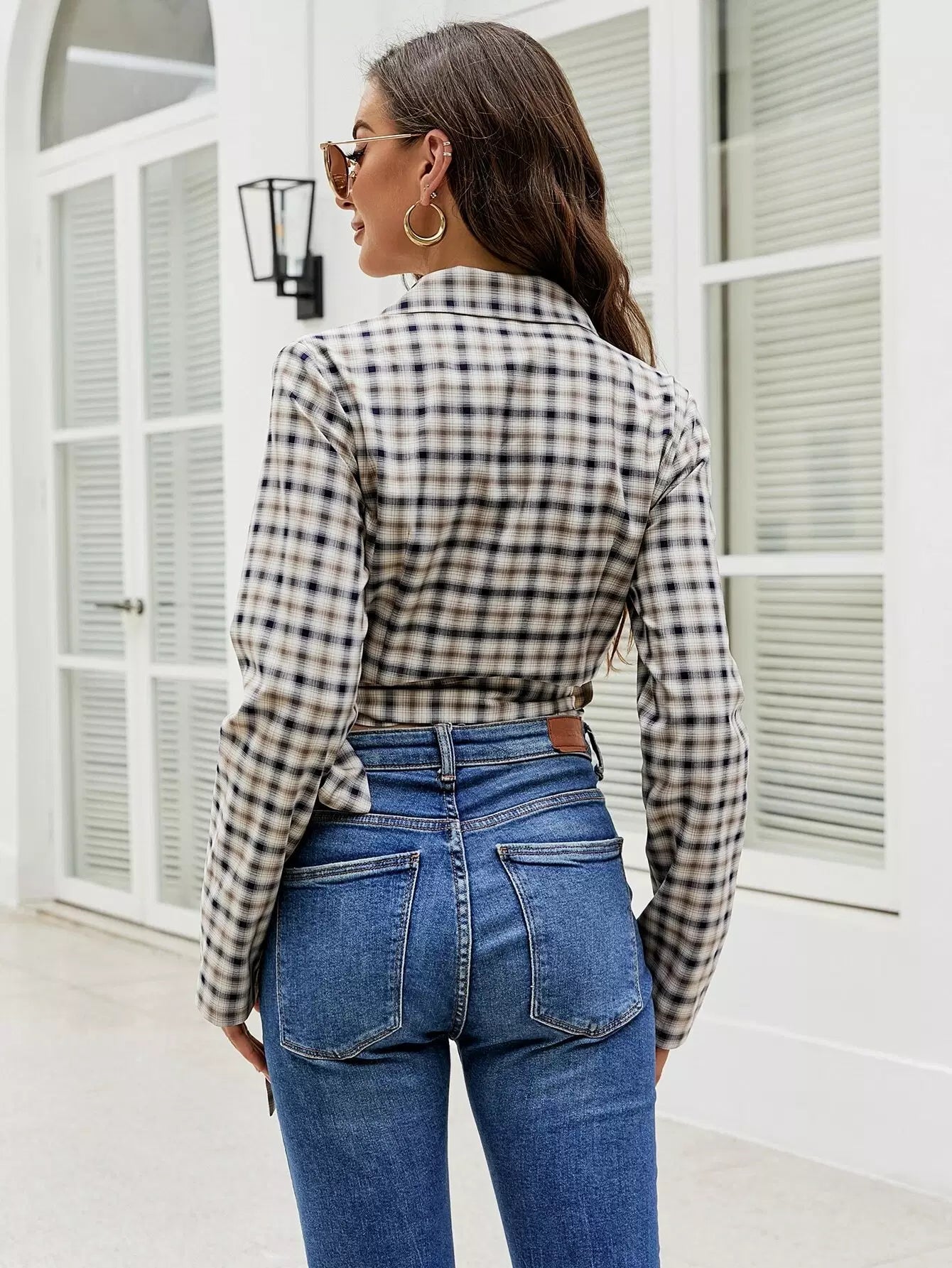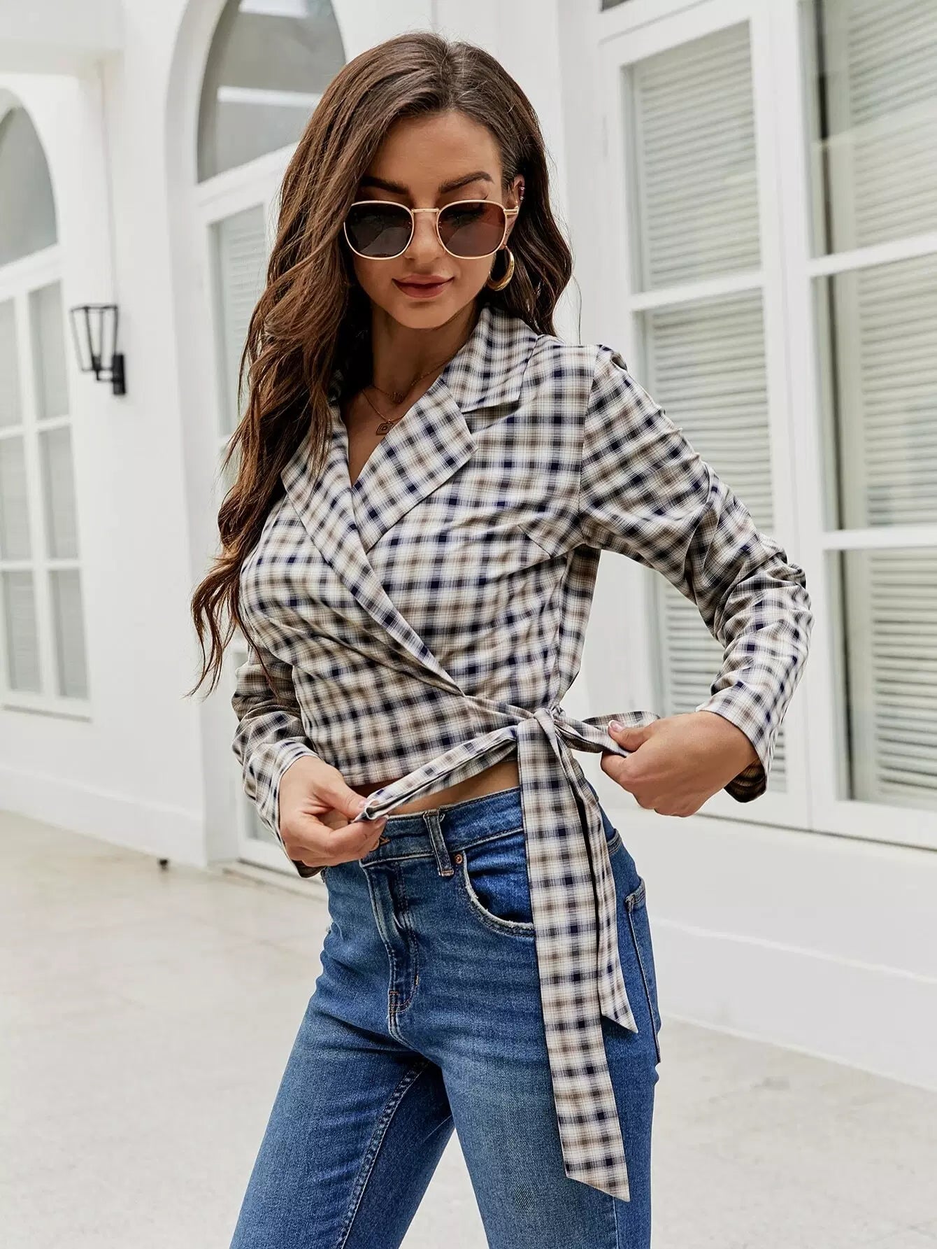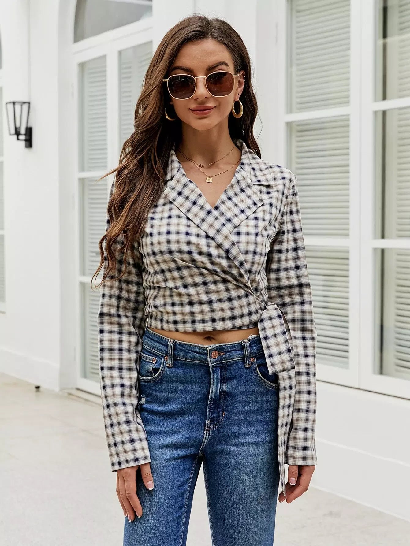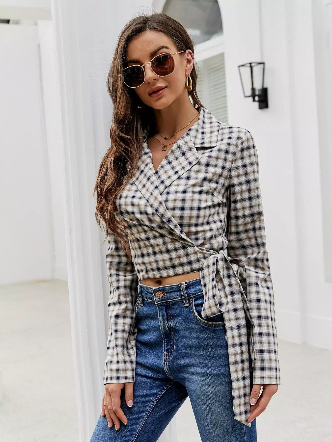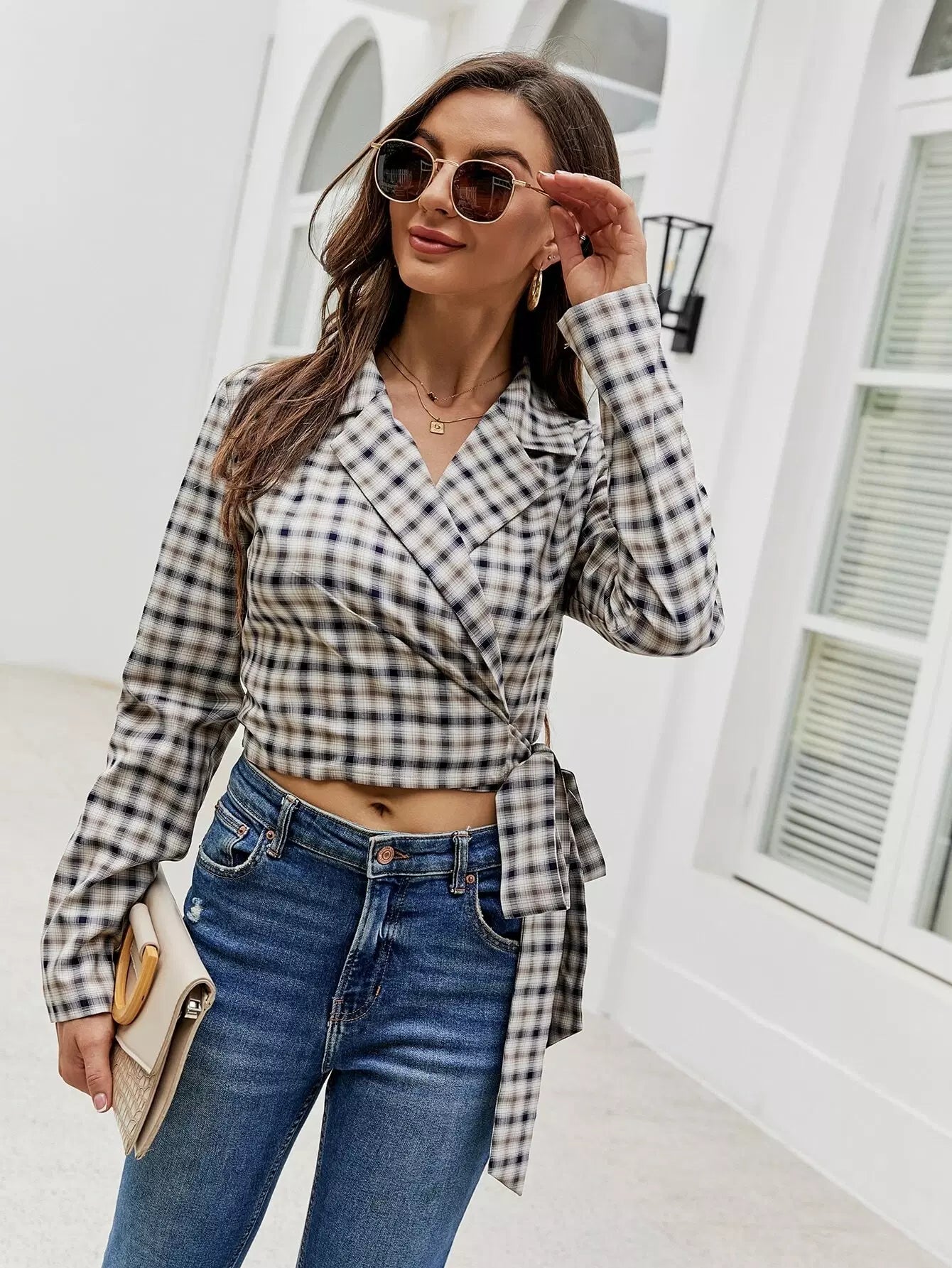 سترة منقوشة بياقة منقوشة بياقة منقوشة بربطة عنق جانبية ملفوفة