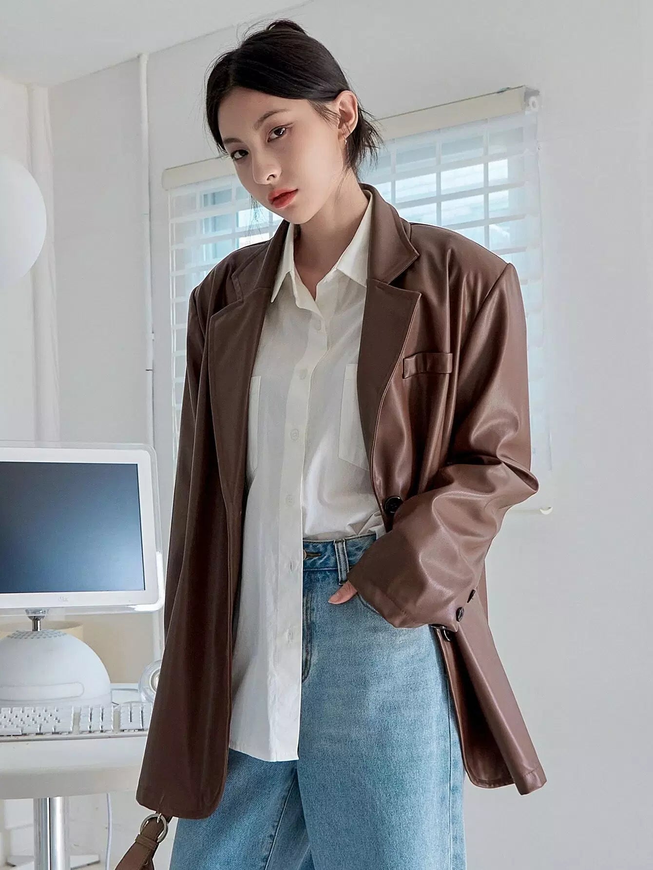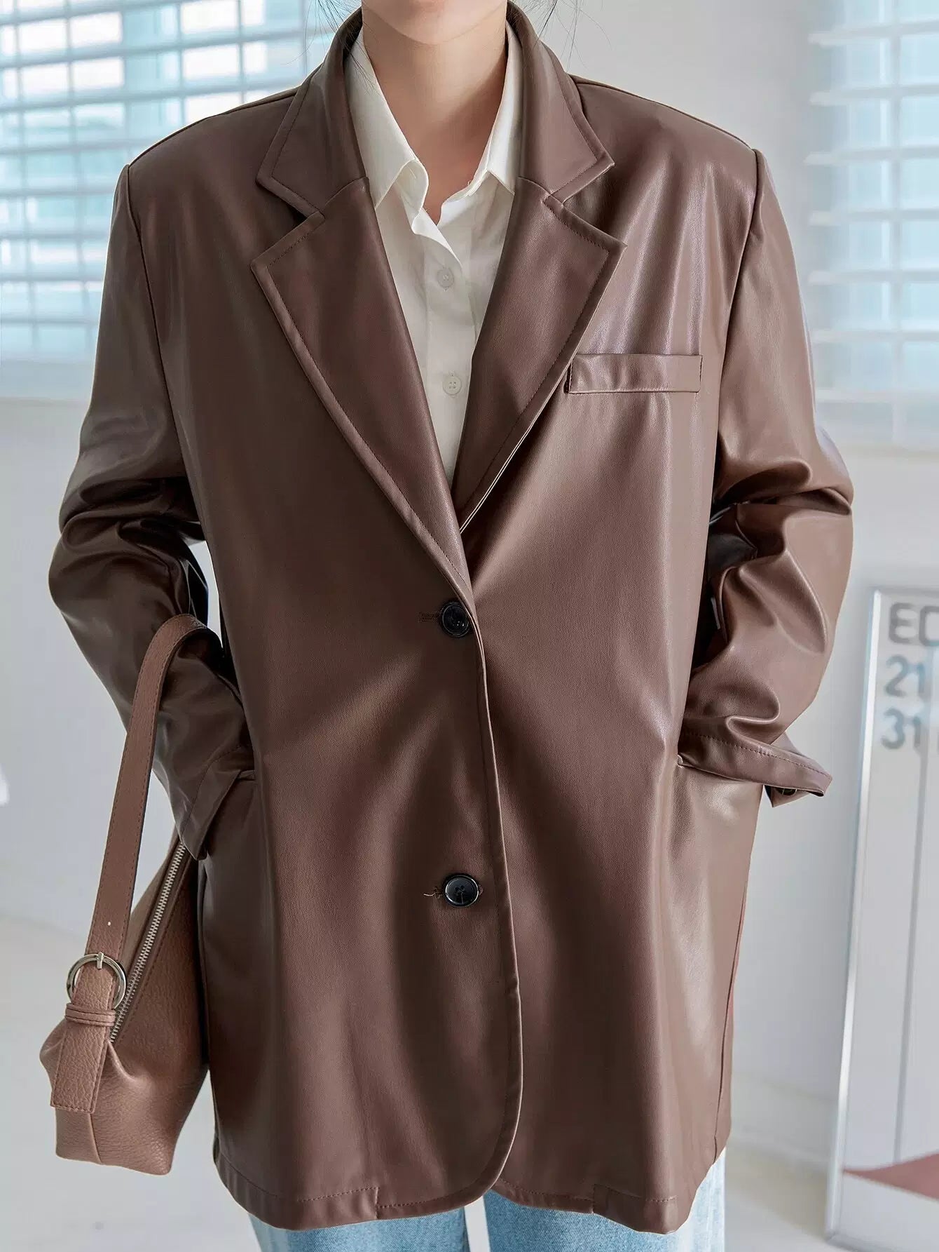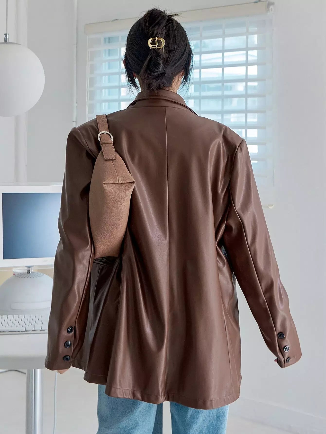 سترة من الجلد الصناعي مع ياقة مطوية وجيوب
