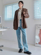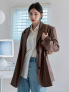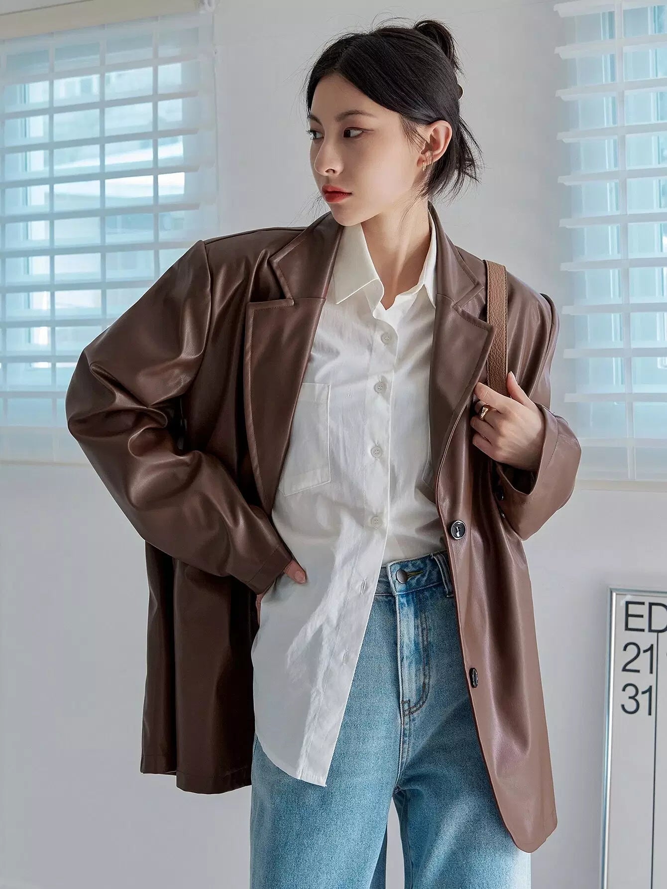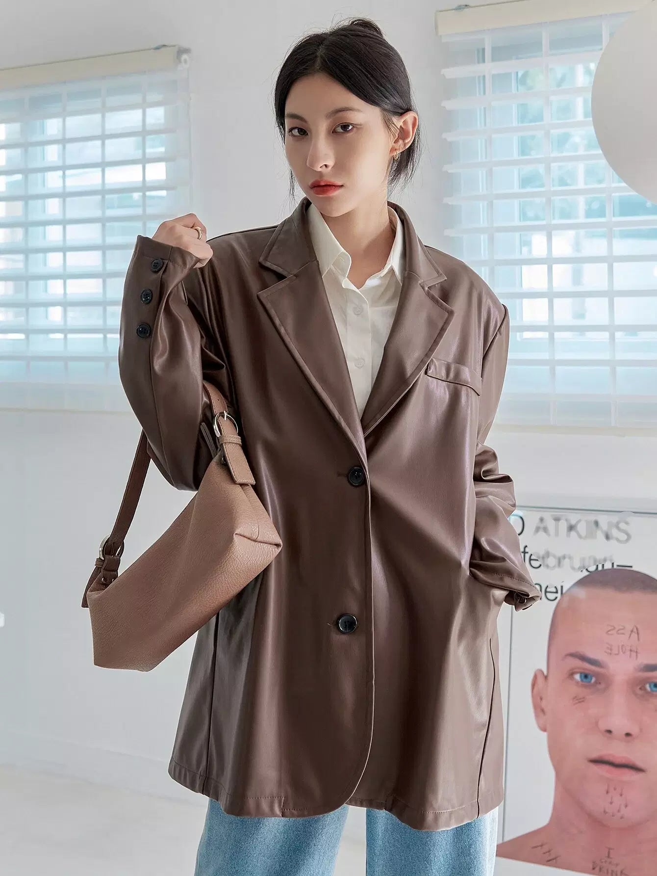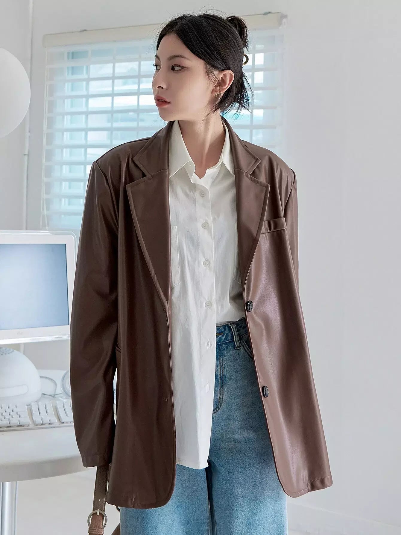 سترة من الجلد الصناعي مع ياقة مطوية وجيوب