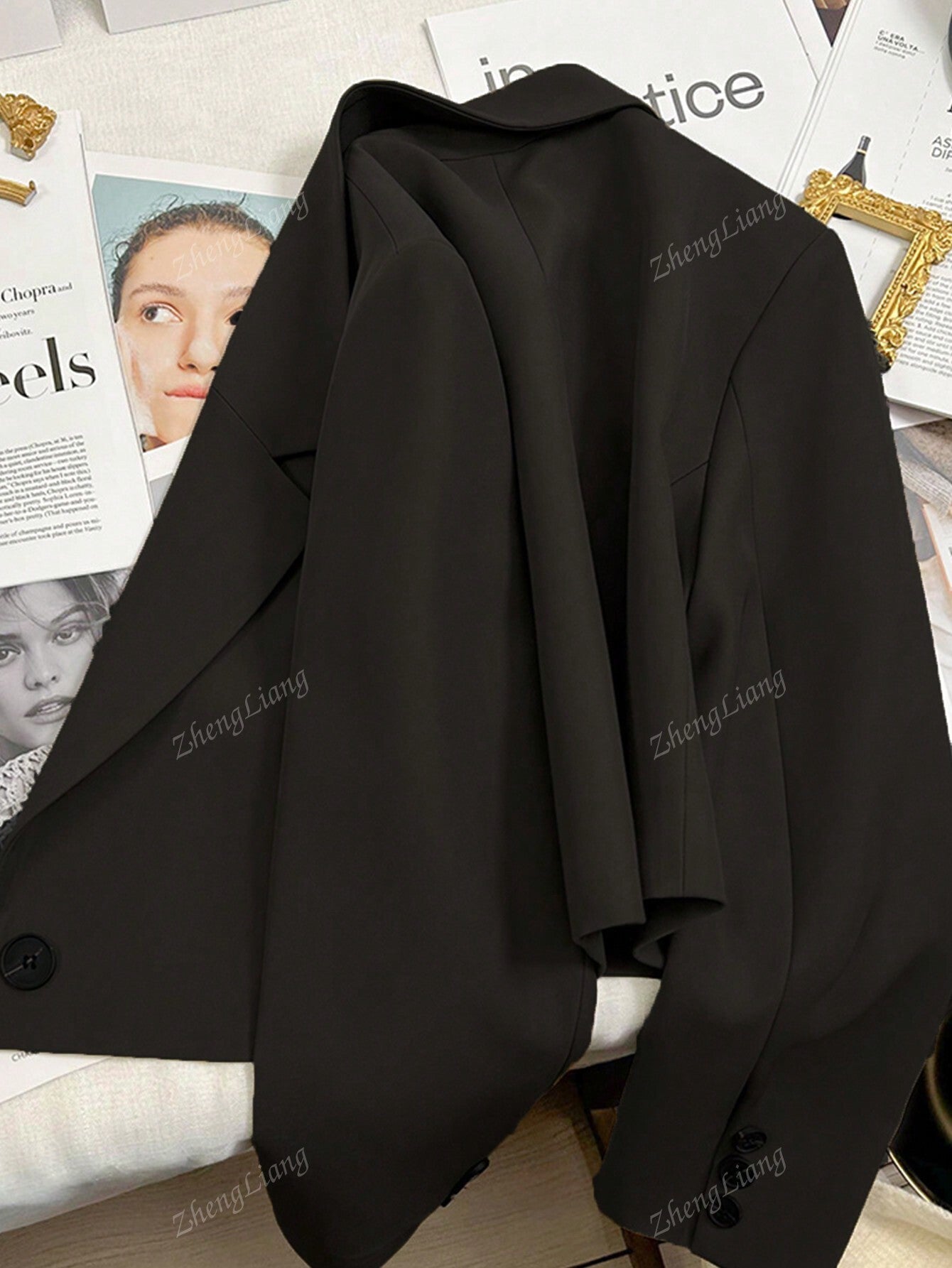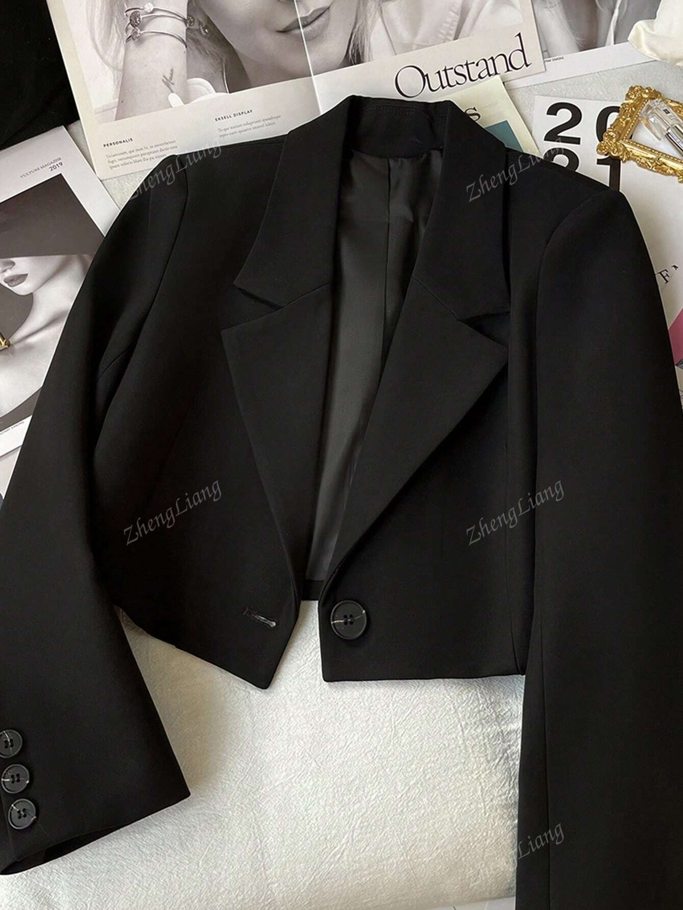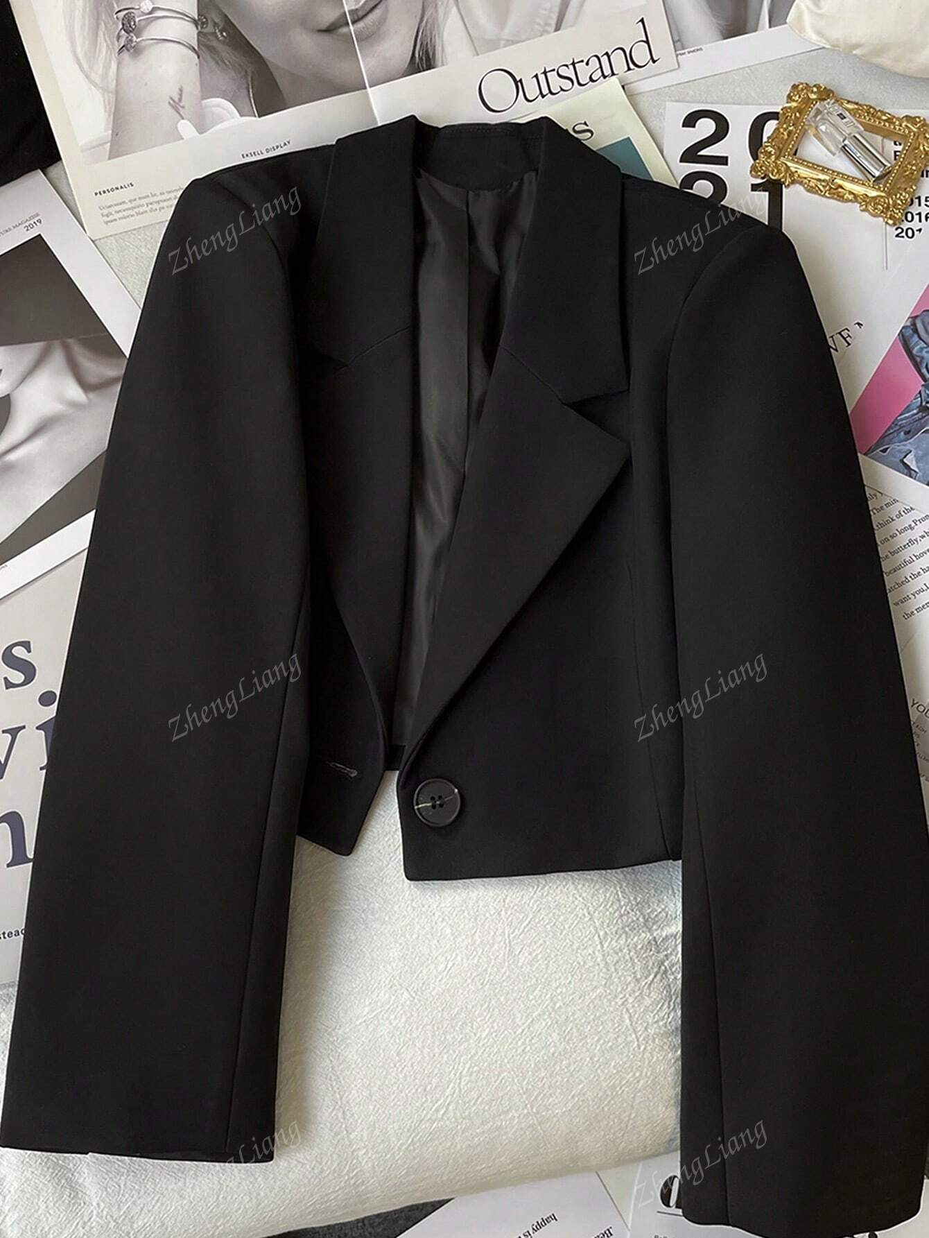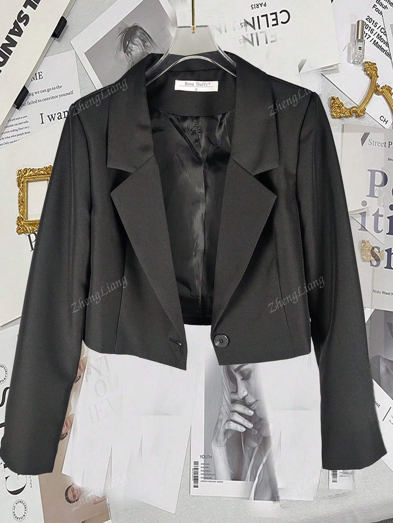 جاكيت بليزر نسائي أسود بأكمام طويلة وياقة مدببة وزر واحد، مناسب للعمل والمناسبات الرسمية.