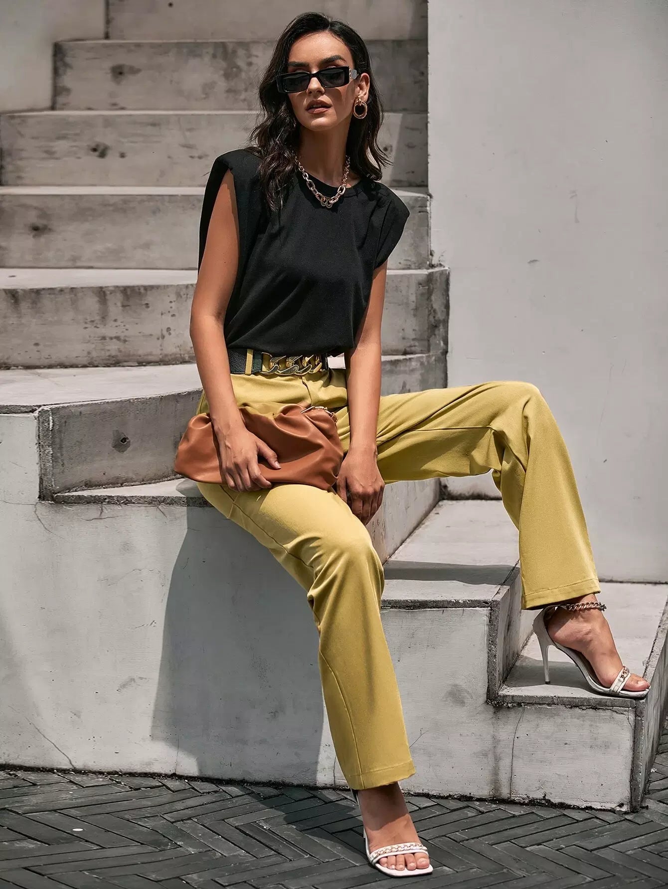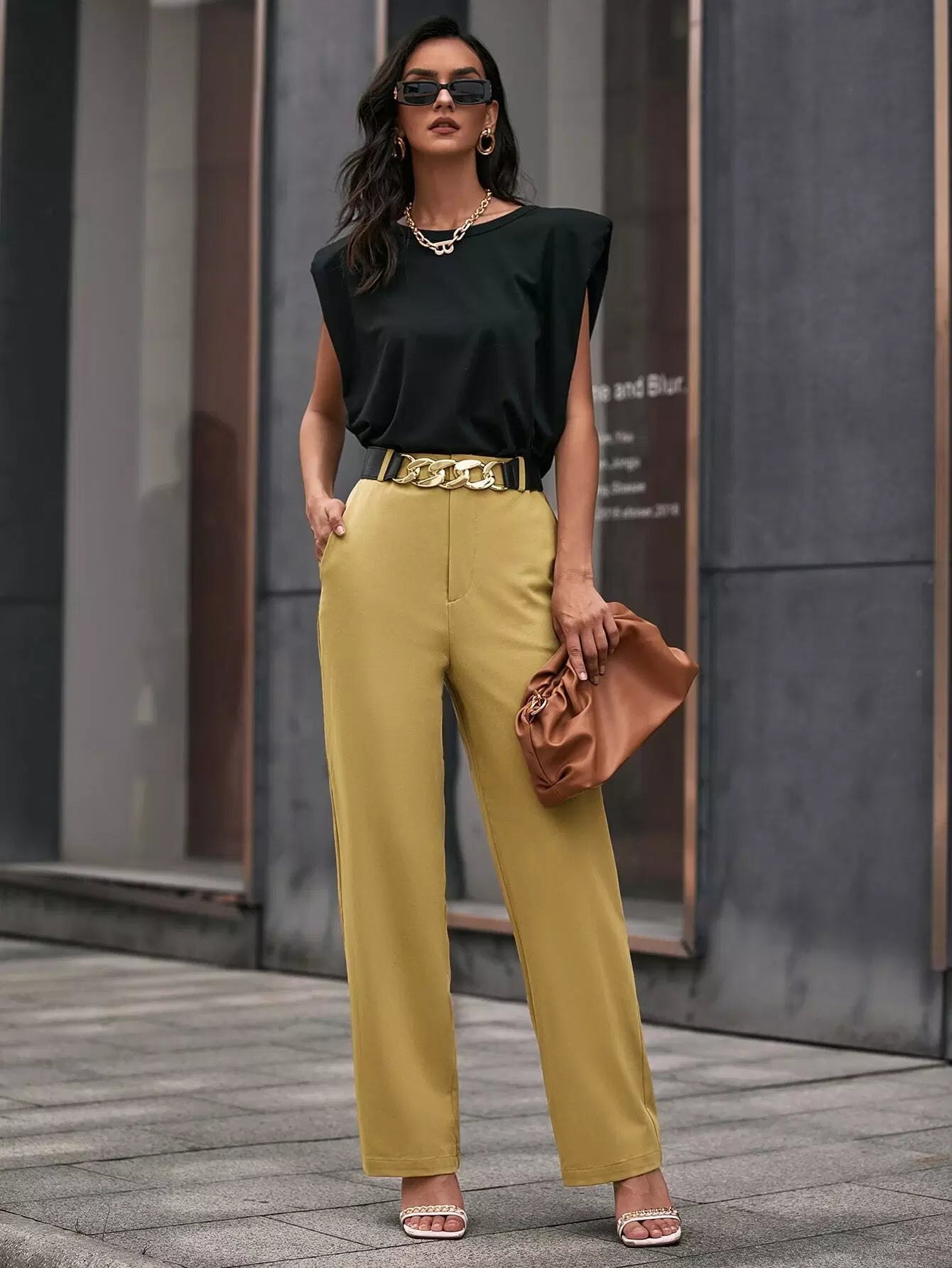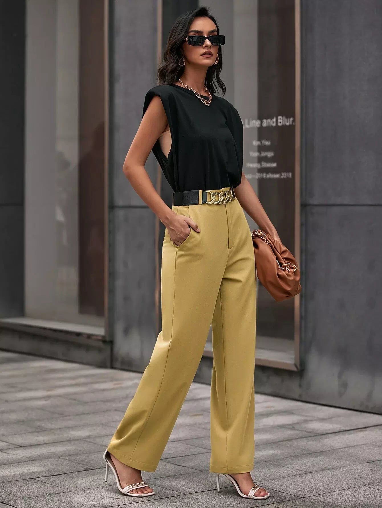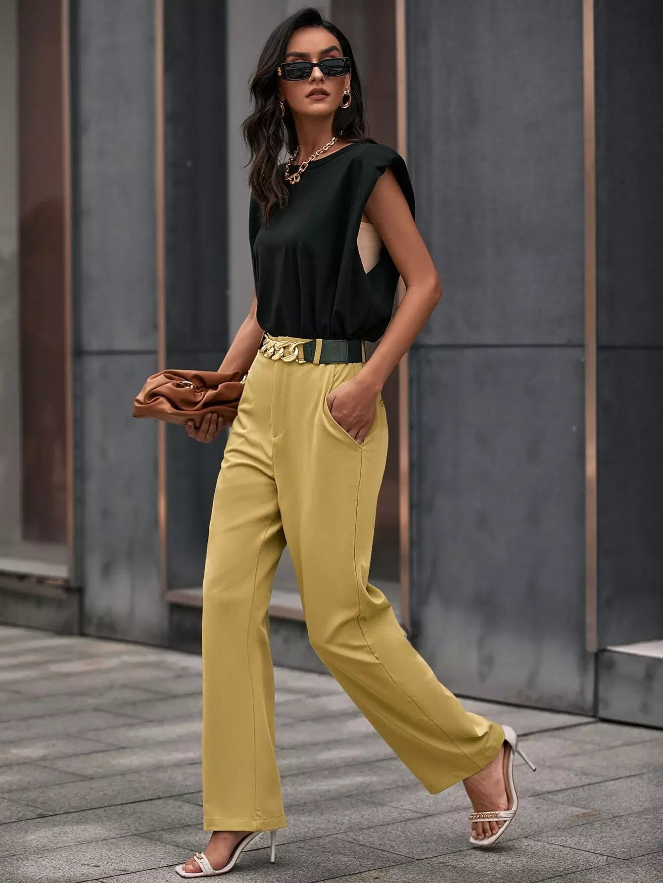 بنطلون سادة بجيوب مائلة مائلة بدون حزام