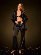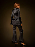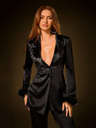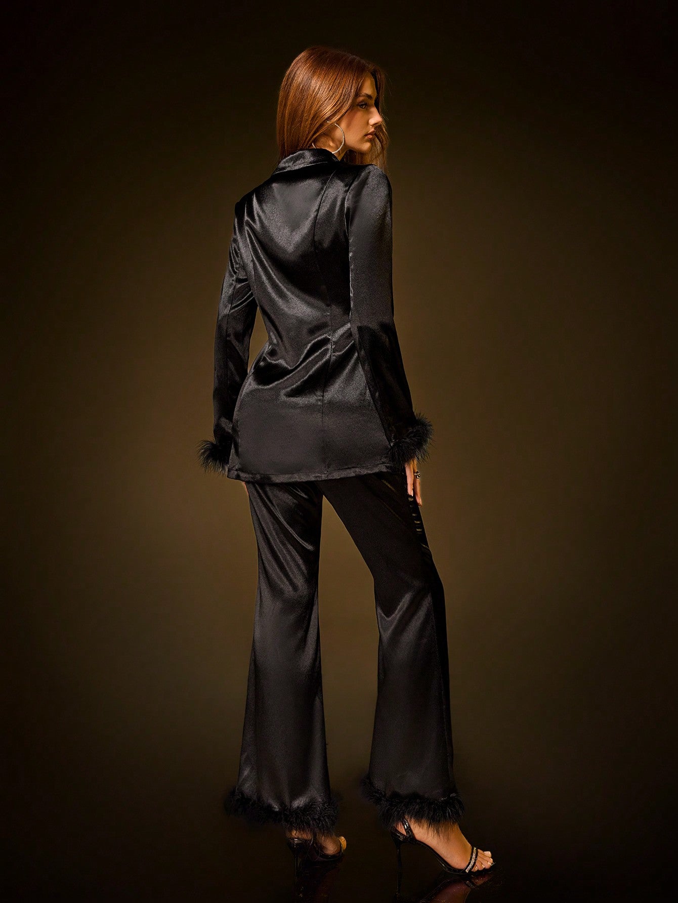 women SHEIN SXY Elegant Black Feather Trim Satin Suit Set