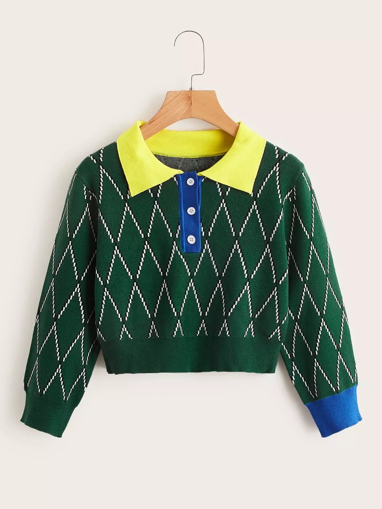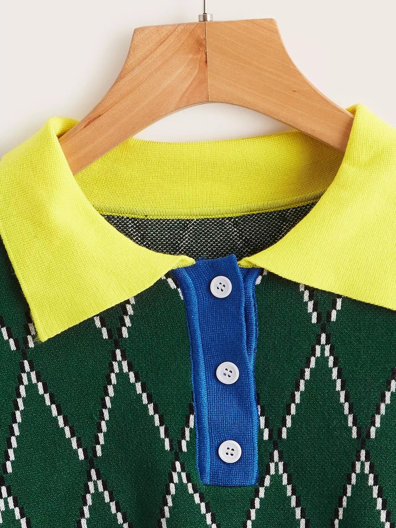 كنزة بياقة بياقة نصف زر بنقشة أرجيل بلون مغاير