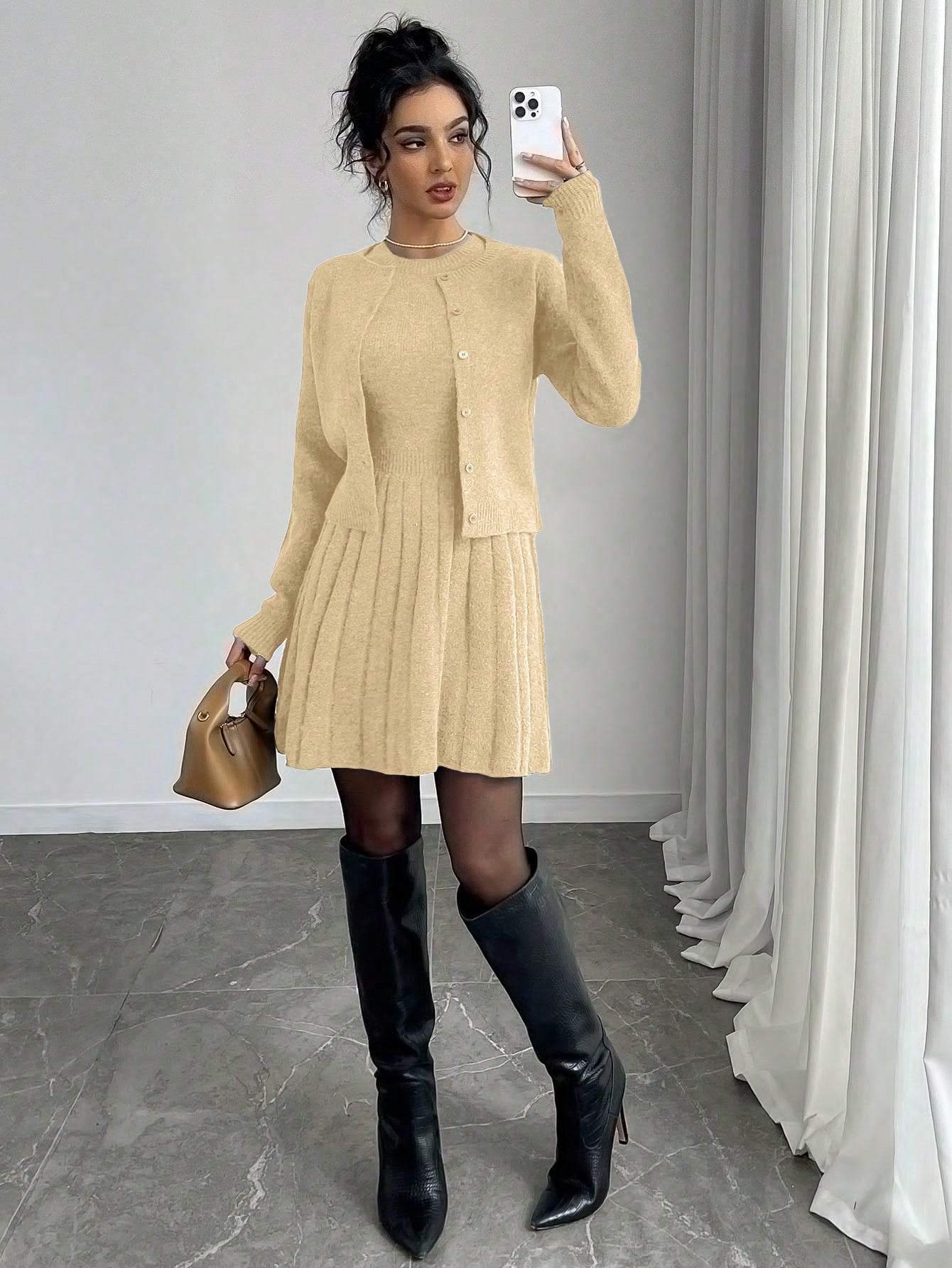 طقم نسائي من قطعتين من تشيكيز: بلوزة بأكمام طويلة وأزرار أمامية وفستان بتصميم بسيط