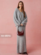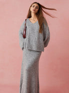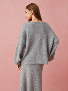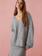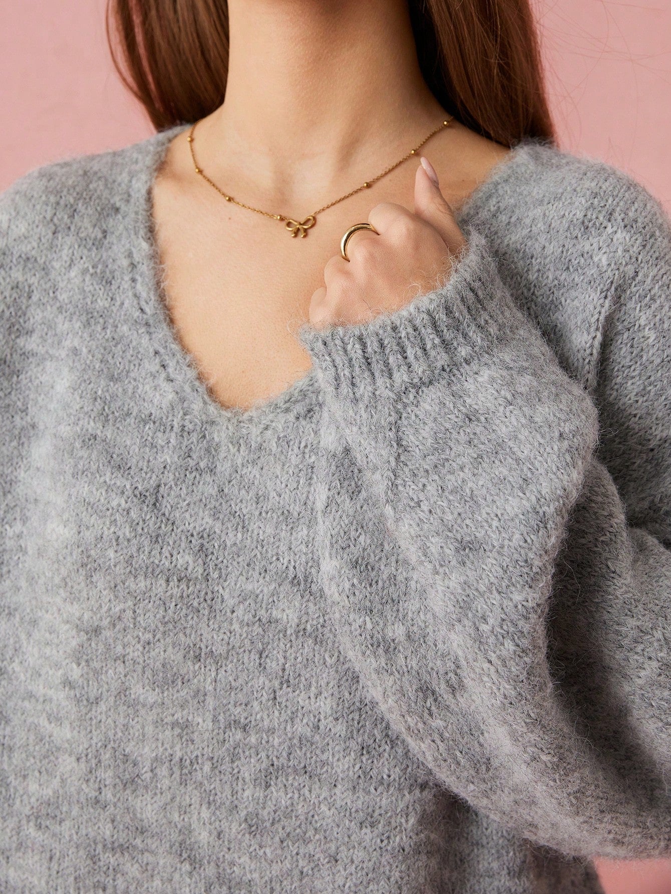 women Enchnt Women's Gray V-Neck Dropped Shoulder Long Sleeve Loose Casual Sweater