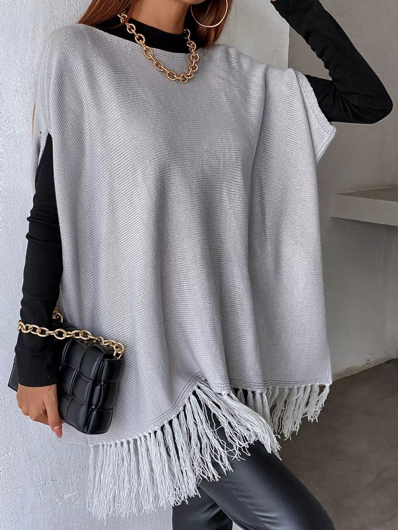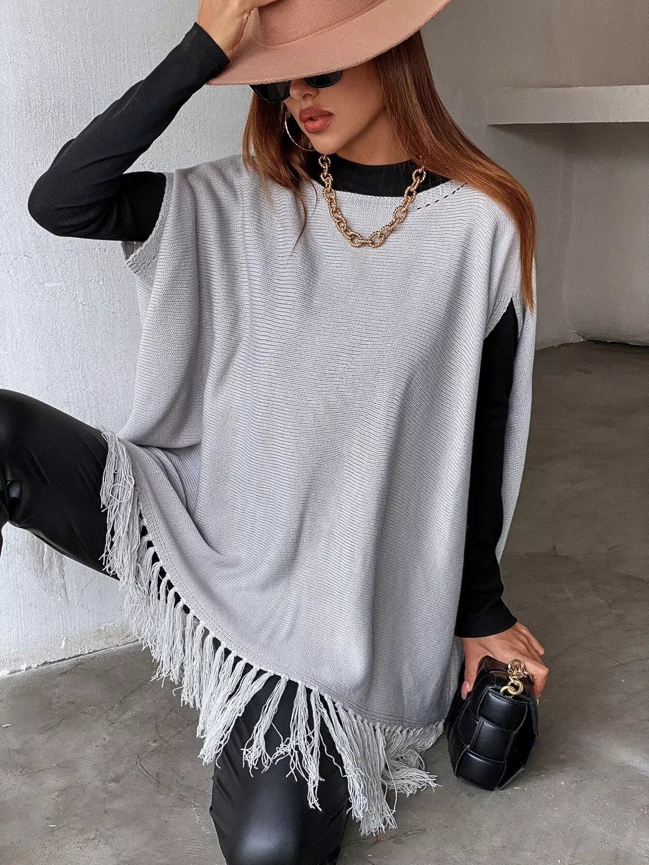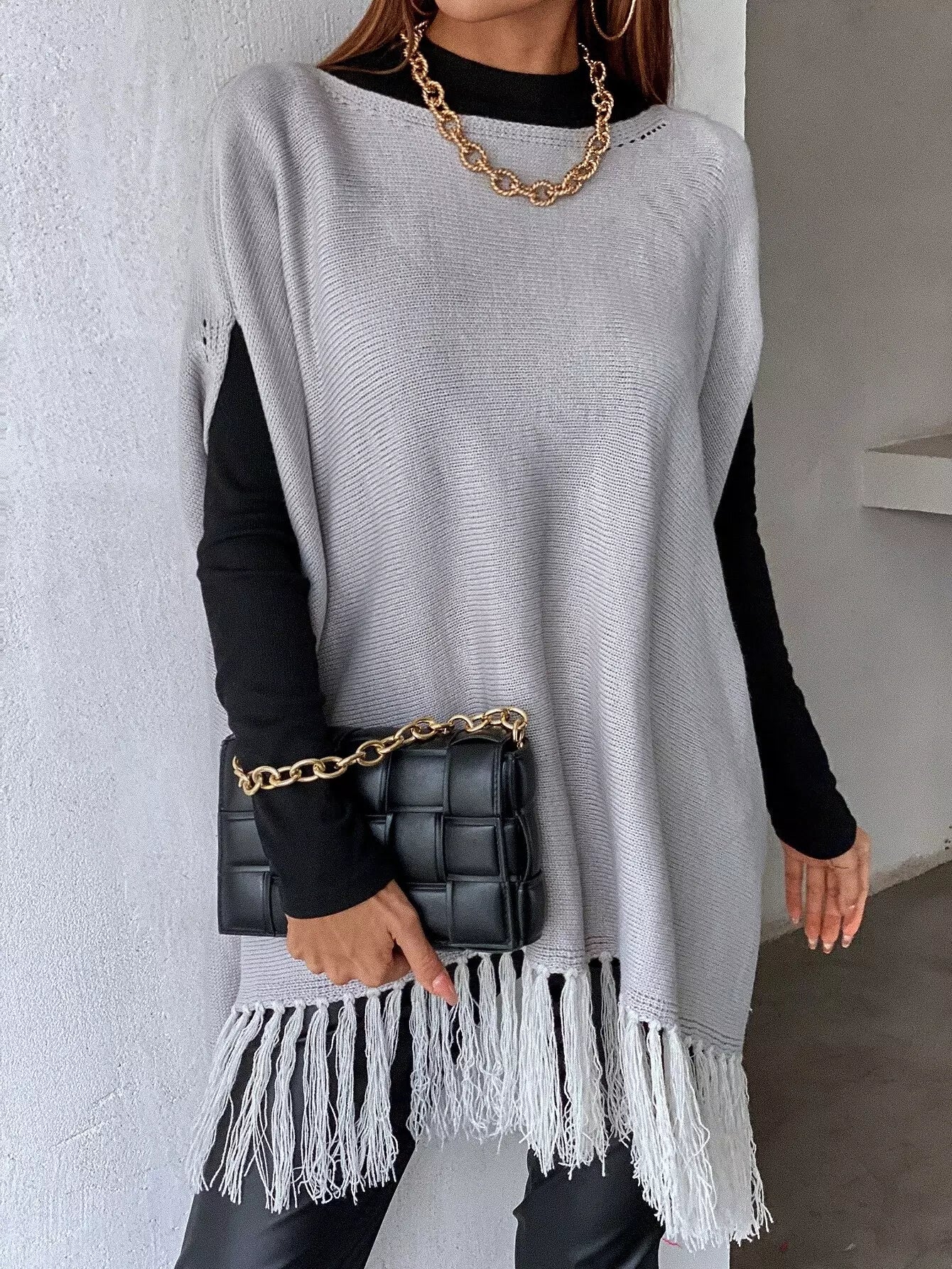 بلوزة متماسكة بأكمام مهدبة بأطراف مهدبة بدون قميص