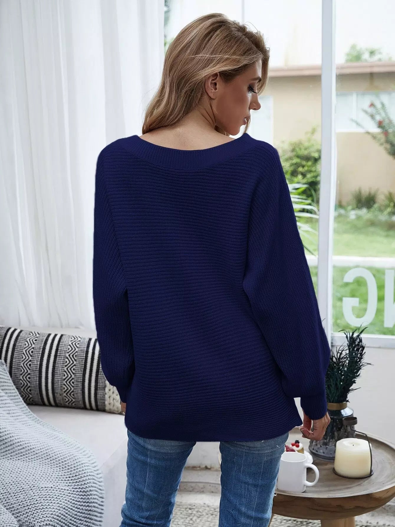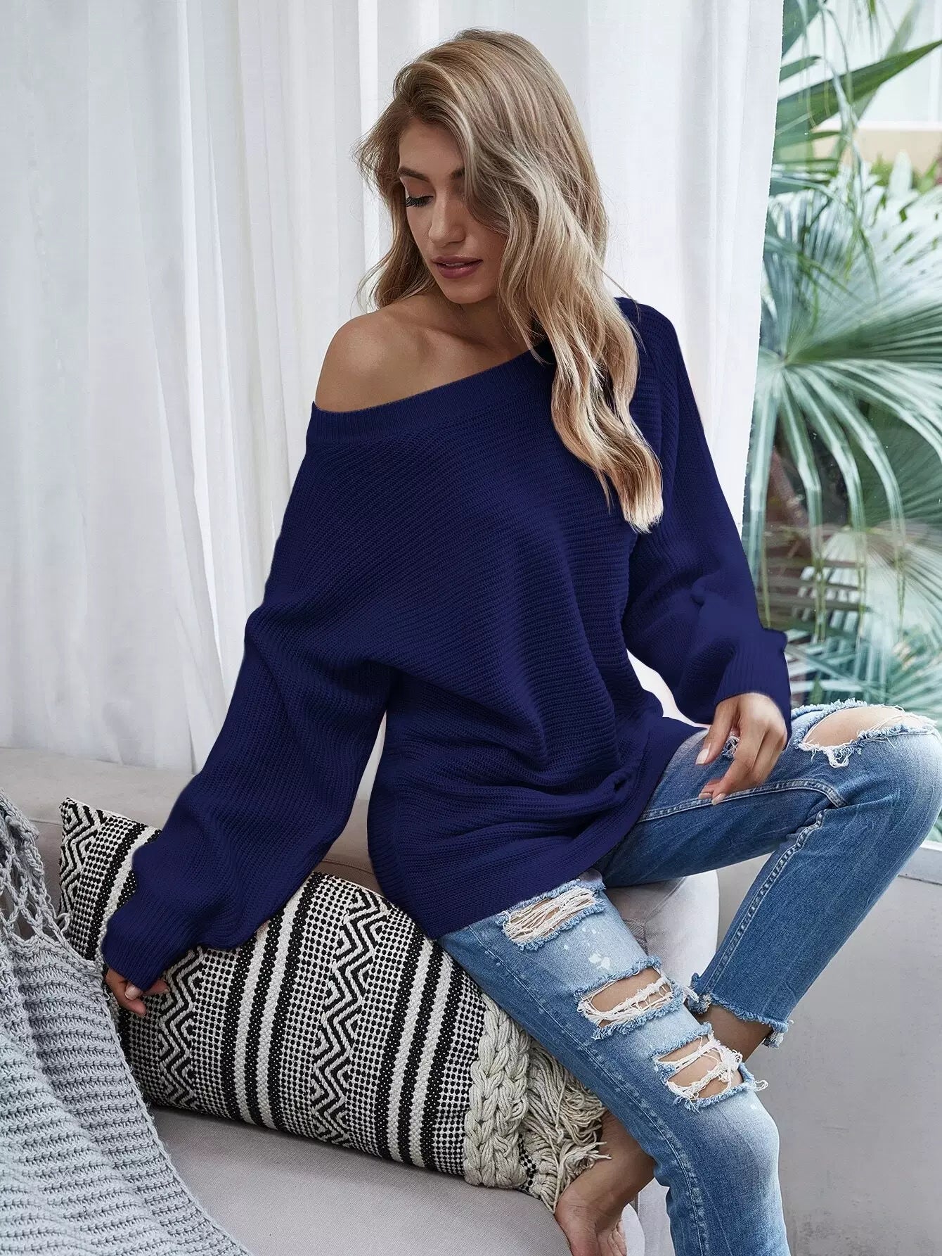سترة سادة بأكمام على شكل قارب برقبة قارب سادة