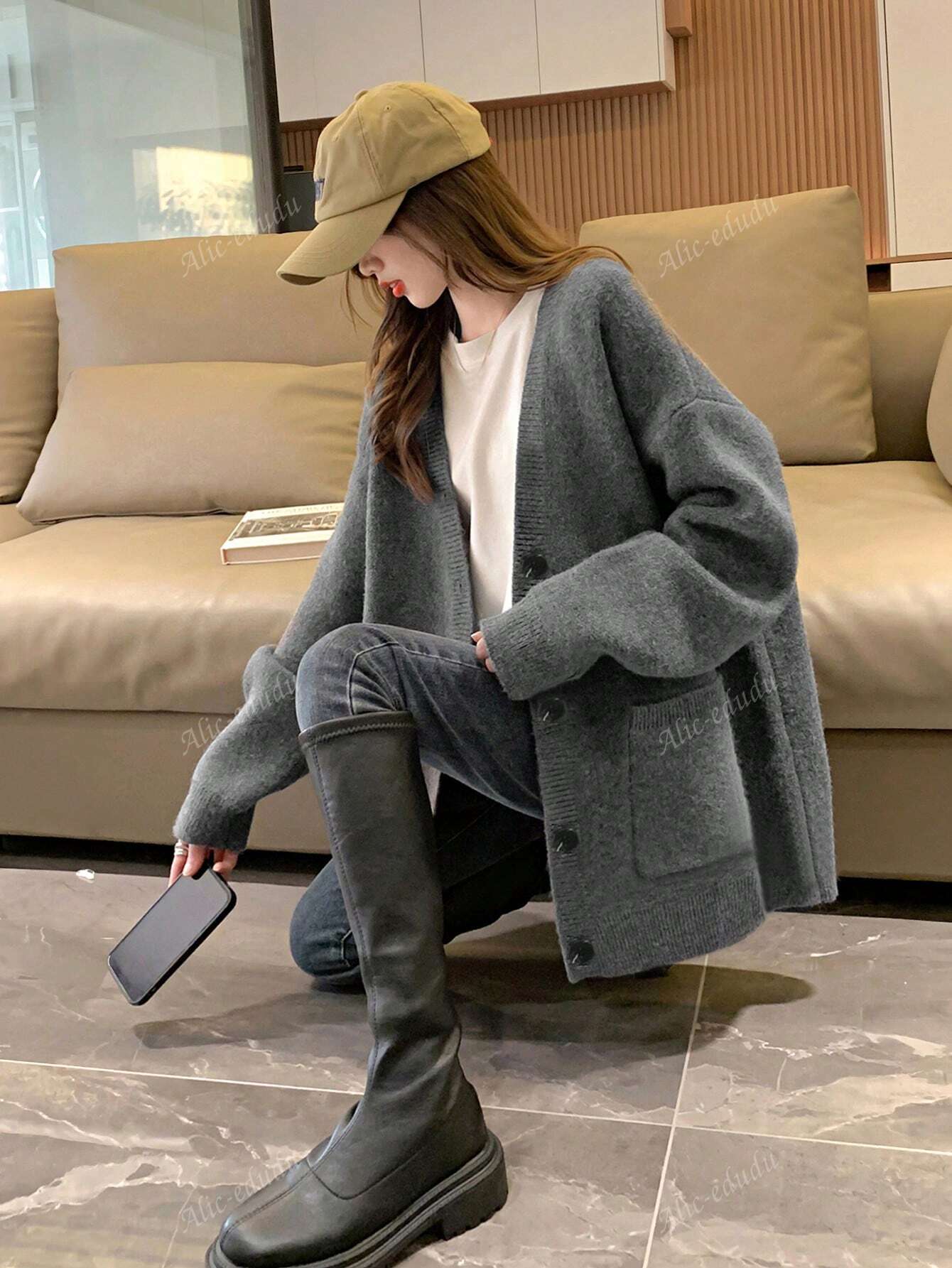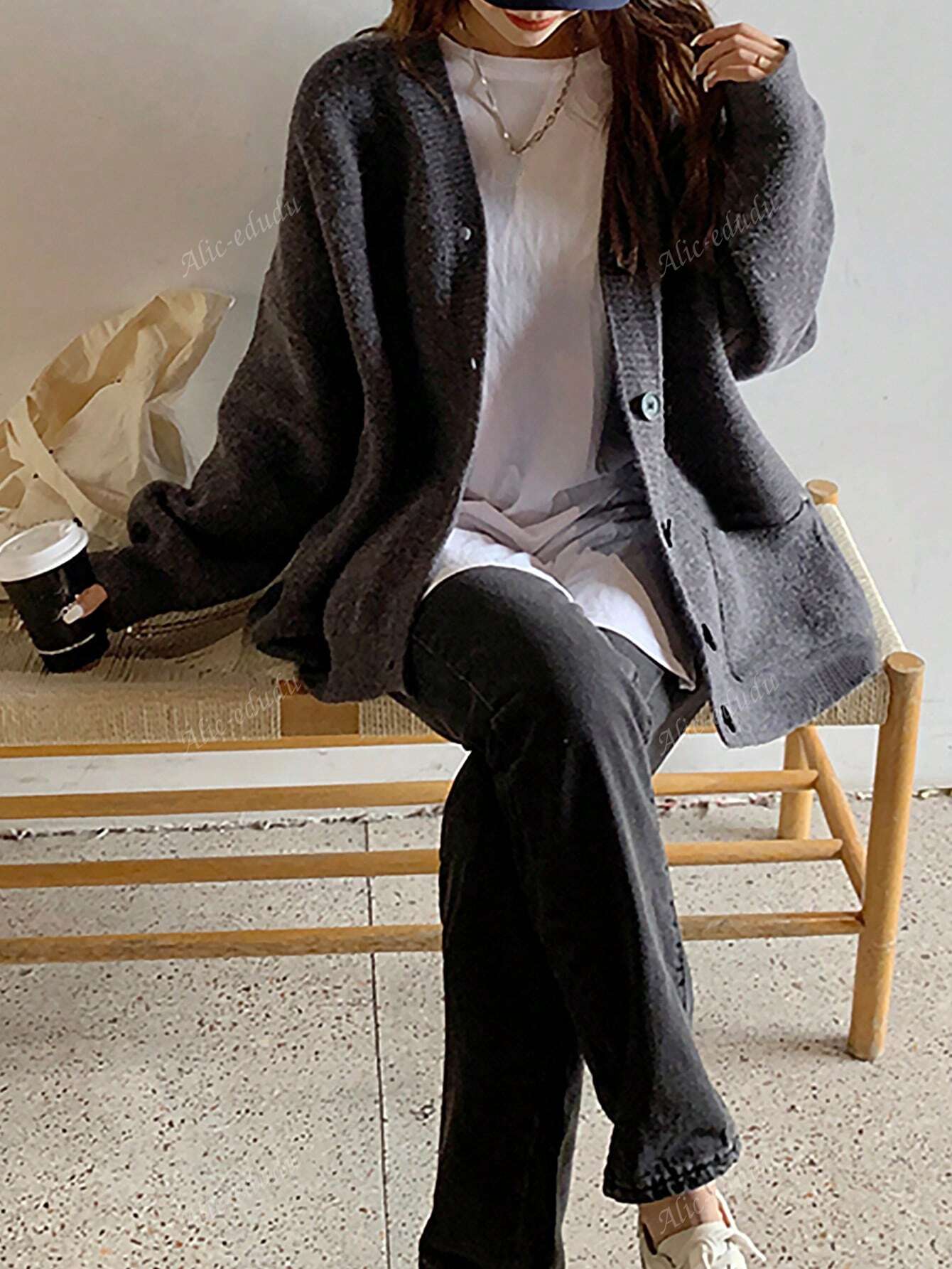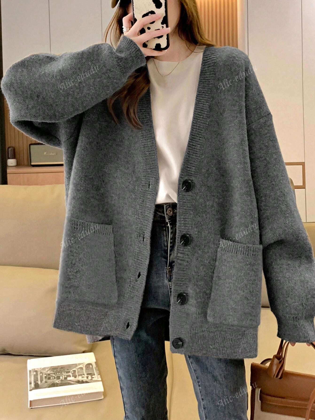 كارديجان نسائي واسع بكتفين منسدلين، مناسب لعطلات نهاية الأسبوع وأواخر الخريف، بجيوب وكتفين منسدلين وياقة على شكل حرف V.