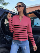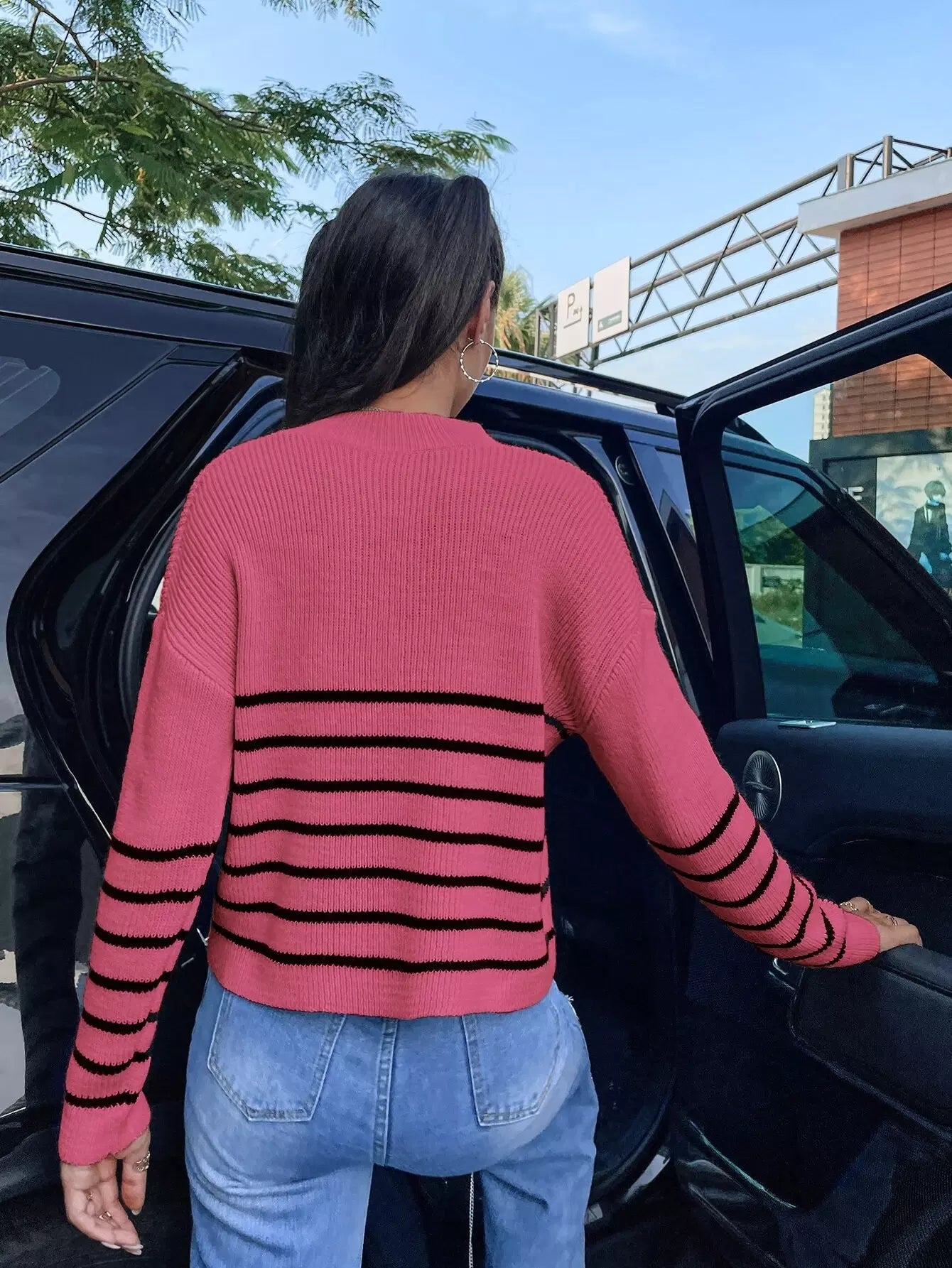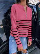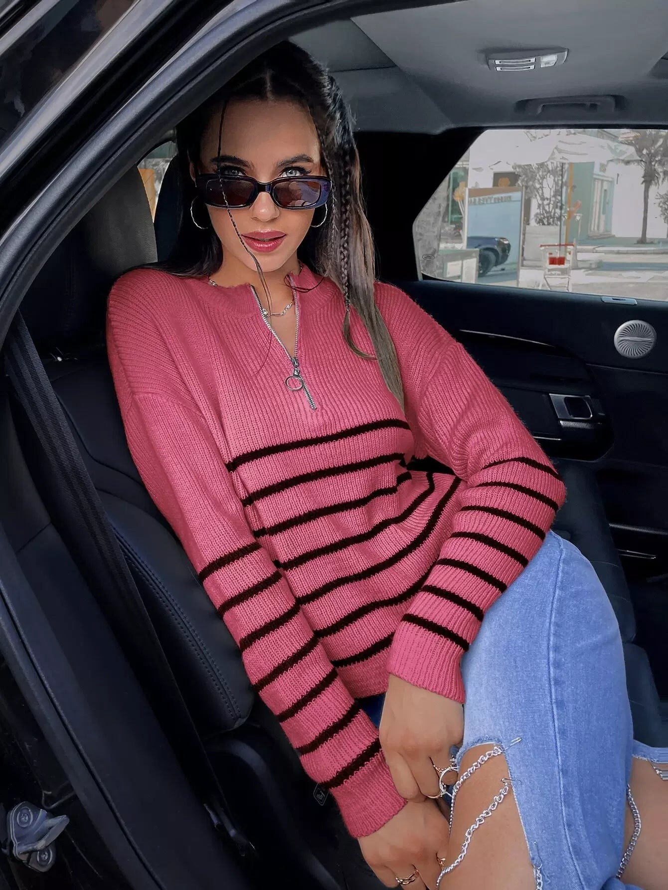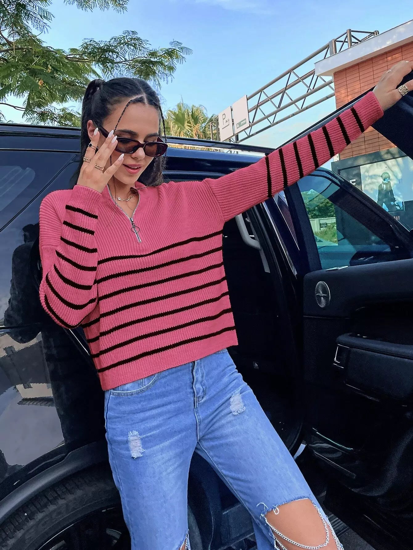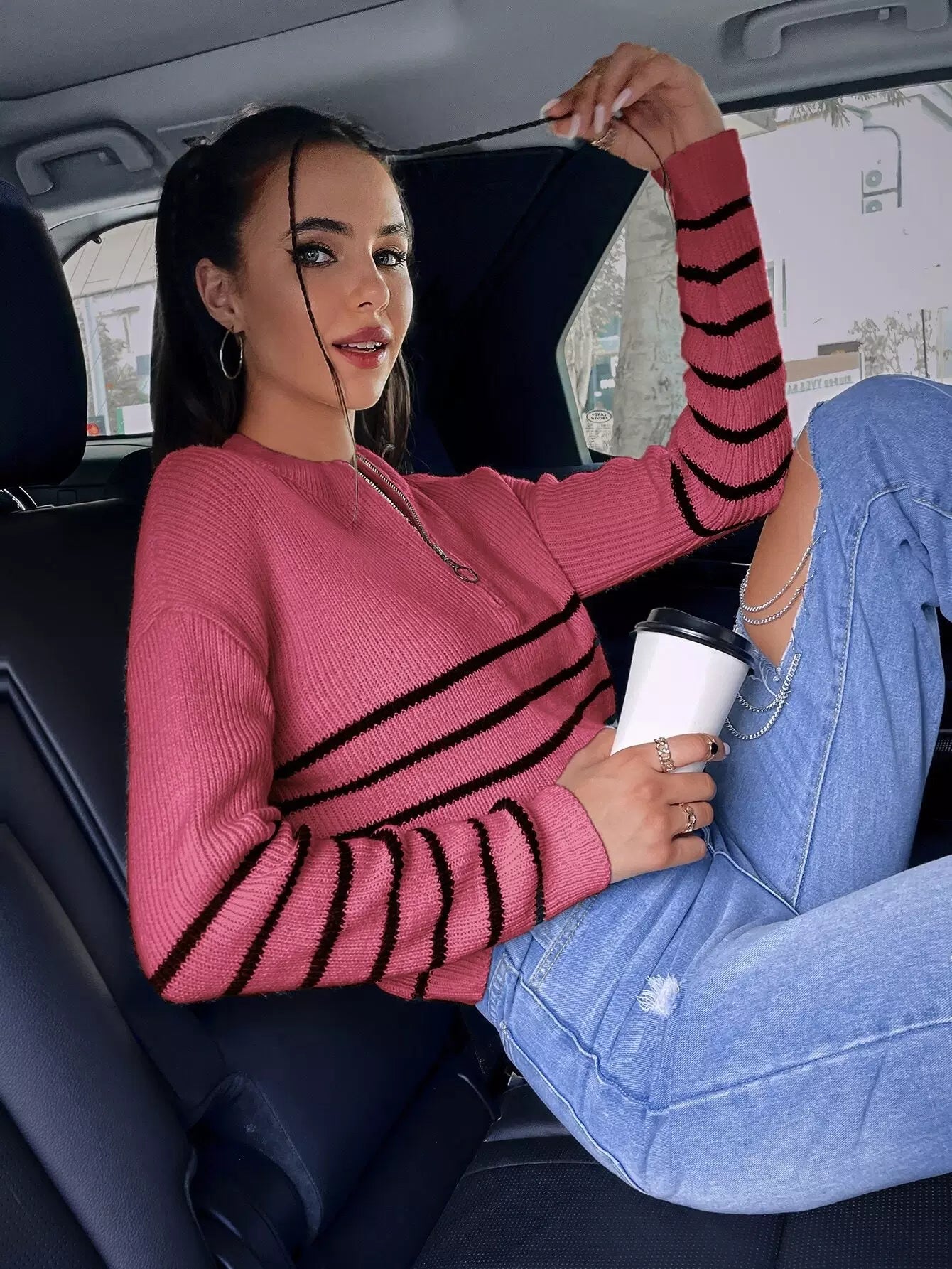 كنزة مخططة بنقشة أكتاف منسدلة على نصف كتف بسحاب