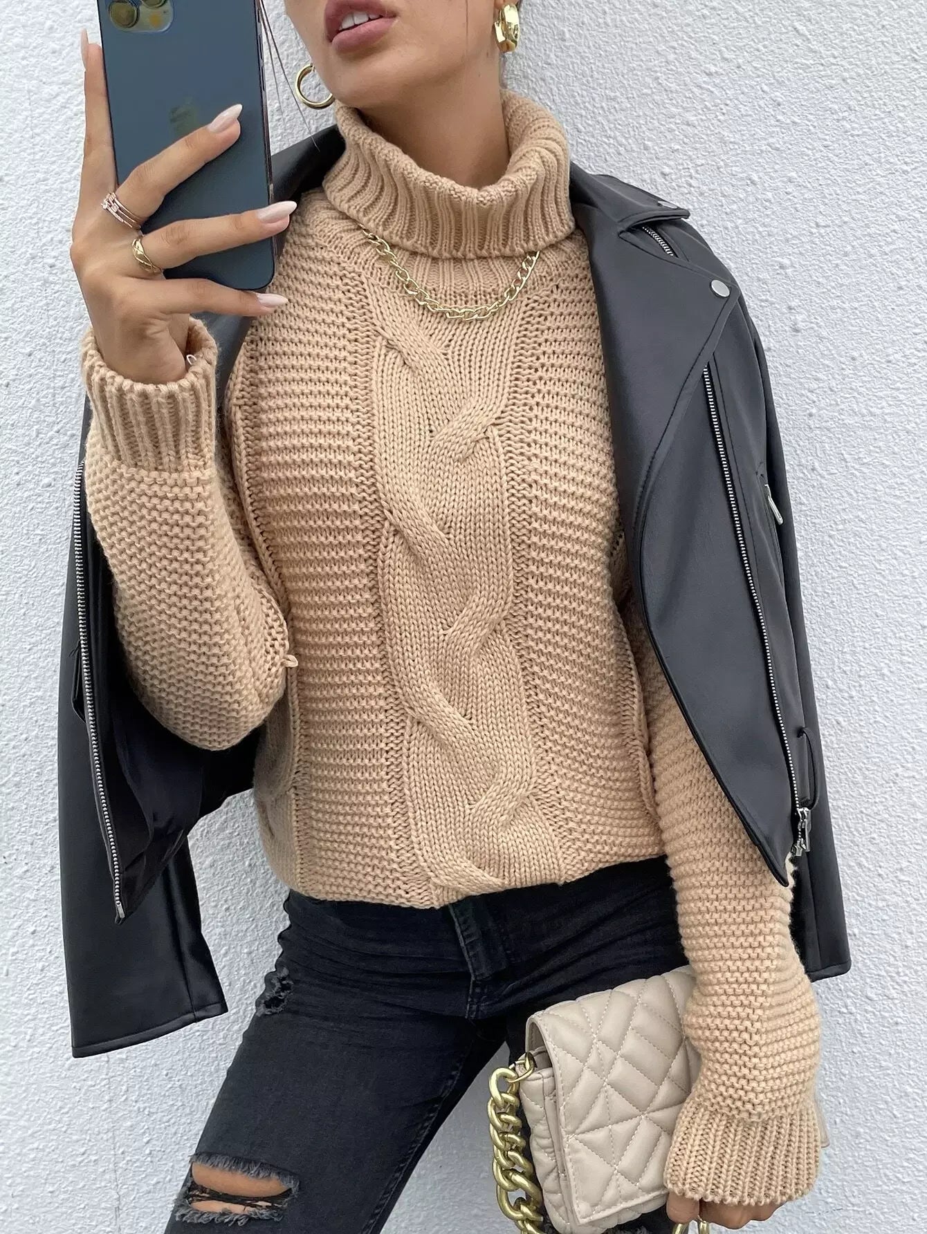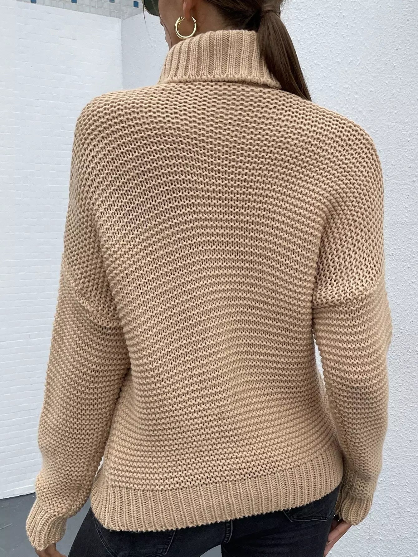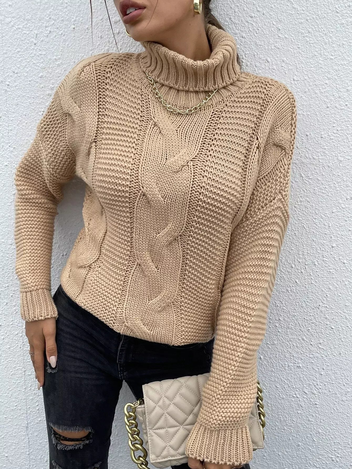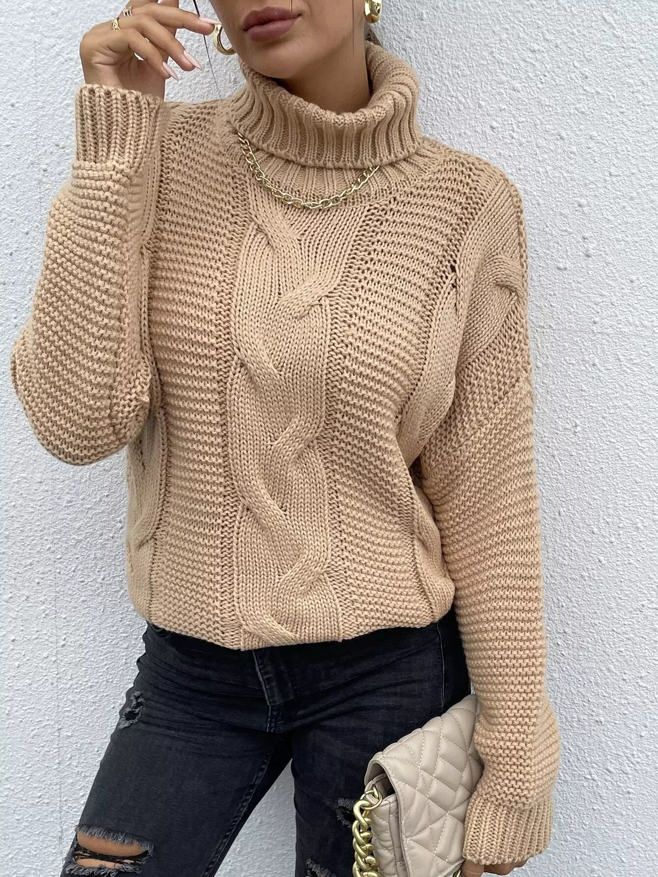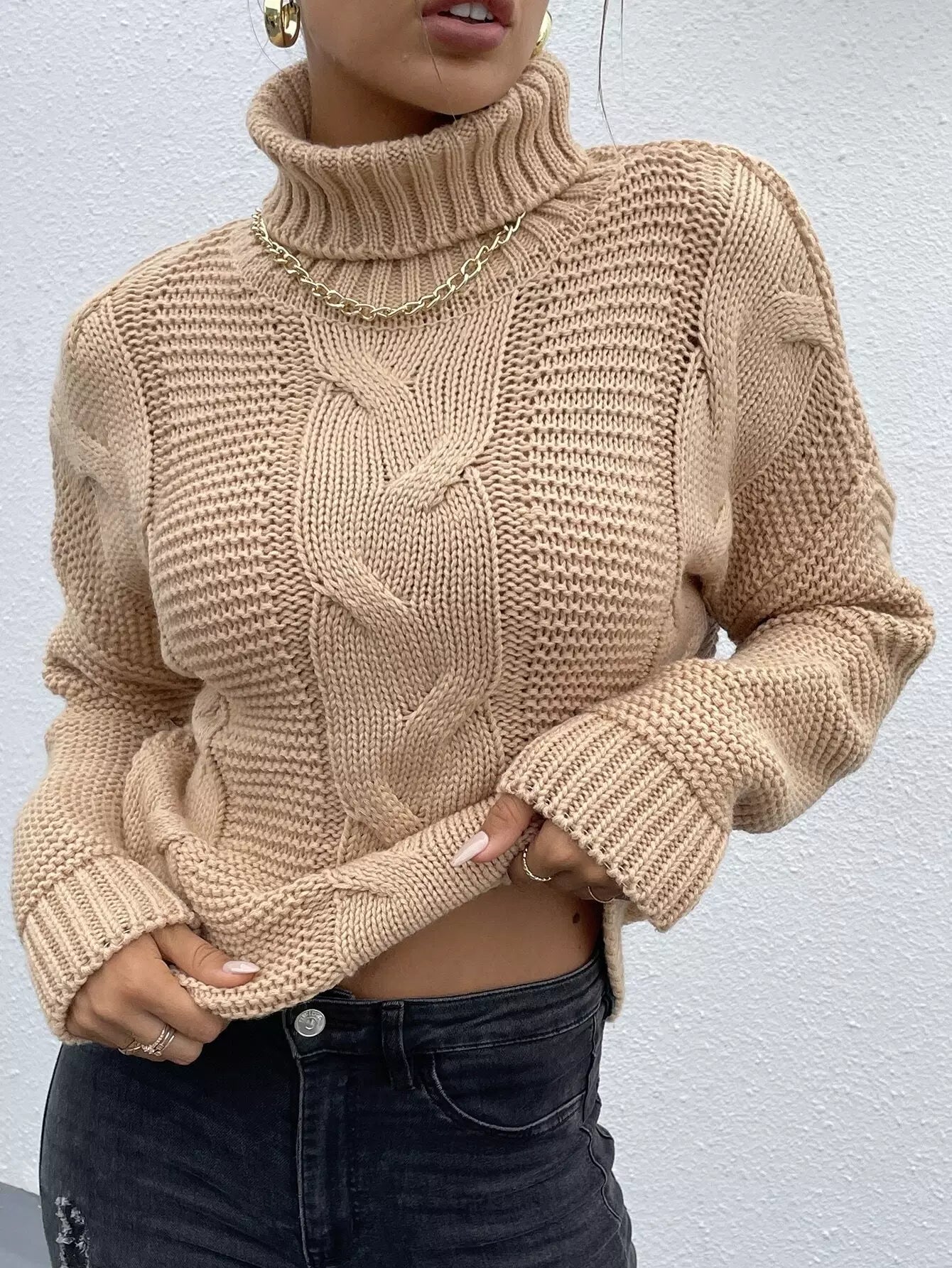 سترة بياقة مدورة بياقة كبلية محبوكة منسدلة الكتفين