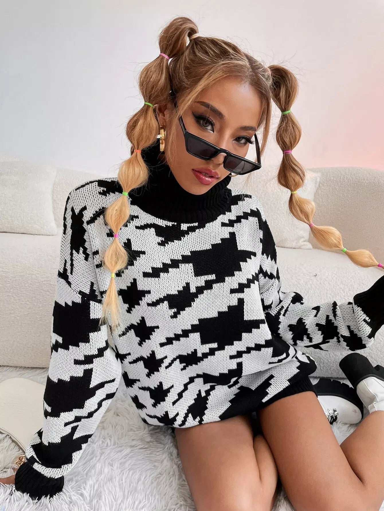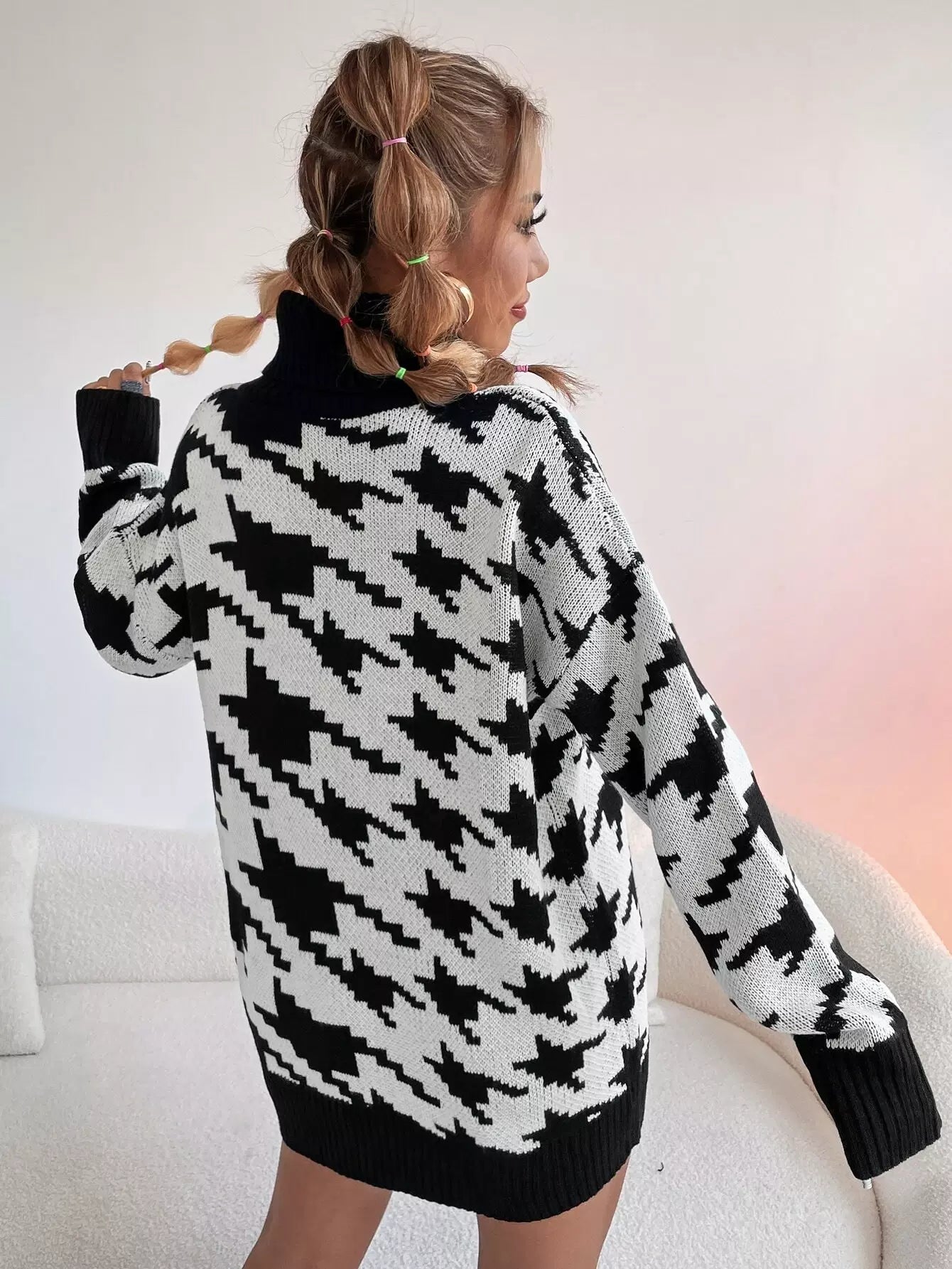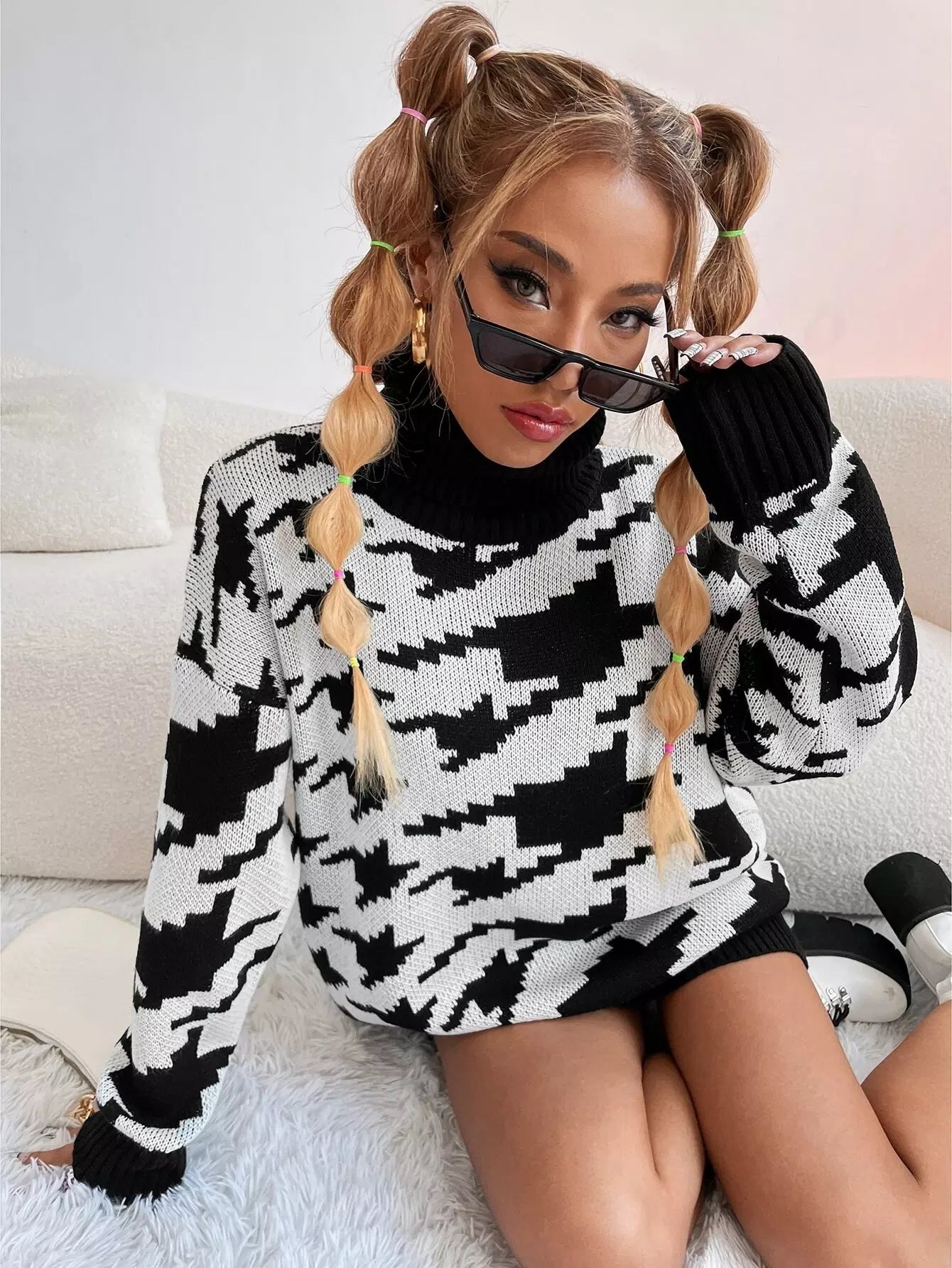 النساء - سترة ذات ياقة عالية ونمط مربعات وكتف منسدل