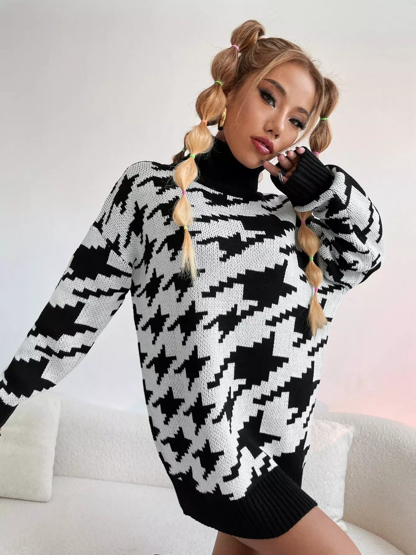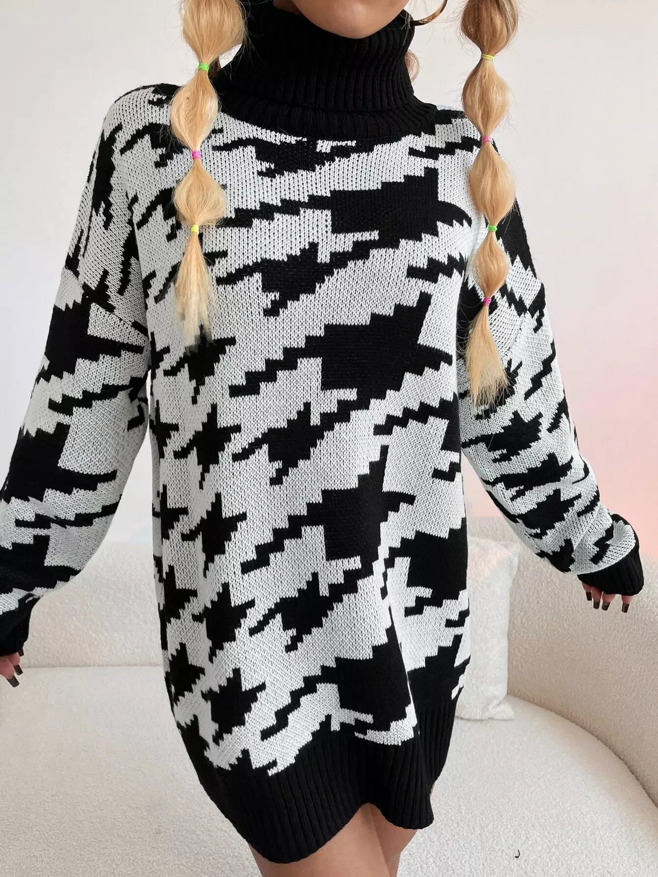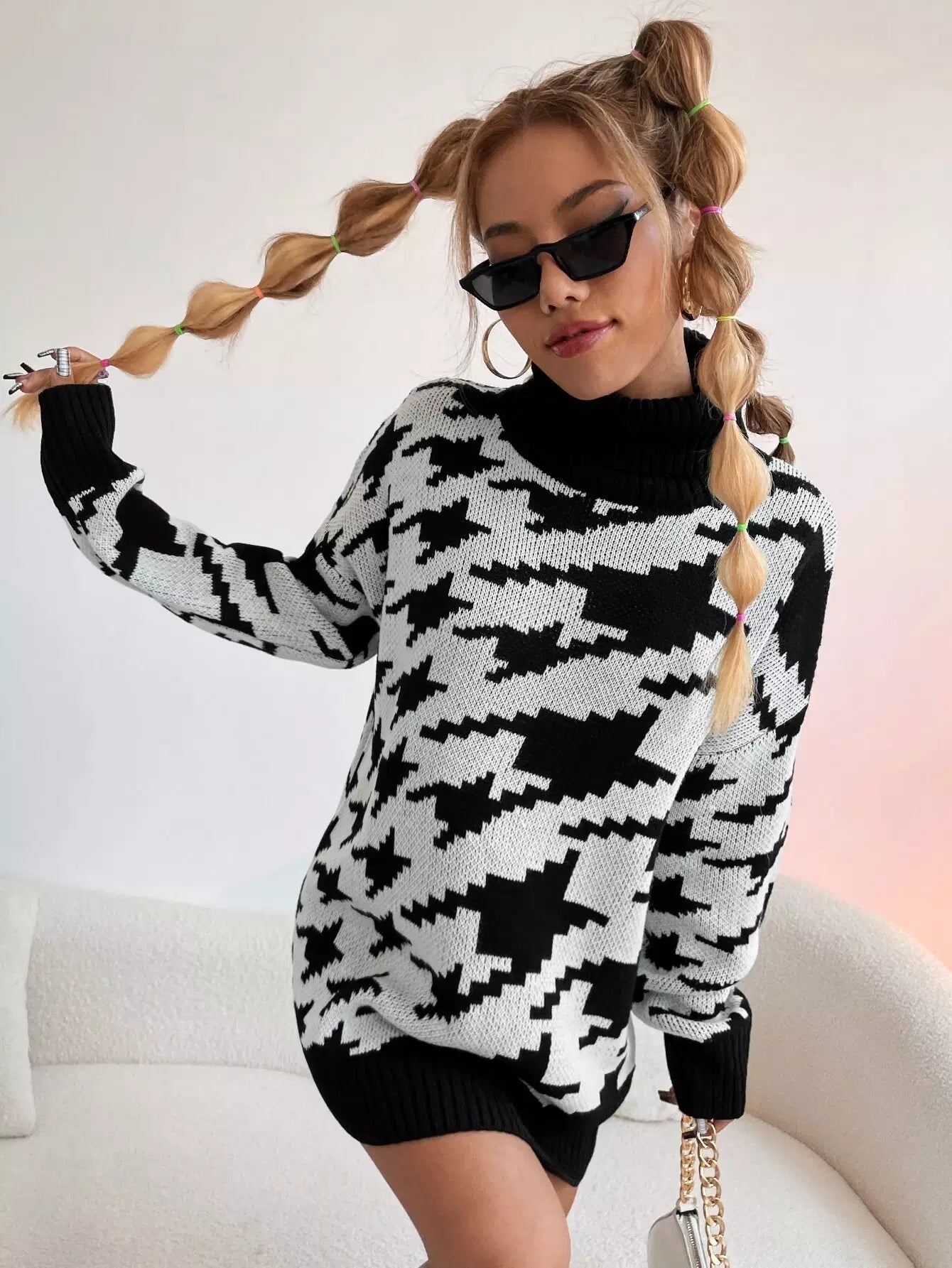 النساء - سترة ذات ياقة عالية ونمط مربعات وكتف منسدل