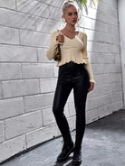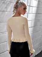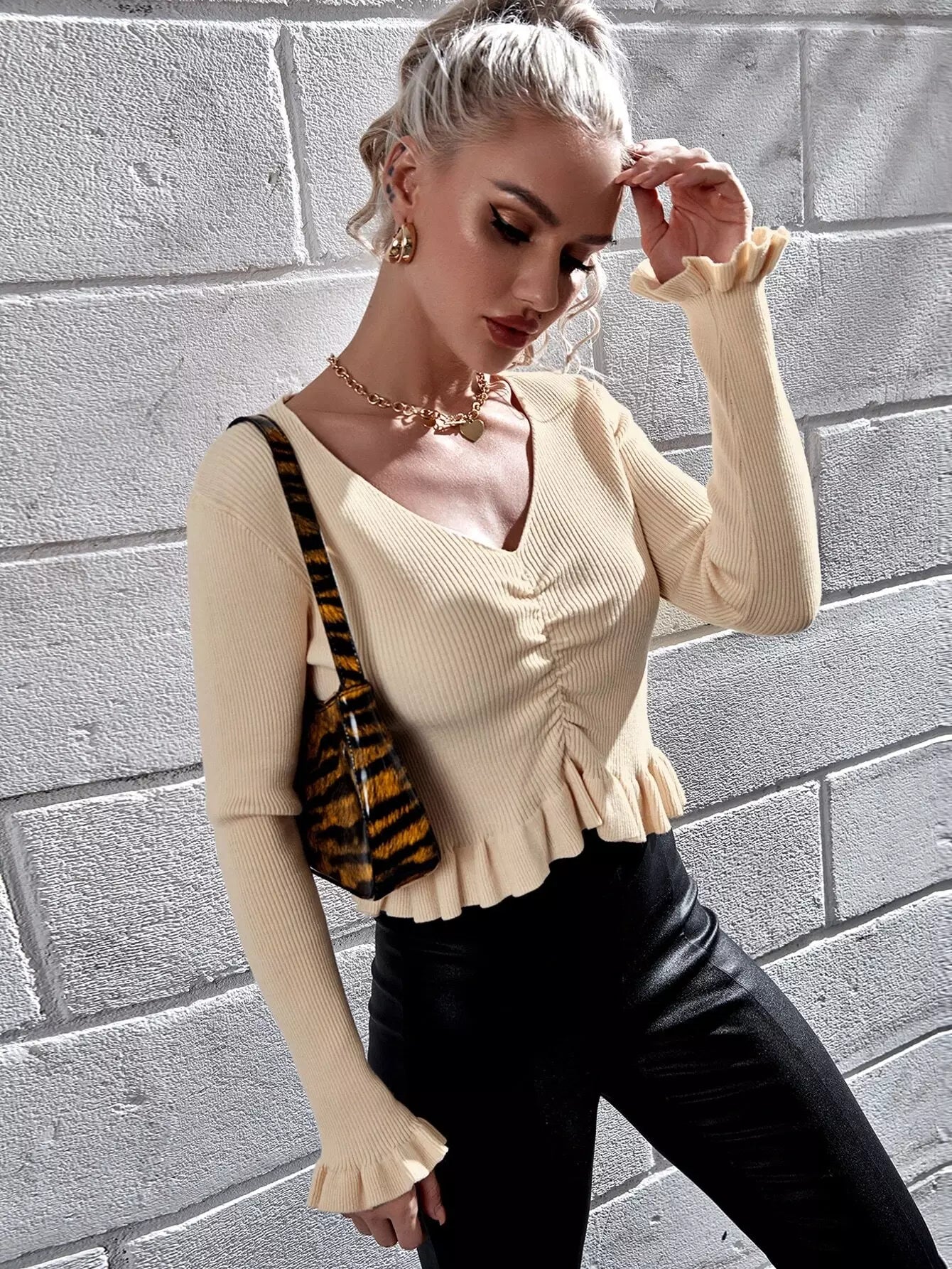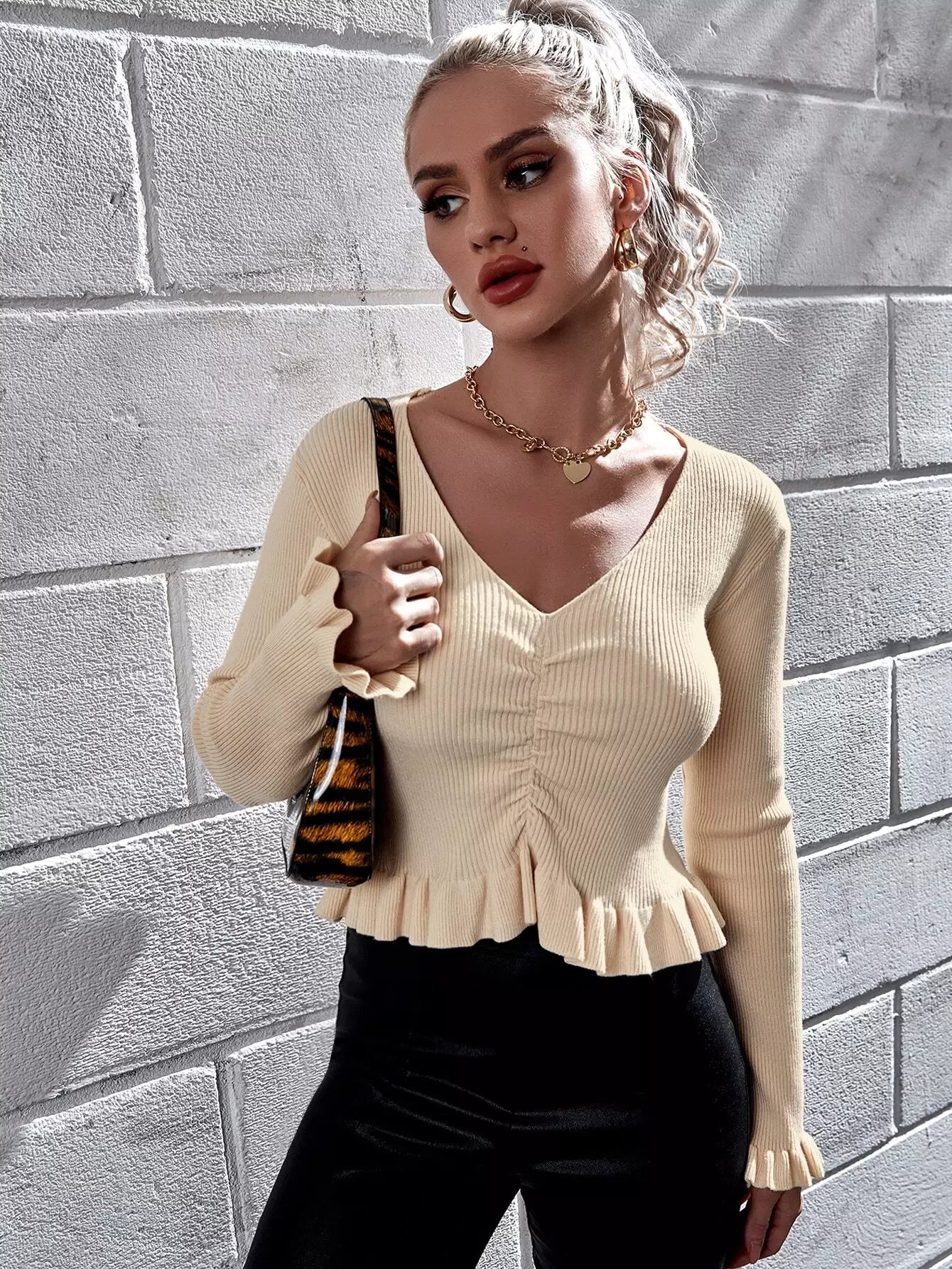 كنزة برقبة على شكل حرف V ذات تفاصيل مكشكشة على شكل كشكش