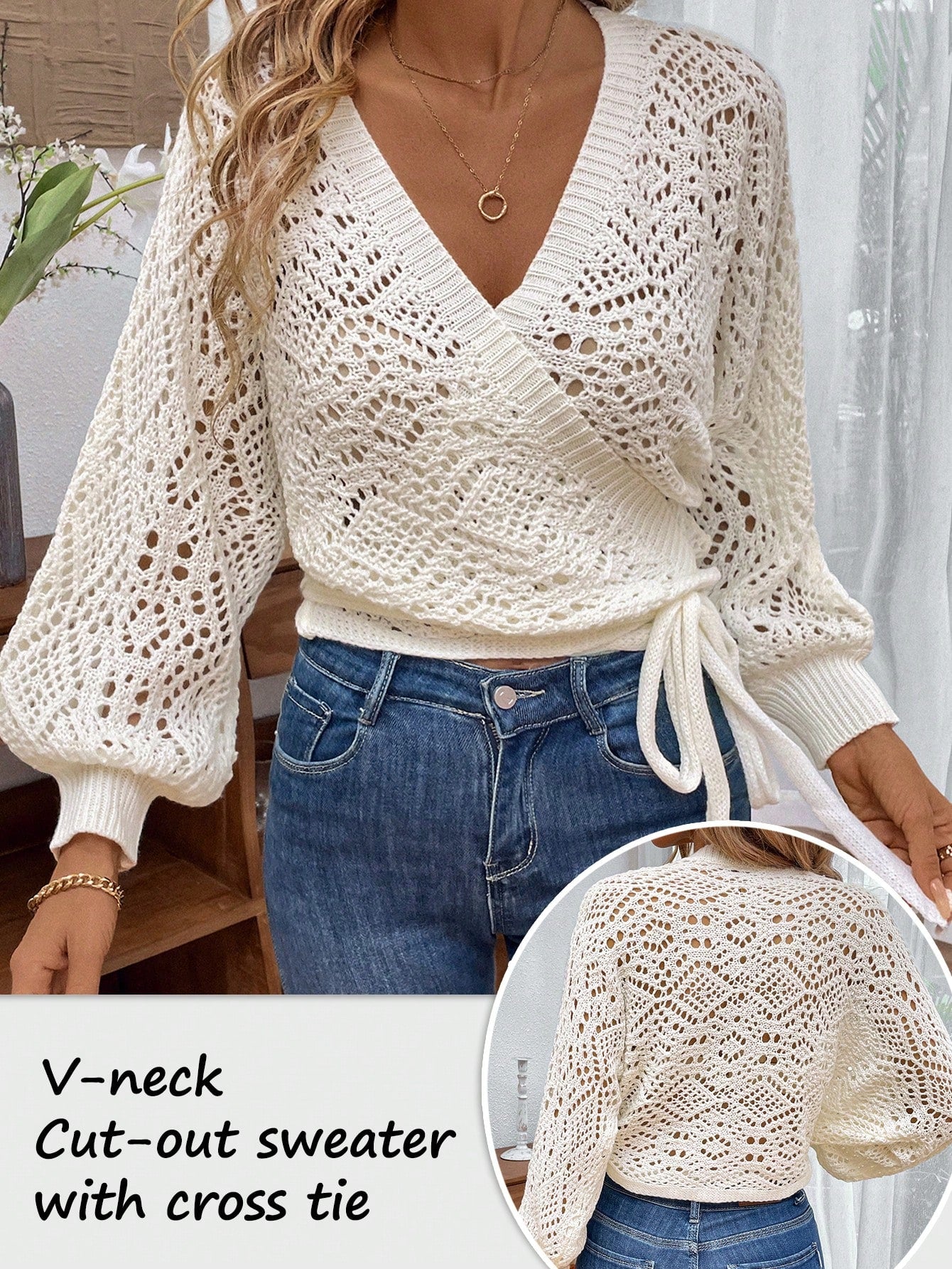 كارديجان كالفايا بأكمام فانوسية وفتحة رقبة على شكل حرف V وعقدة جانبية من نسيج البوانتيل المحبوك