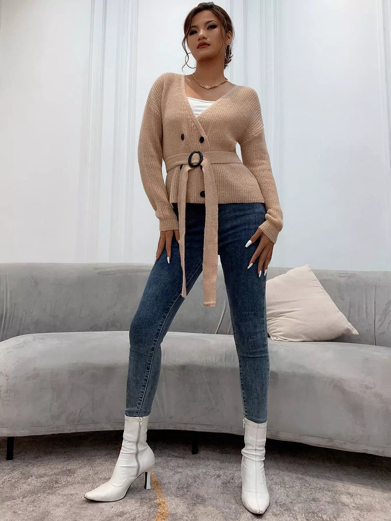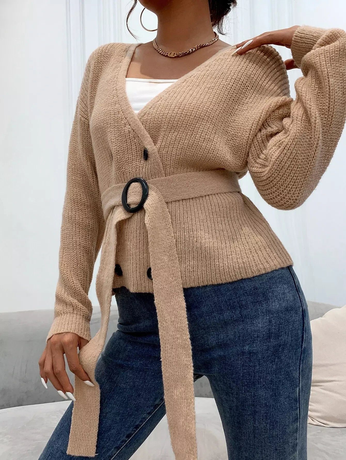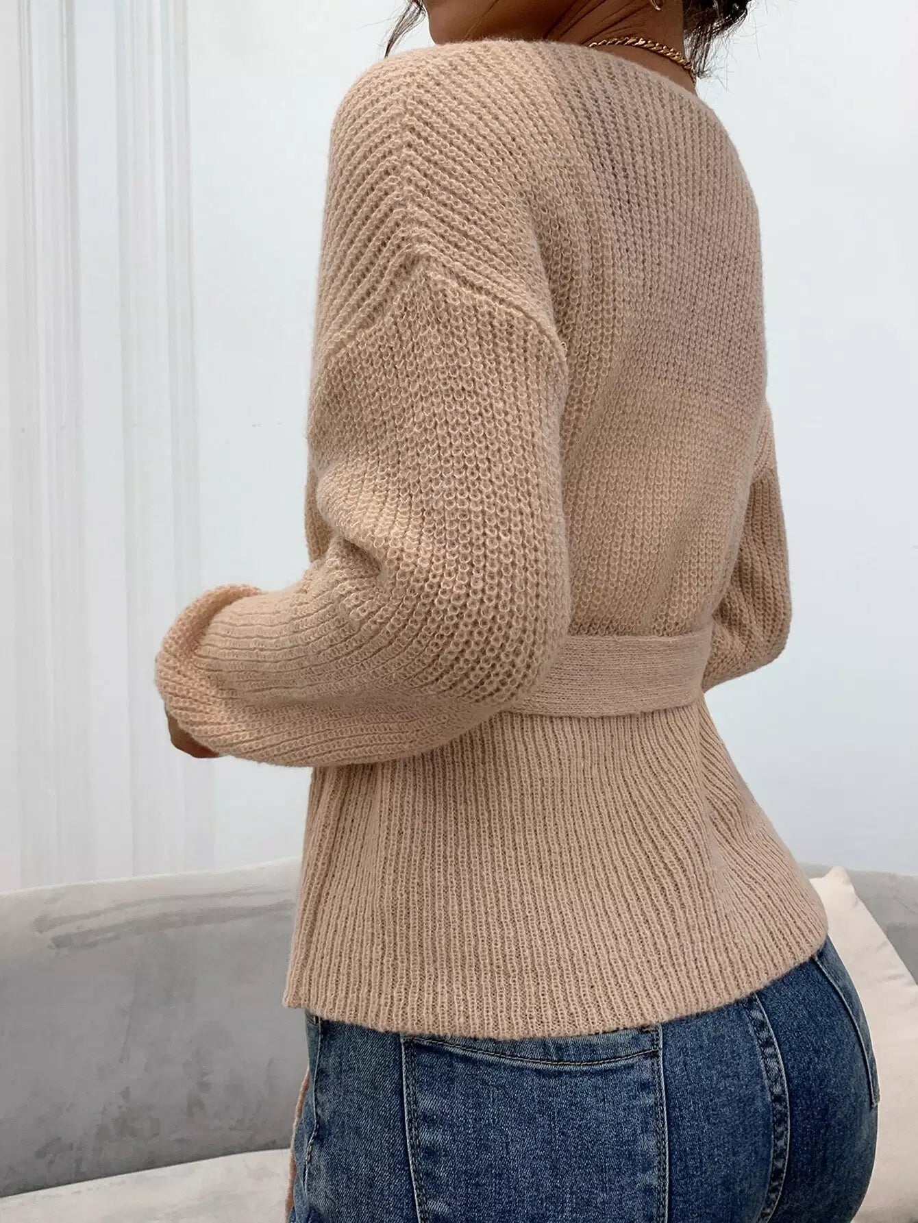 النساء - سترة صوفية بحزام ومتماسكة ومضلعة مزدوجة الصدر