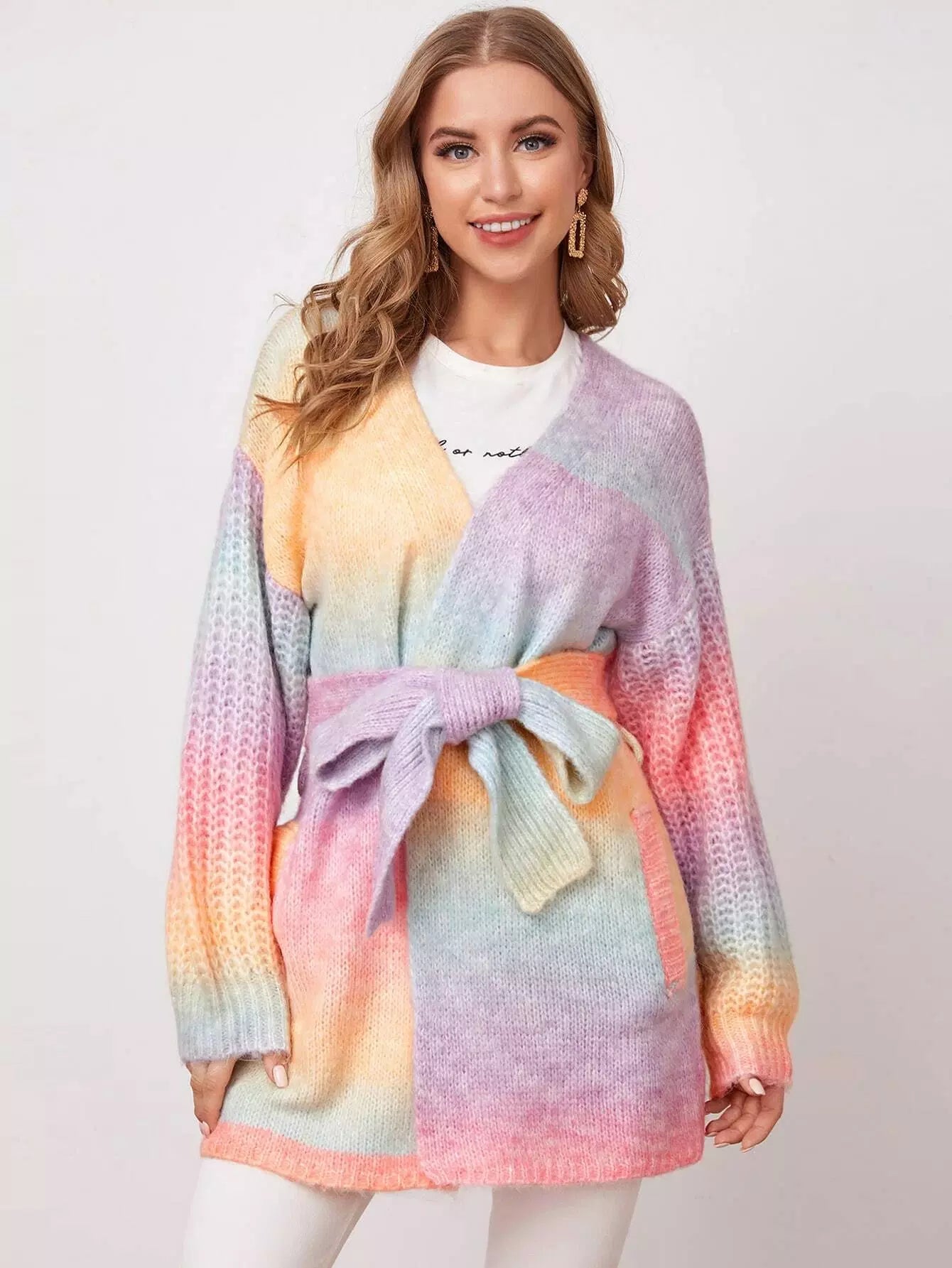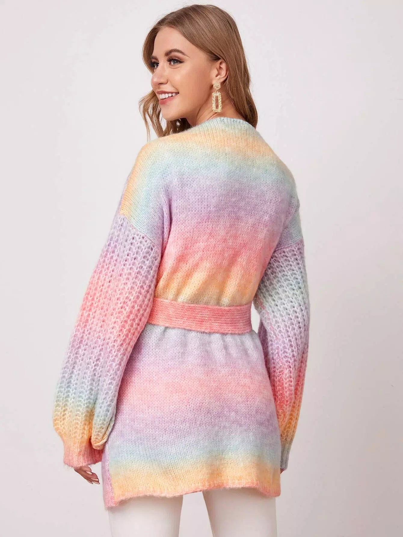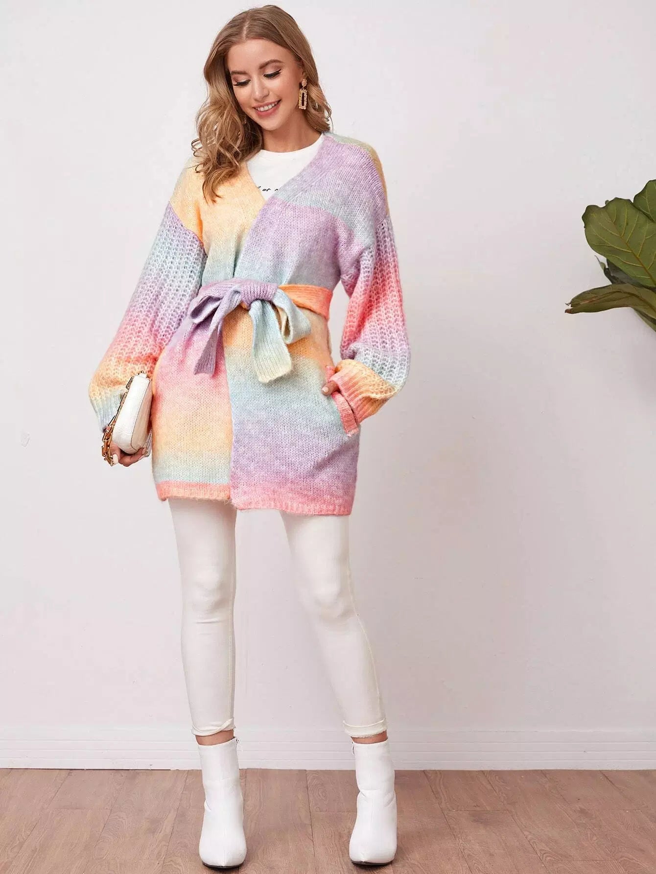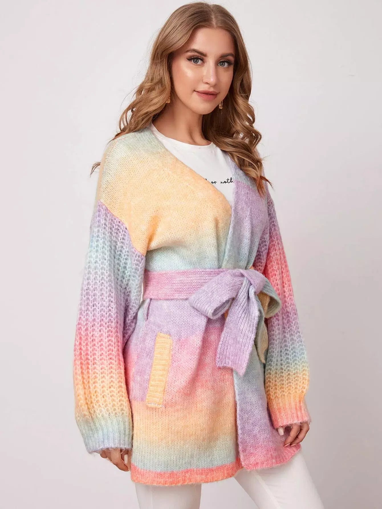 للنساء - سترة صوفية ذات أكتاف منسدلة وجيب مائل وربطة عنق