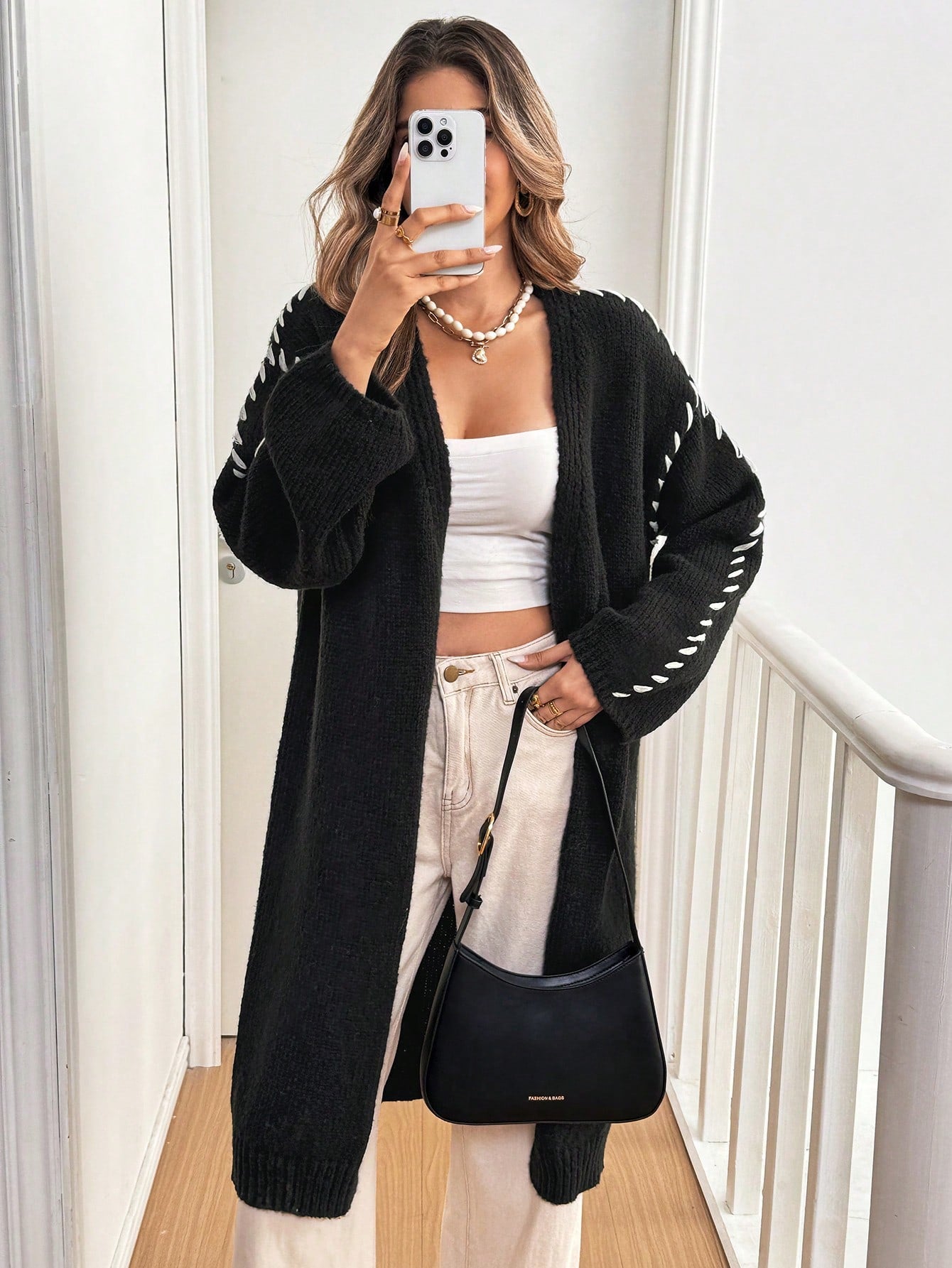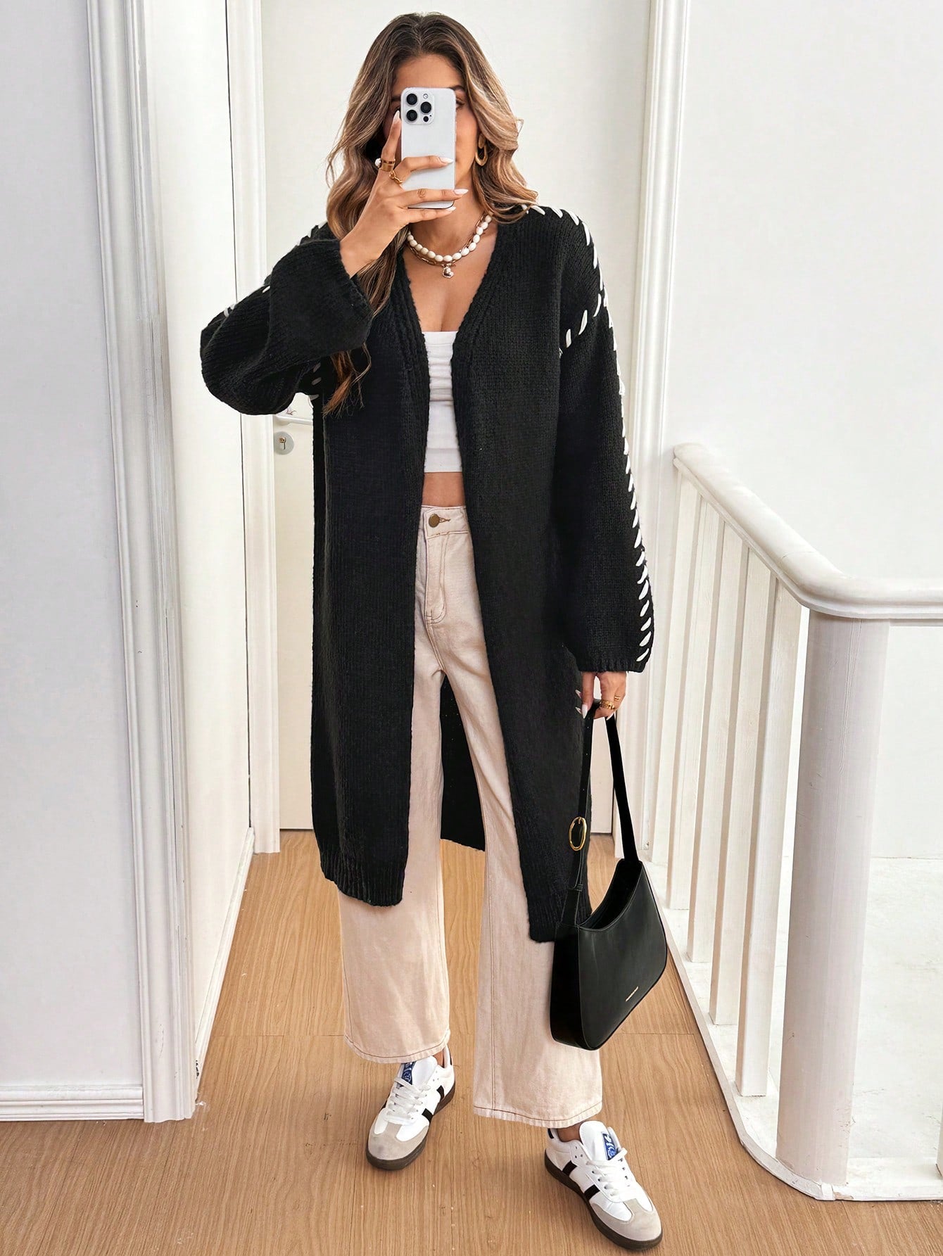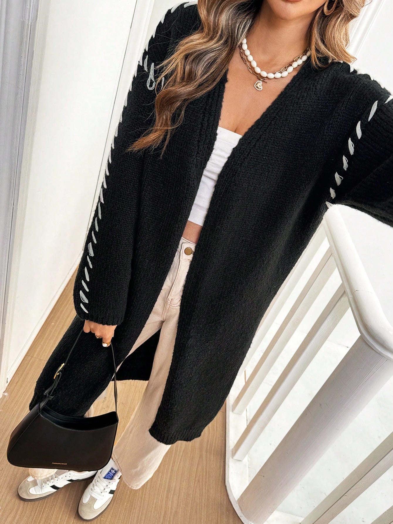 كارديجان فرينشي نسائي خريف/شتاء فضفاض مفتوح من الأمام، لون أسود سادة وأبيض ناصع، طويل